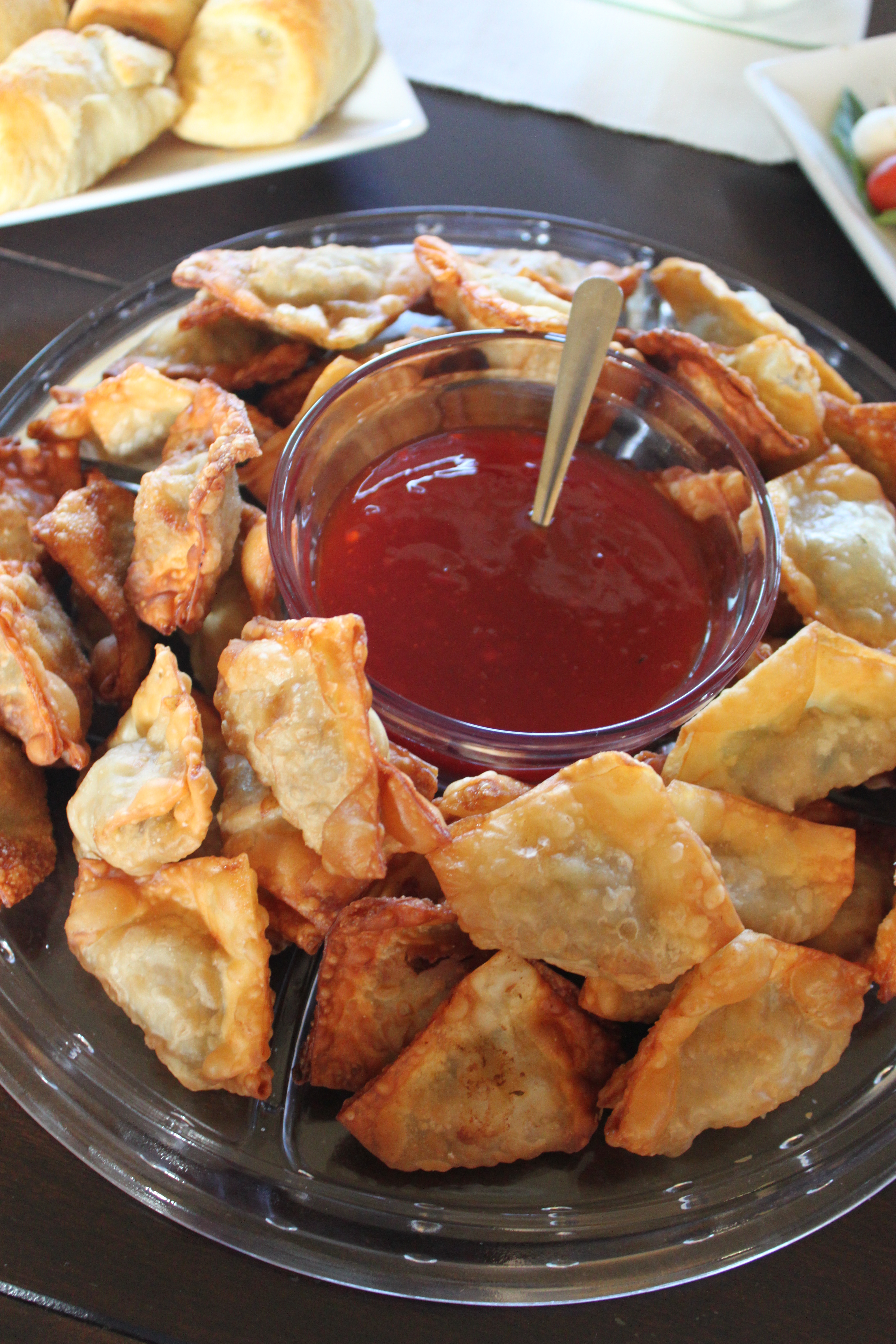 We had a little house warming party on Saturday and I made a few different appetizers and desserts for the party. We especially liked the wontons. I used all pork since I don’t like seafood. They were so good. Our friend Carrie was nice enough bring some cupcakes and a cheesy chip dip.