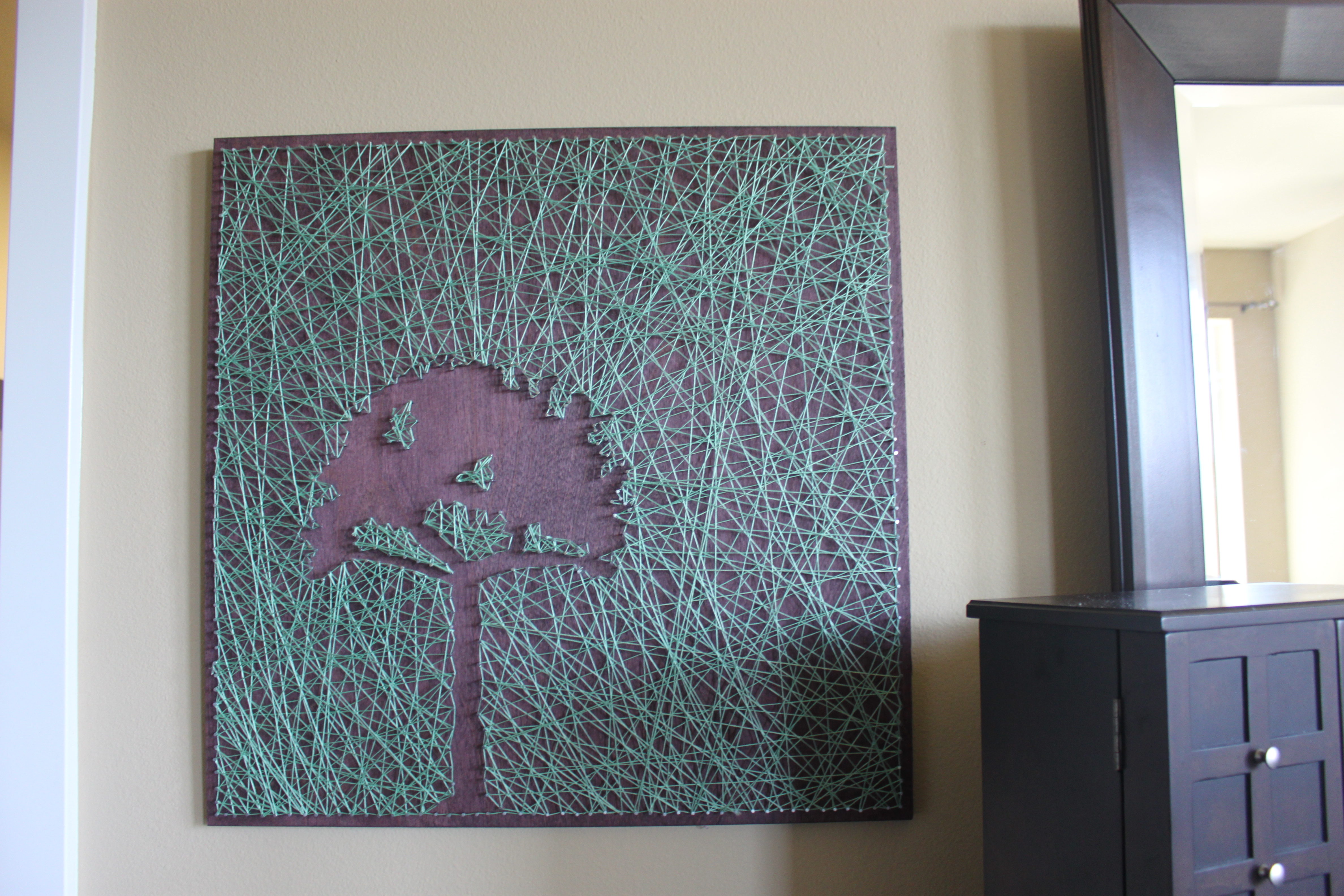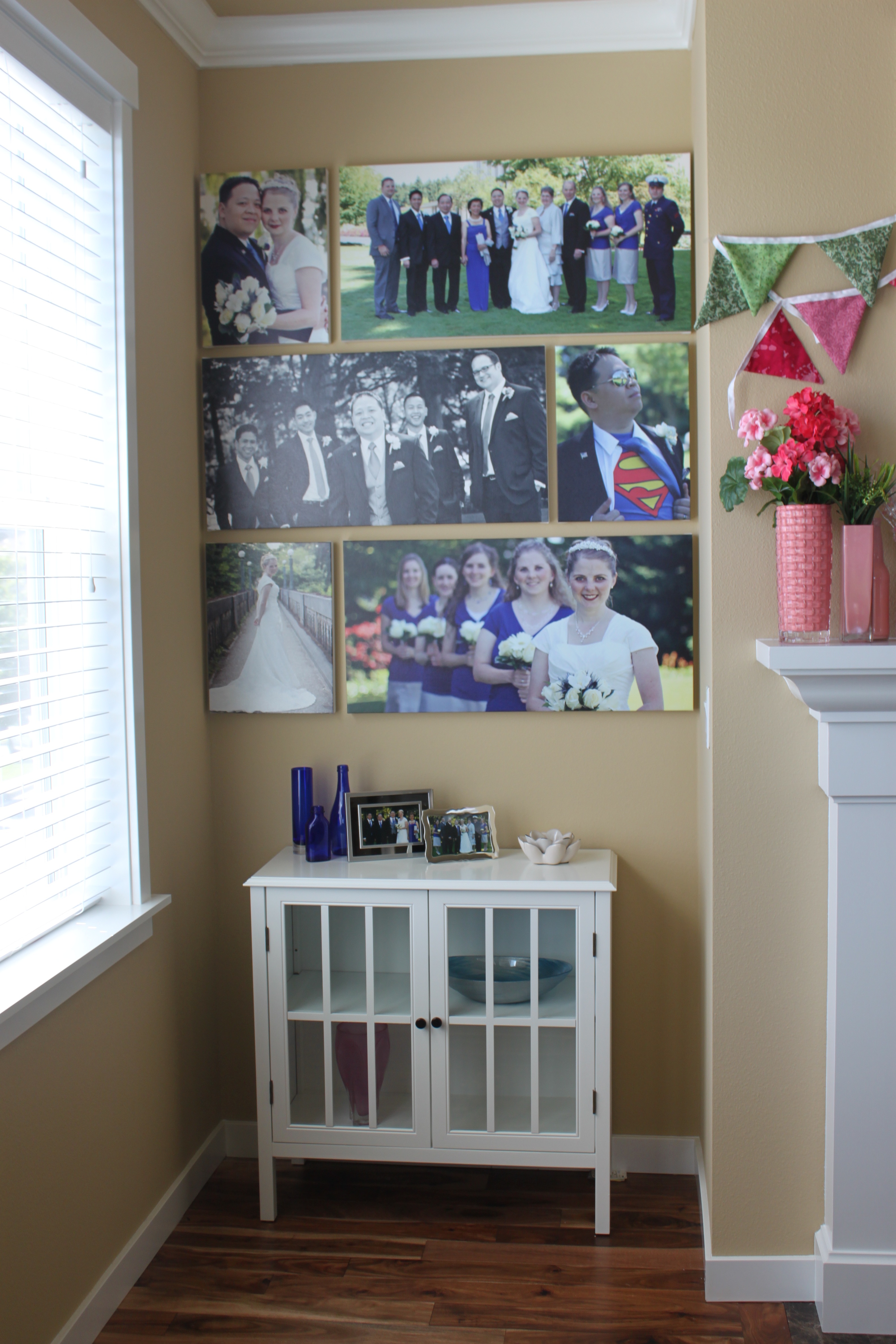 I love the video my church came out with around Easter, “Because of Him”, so I wrote down some of my favorite parts of the text and that is what I used in the quote boards. I cut 3/4″ plywood to 14×14″ and painted them white, then used a stencil to pencil in the letters until I got them where I wanted them to be and then painted it by hand. It would have been faster to use a stencil I could just paint through, but I couldn’t find one with simple letters and that would fit all the text I wanted to get on. It took me about a day to paint it. The “Because of Him” parts are a 1/4″ piece of board that I cut to 13 1/2″ long and glued on after I painted it. The nail board is of Angel Moroni, but I want to make the strings thicker, I just ran out of embroidery thread and haven’t gotten more yet. The bottom middle white piece is 1/4″ plywood that I glued large popsicle sticks to in a herringbone pattern and then painted white and attached a knob to hang something from. The canvas prints I had printed from Costco, their 14×14 gallery wrap.