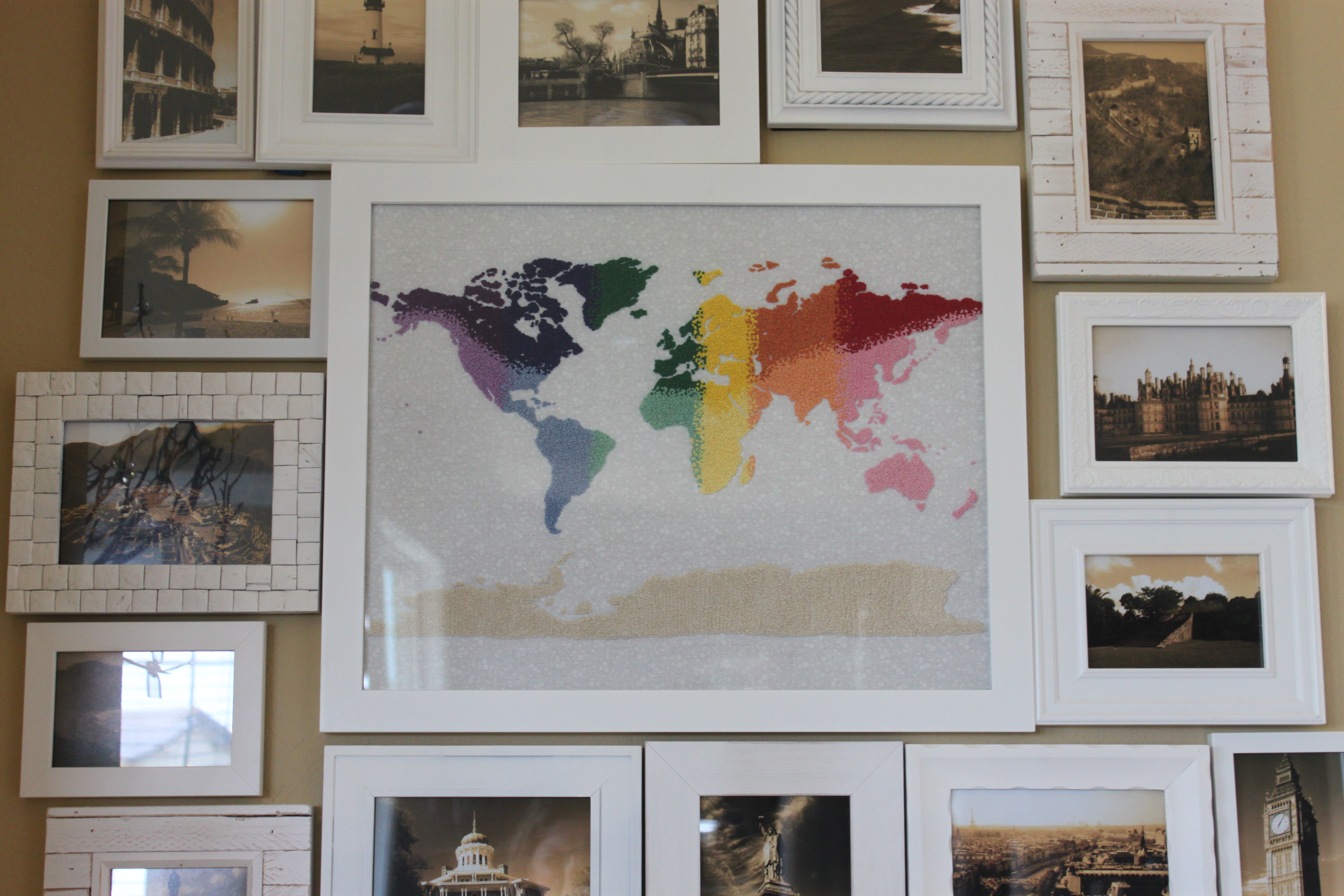 This map in the travel wall is another one of those projects that I maybe took on a bit more than I expected to. I have not done very much embroidery before, besides the couple of random cross stich samplers as a kid, and I decided I wanted to get into it. I saw a few things on Pinterest that used a bunch of French knots and thought it would be fun to make a map out of French knots as the centerpiece for this travel wall that I wanted to make. After finishing the purple section I calculated how long it took me and how much more I had to do. It was a little bit daunting. Just one more example of how I make things way more intense than normal people do. It took me the whole month of March to complete. But I love it and I love seeing all my pictures of the places I have been.