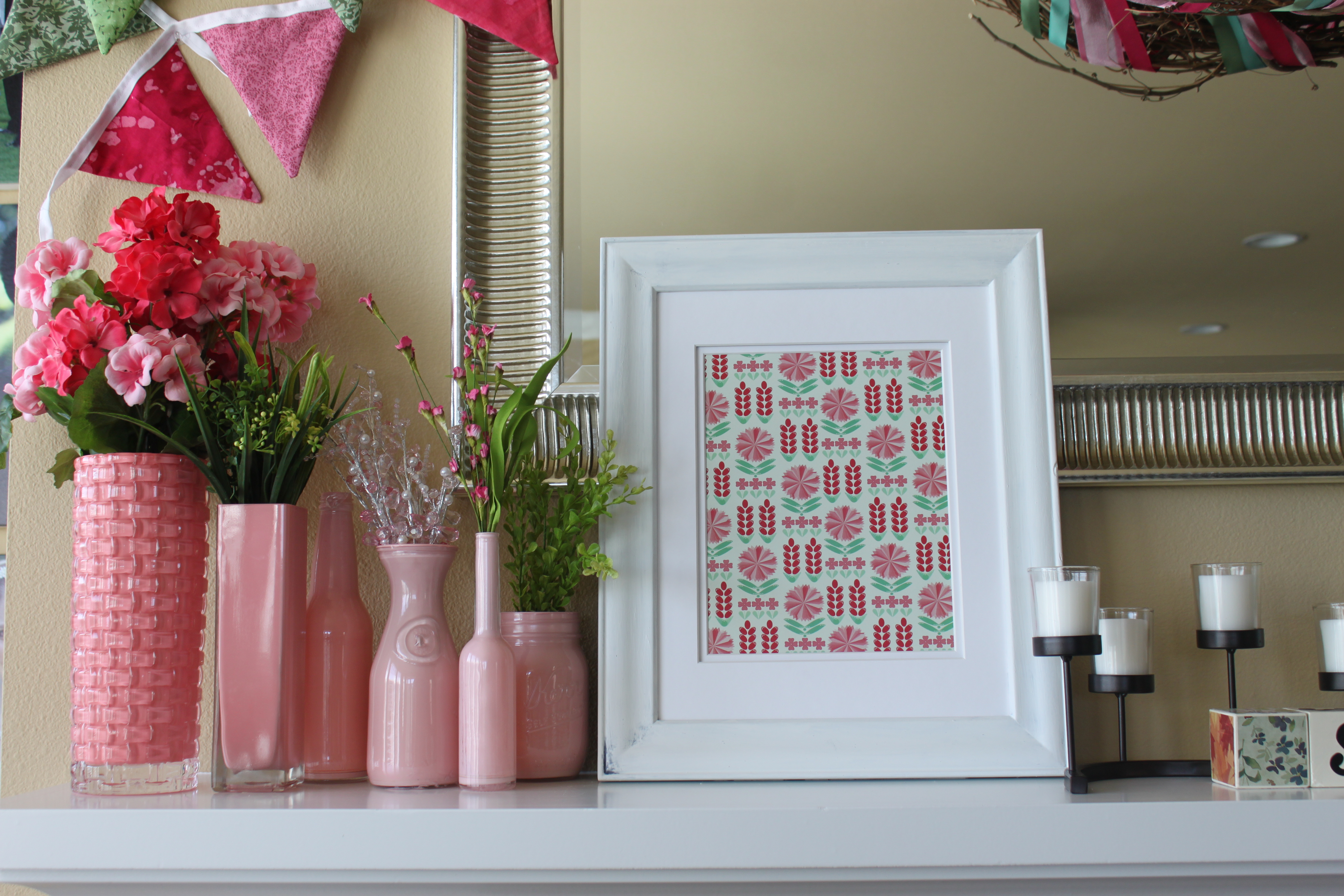 I painted clear vases and bottles with lettering enamel paint. I had a hard time finding this paint. I called every craft store in the area and no one carried it. I ended up ordering it from Amazon. I used the aqua, salmon and white and then mixed the white in with the other two colors to get the ombre for each bottle. This paint is so great do this with. It doesn’t have to be baked, it is nice and runny so you can just twist the bottle around to coat it, and then when it dries it is still waterproof so if I wanted to put real flowers in I can. I tried some other enamel paints from different crafts stores and they didn’t work at all. The little bead/ribbon blossoms on the branches I made from pulling apart a bead garland I got on clearance from Michael’s and used the wire to twist them into flowers. I designed the floral graphic in Illustrator.