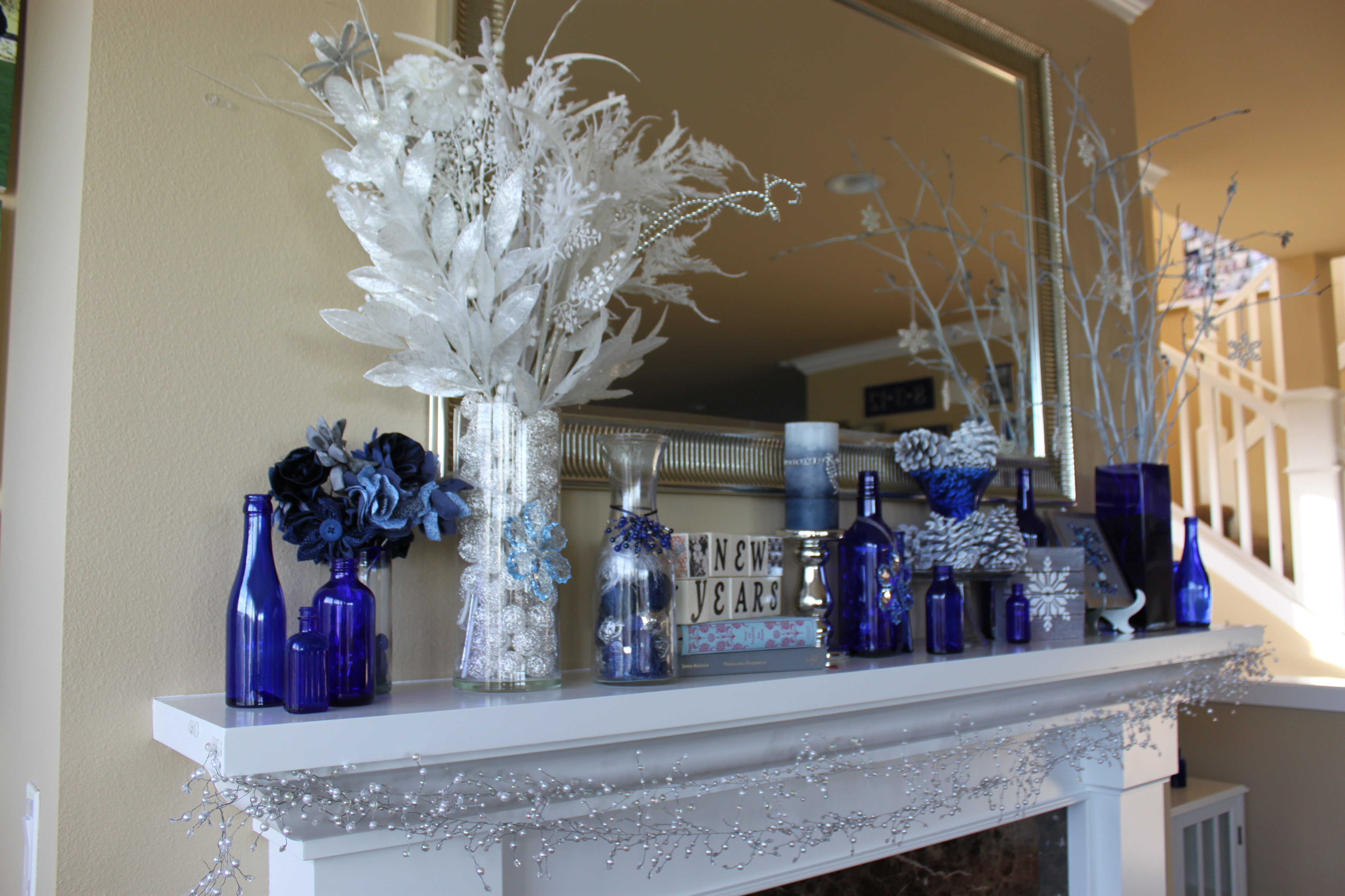 So after the busy-ness of Christmas died down (and I got my energy back after having the flu/pneumonia, which I didn’t give to any of our house guests we had the whole time I was sick thank you very much), I started to think about January. I was discussing it with my sister Rachel, and decided I wanted to do a Winter theme. I already had some items from a blue and silver mantle I made a few years ago, and I think blue and silver are nice winter colors so I decided to start with that and then just add in some snowflakes to make it more “winter”.
