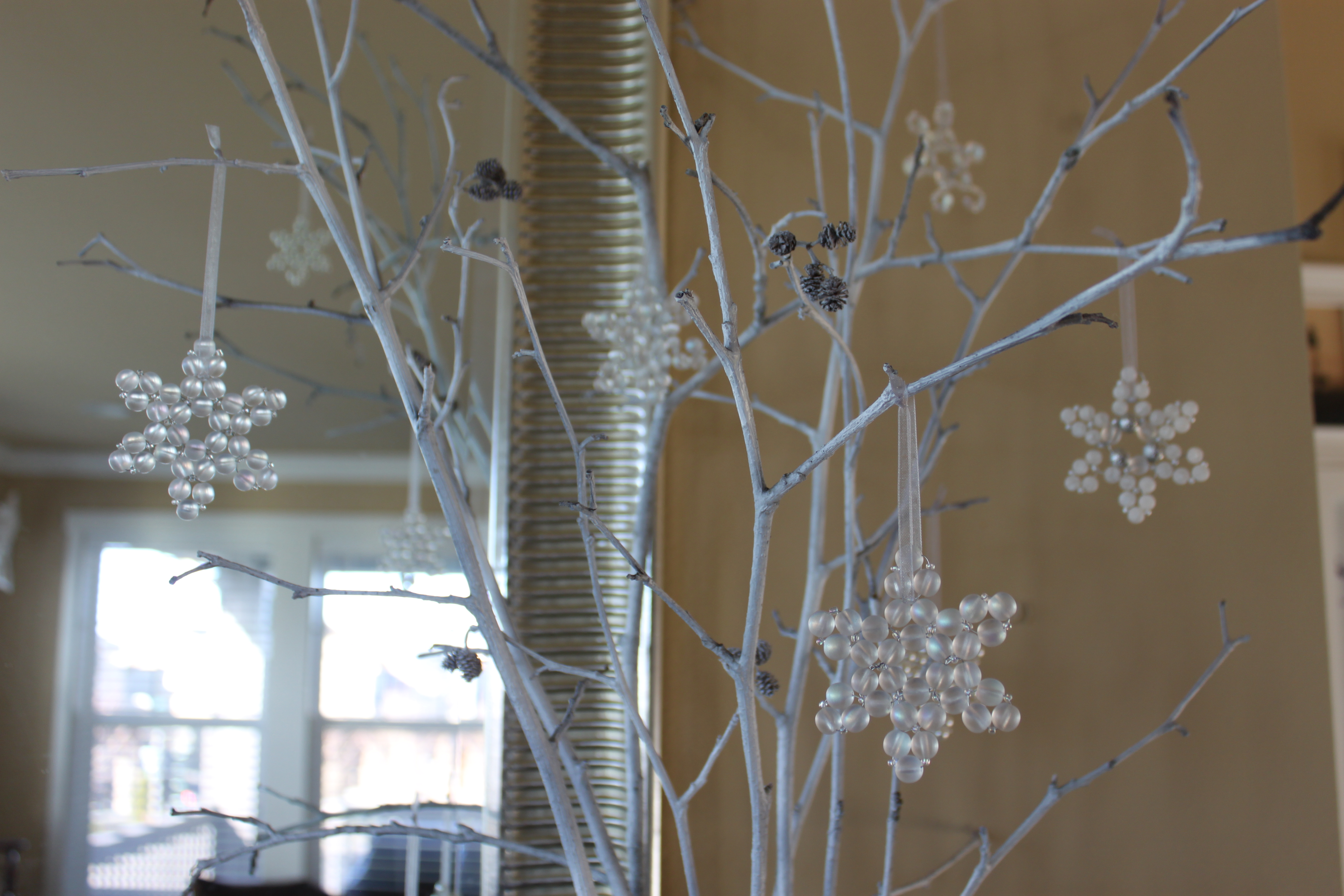 I had some pine cones I didn’t end up using for Christmas, so I spray painted them mostly white. I took a walk along the path through the greenbelt down the street from our house and picked up some branches off of the ground and also spray painted them white. They even had some cute tiny pine cones hanging off their branches. Then I made some beaded snowflake ornaments (thanks Pinterest) to hang from the branches.