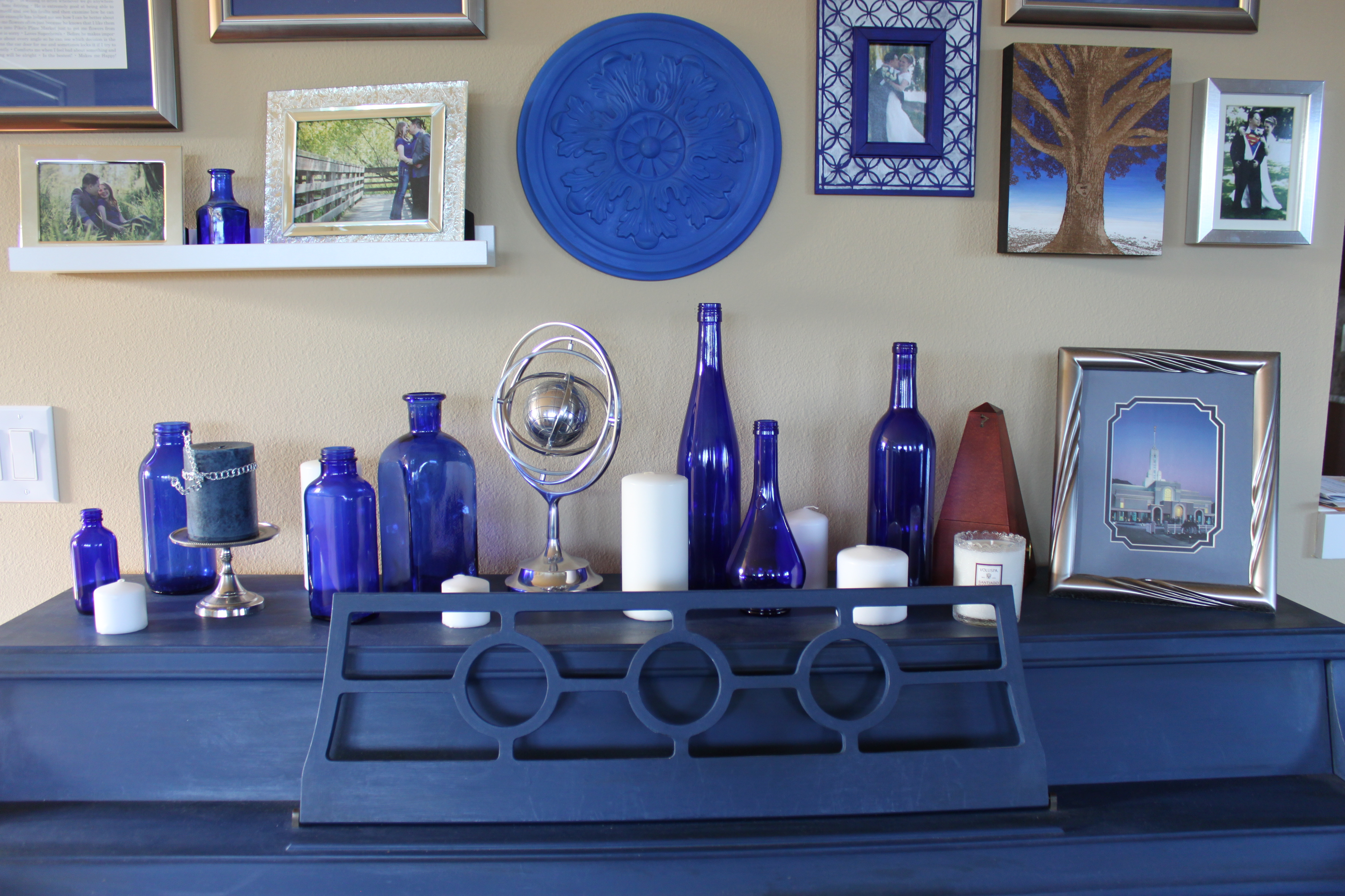So after the busy-ness of Christmas died down (and I got my energy back after having the flu/pneumonia, which I didn’t give to any of our house guests we had the whole time I was sick thank you very much), I started to think about January. I was discussing it with my sister Rachel, and decided I wanted to do a Winter theme. I already had some items from a blue and silver mantle I made a few years ago, and I think blue and silver are nice winter colors so I decided to start with that and then just add in some snowflakes to make it more “winter”.