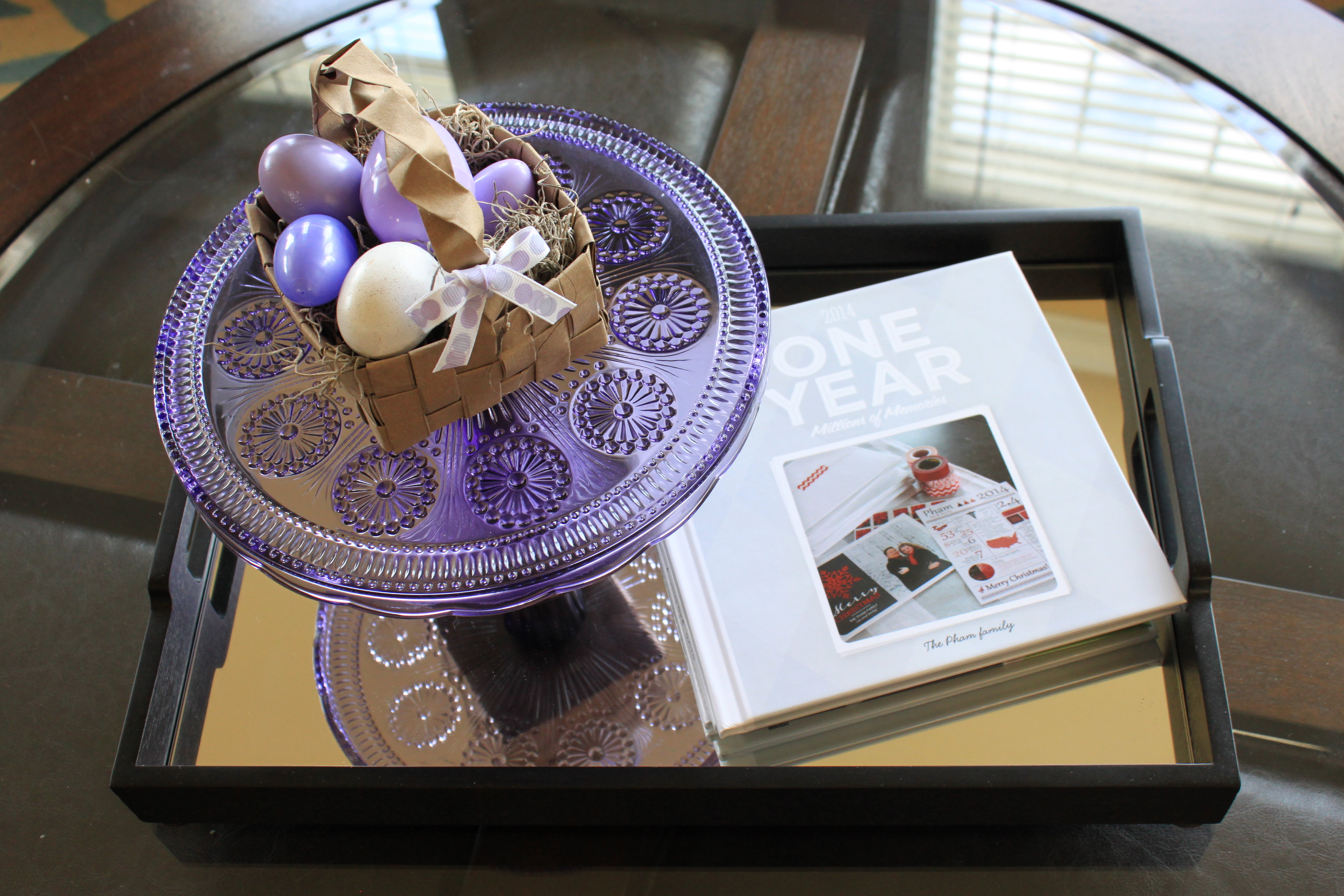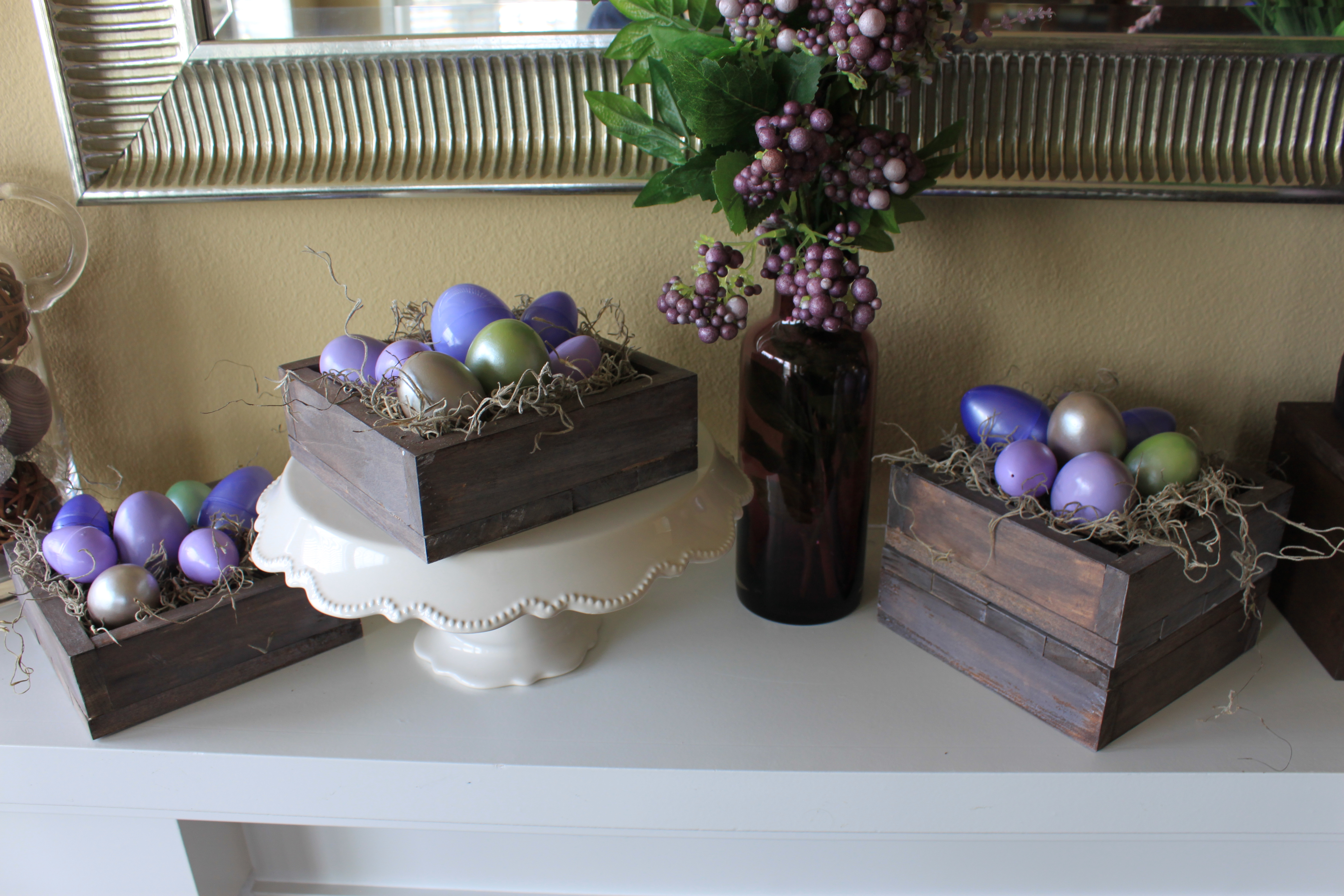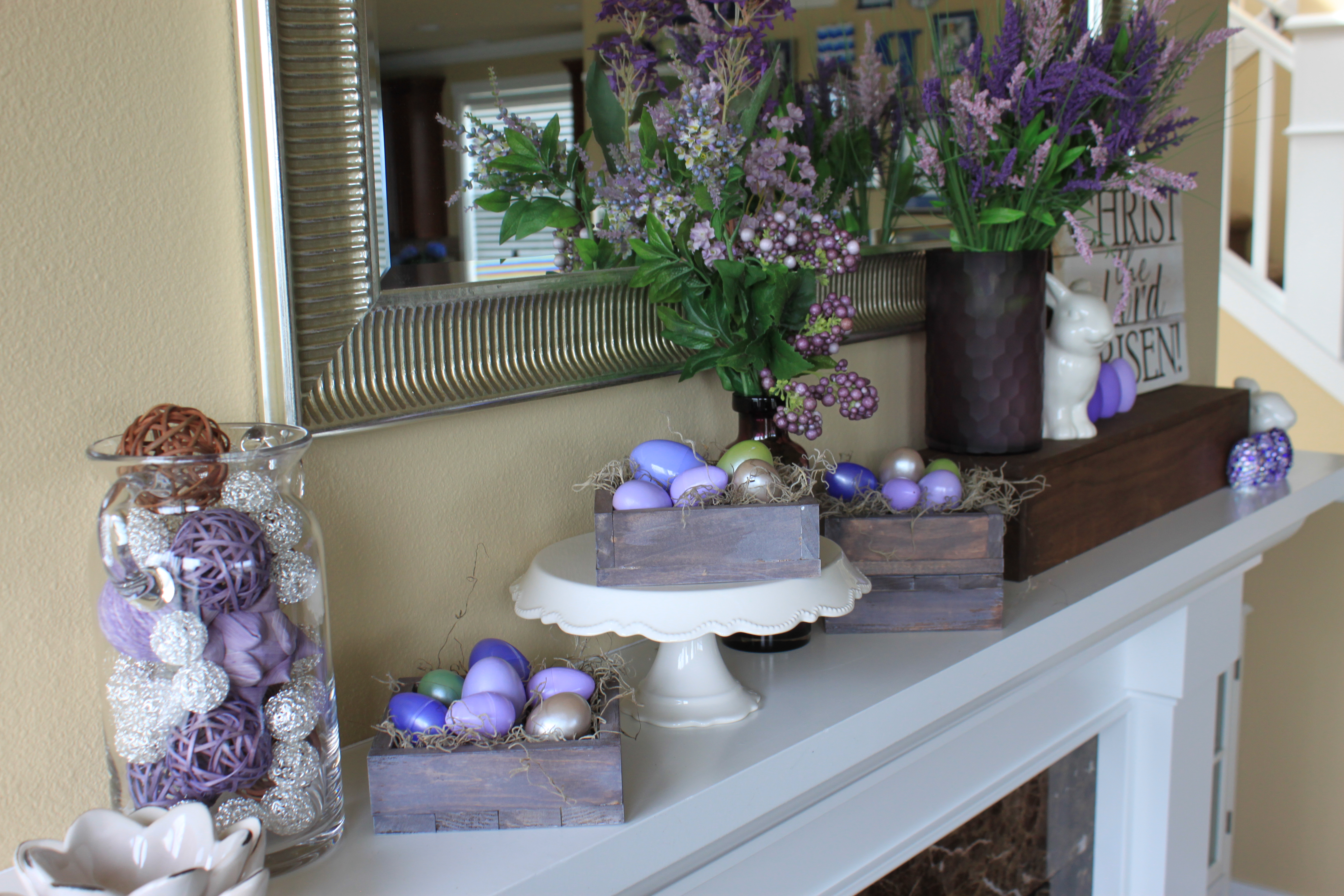 I made 3 of the rhinestone eggs last year. I used a tutorial I found on Martha Stewart, but I can not find the post anywhere now. Here is the picture from my Pinterest board. I basically just glued the rhinestones onto a wooden egg. I made three more this year too. Last year I also painted 3 of the same wooden eggs in ombre purple. I was trying to decide what to do with them and Vu suggested the ombre paint. There is his contribution to the décor. 🙂 He was/is very proud of himself for that one.