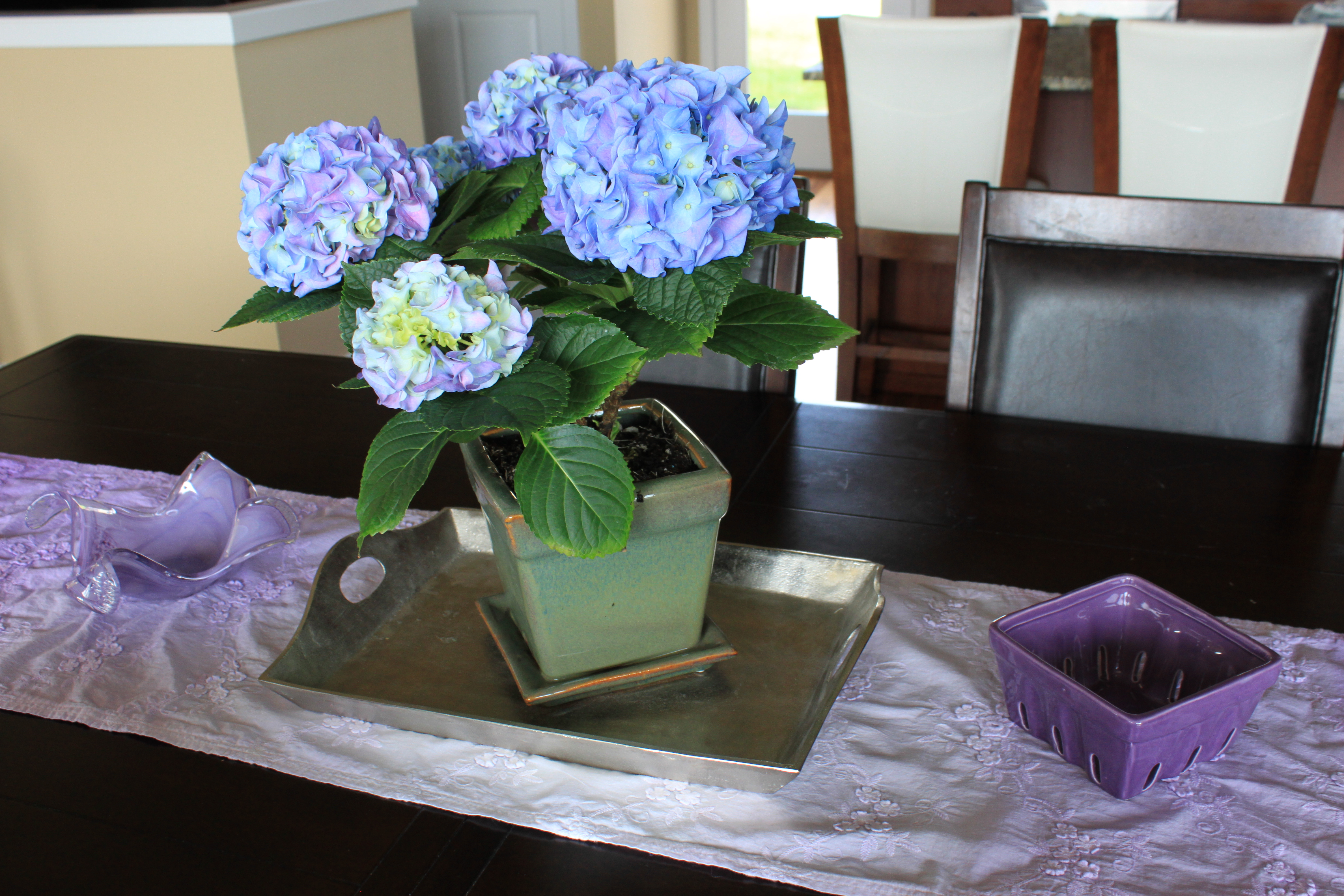 The table runner I also made for our birthday party a few years ago. I bought some white floral fabric from Joann’s, cut and hemmed it, then dip dyed it ombre. The Hydrangea’s I bought at the grocery store one day and they looked much more purple in the store. Once I put them next to the rest of the purple on the table, I noticed how much blue they have in them… still love Hydrangea’s though. And I love that it is potted so it will stay alive…longer. I won’t go so far as to say it will stay alive indefinitely, I don’t have the greenest thumb. But I can hope.