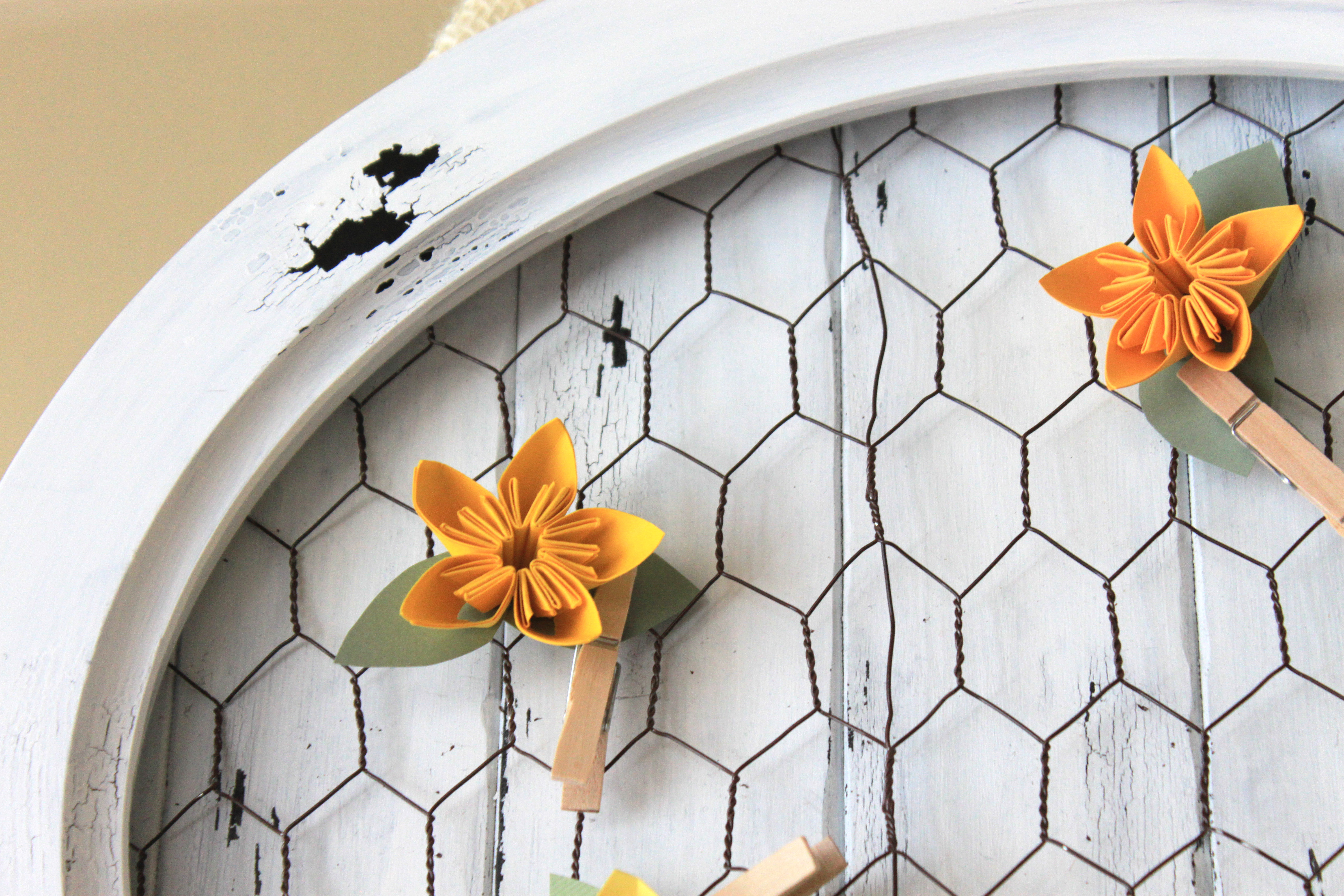 I made the “wreath” from an oval frame, chicken wire and wood. I really wanted to find a circular wood picture frame, and I looked everywhere but couldn’t find anything. This one is plastic. I cut the wood to the same shape and size as the frame, then stained and painted the wood and frame, had a friend use his staple gun to attach the chicken wire to the wood and then glued a few small popsicle sticks to the edges in between the wire and glued the frame to the popsicle sticks. I used the same Vaseline trick before painting to get the aged cracked look that I used on the shelves for March. Then I made some little paper flowers and attached them to the wire with some small cloths pins.