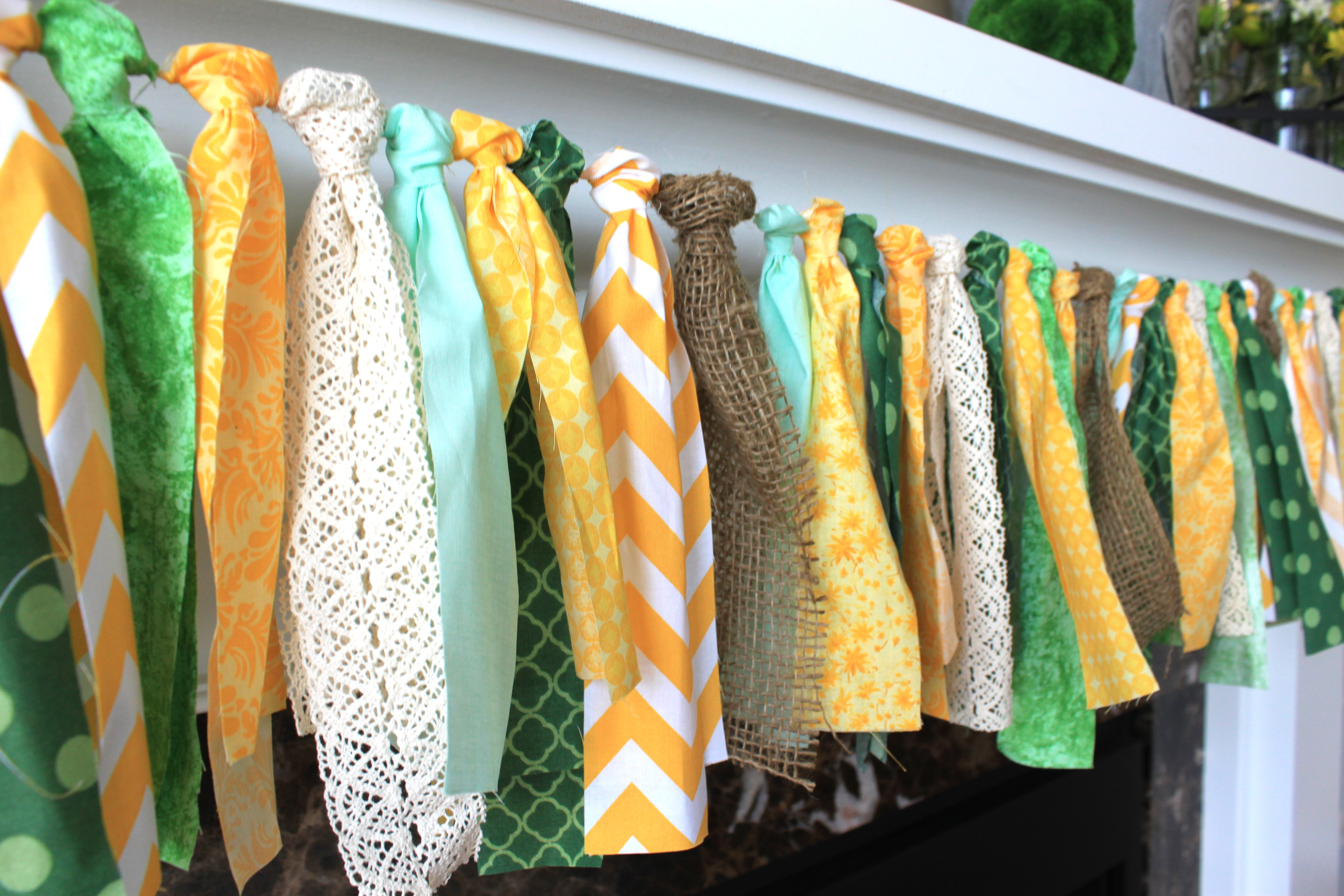 For the rag garland I used a few fat quarters, and a few other cuts of fabric that I liked, some ribbon lace and burlap. I cut a bunch of pieces 2″ wide and the length of the short side of the fat quarter, 20″ I think. Then I tied them onto some twine and hung it up.