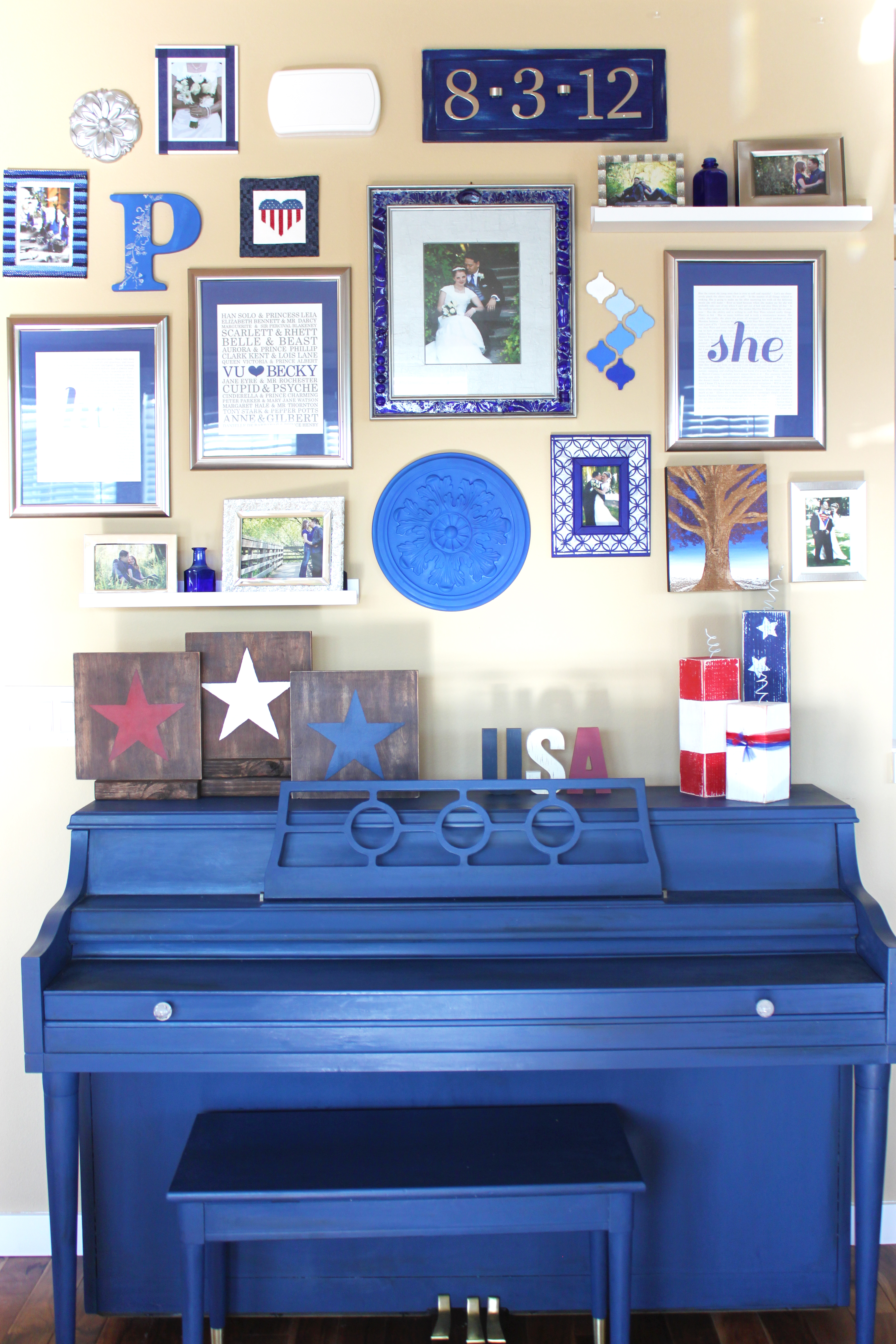 I replaced the small chevron canvas in the gallery wall with the flag/heart cross stich sampler I made when I was young, since they are the same size. The USA letters in the middle of the piano were from the dollar section at Target, even though they were $3, not $1.