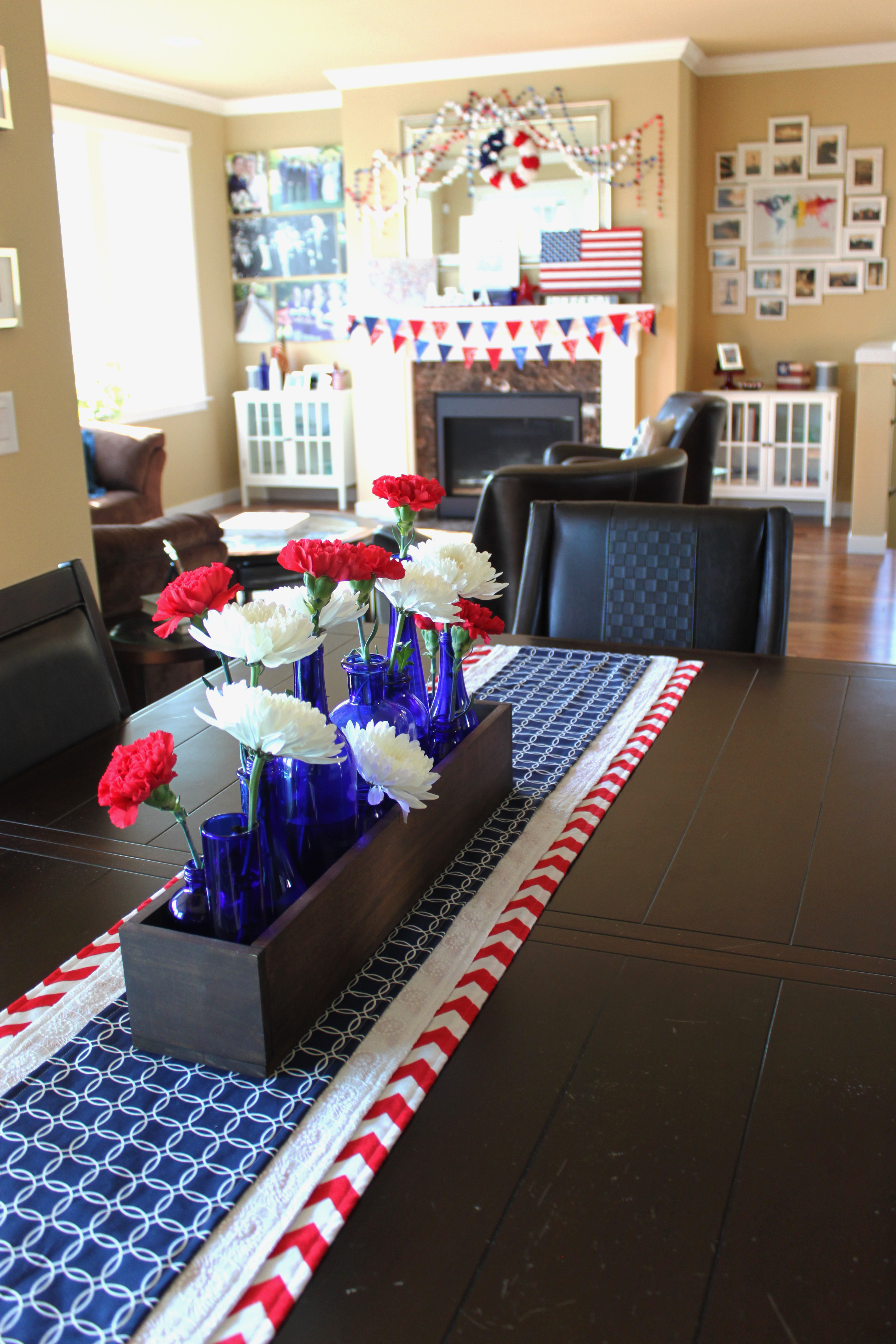 Using the same fabric as the pillows, plus a white fabric, I sewed some layered table runners. This white fabric is found with the eyelet fabrics, but it doesn’t have any holes so I am not sure if that is what it is called or not. I love the layered look of the 3 different runners. I used the wood trough box and filled it with an assortment of cobalt bottles and vases and put red and white flowers in them.