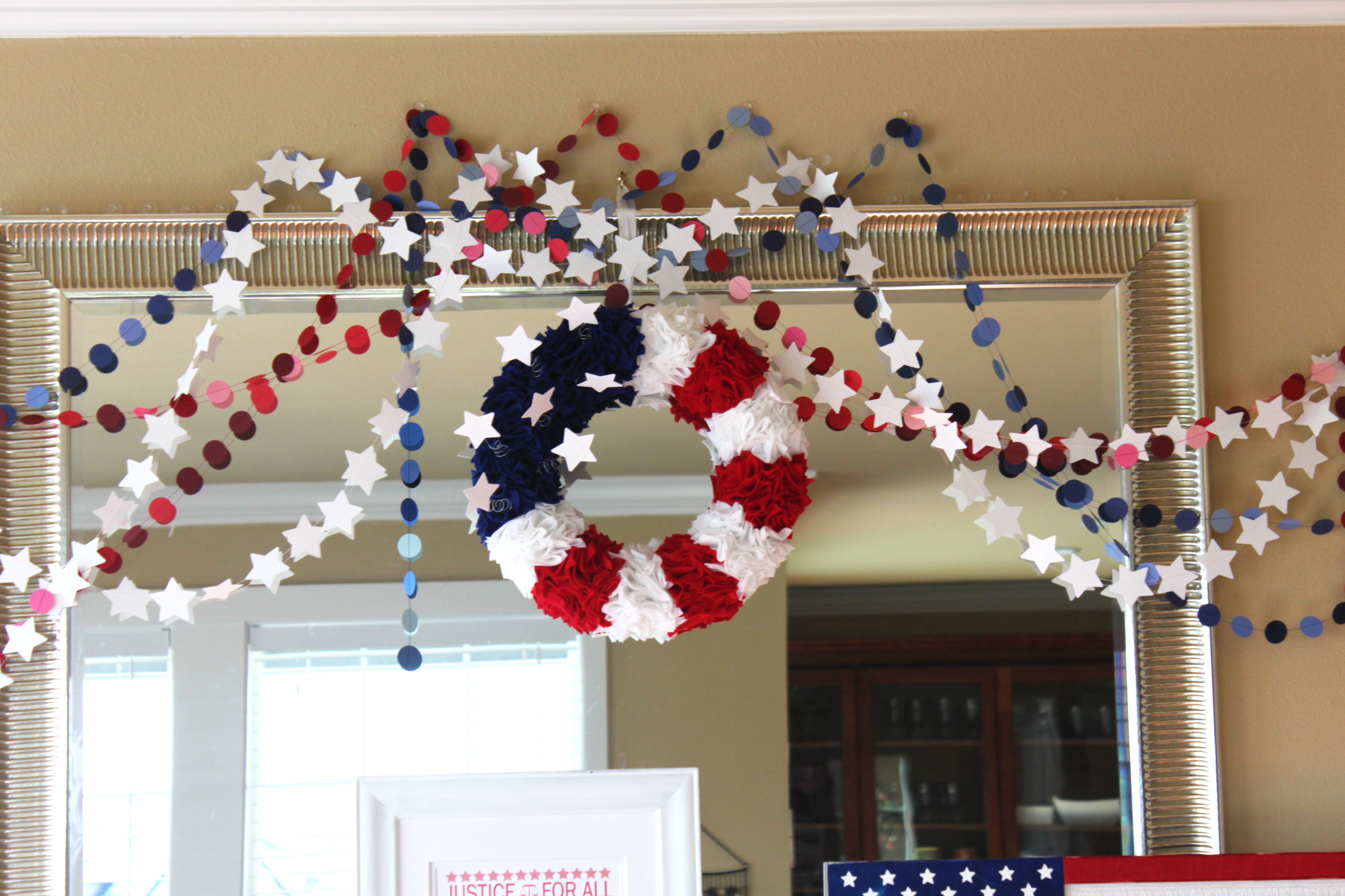 The fabric triangle garland and the sewn red and blue circle garlands I made a few years ago for a birthday party for Vu. His birthday is July 2, so it was Americana themed. The star garland was from Vu’s graduation party. The wreath is made out of foam and felt squares. My friend Jeanette and I made them last summer using this tutorial. But she said hers fell off the door just a couple of weeks after she made it and sadly it shattered.