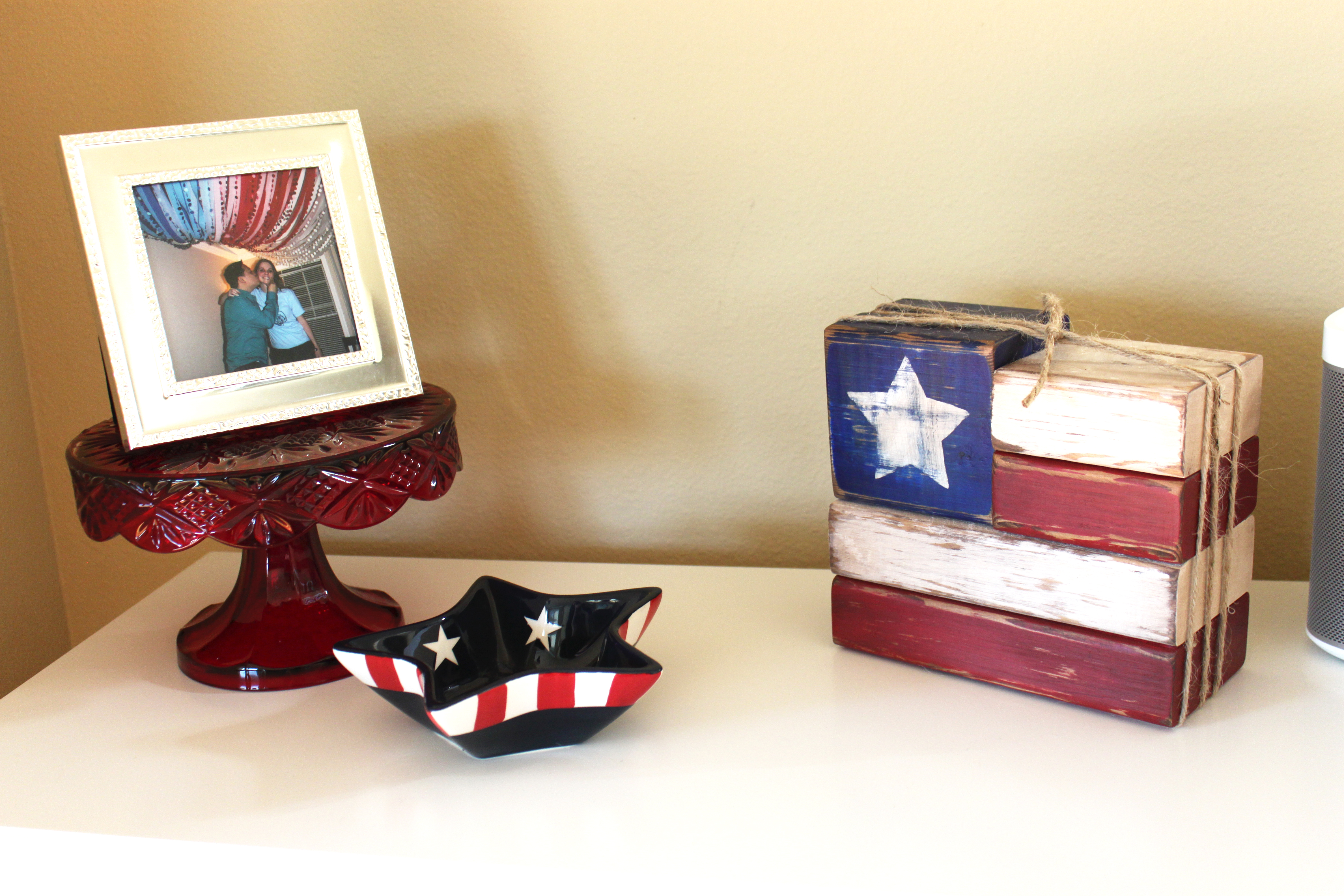The coffee table was the last thing I did, because I had a hard time thinking of something I wanted to do. I ended up using the white box from the succulent planters from June and filled them in a flag shape with red, white and blue vase filler pebbles.