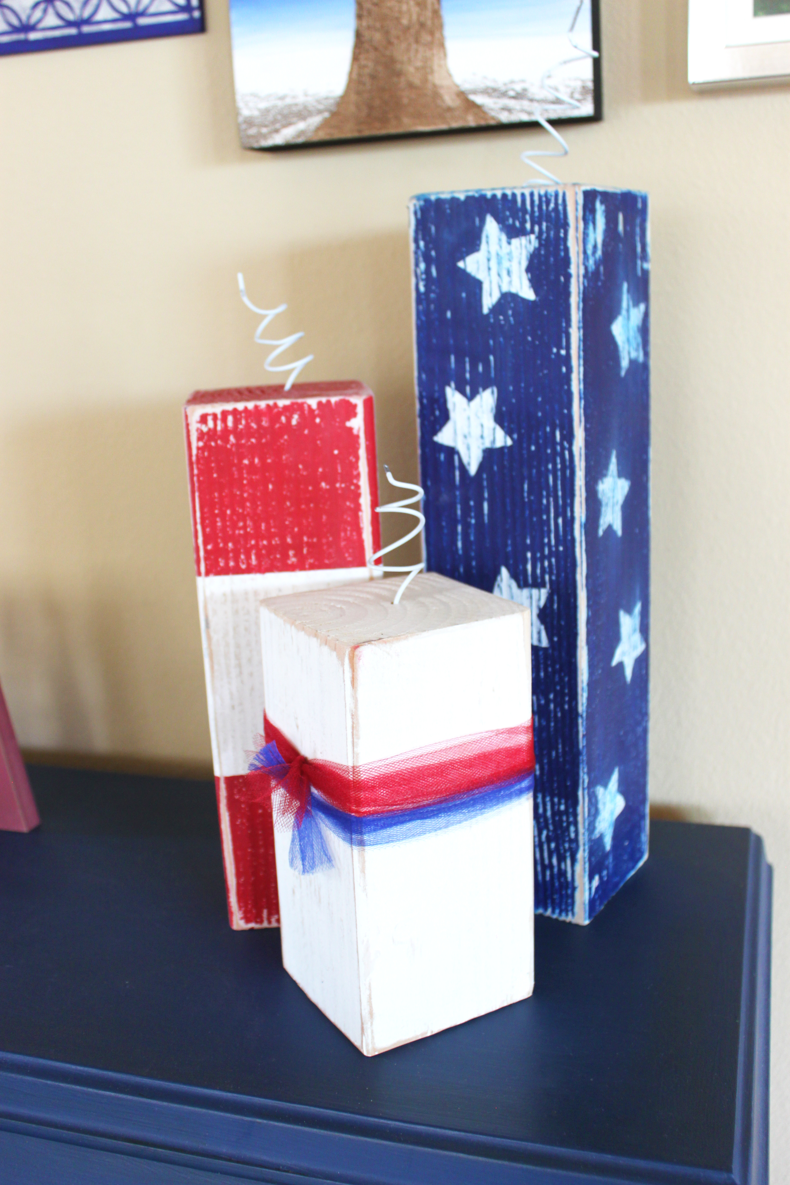 The firecrackers I made at a craft night this month that my friend Misty hosted, that was really fun. They are cut out of a 4×4 and we painted and distressed them, then I wrapped some red and blue tulle around the white one when I got home.