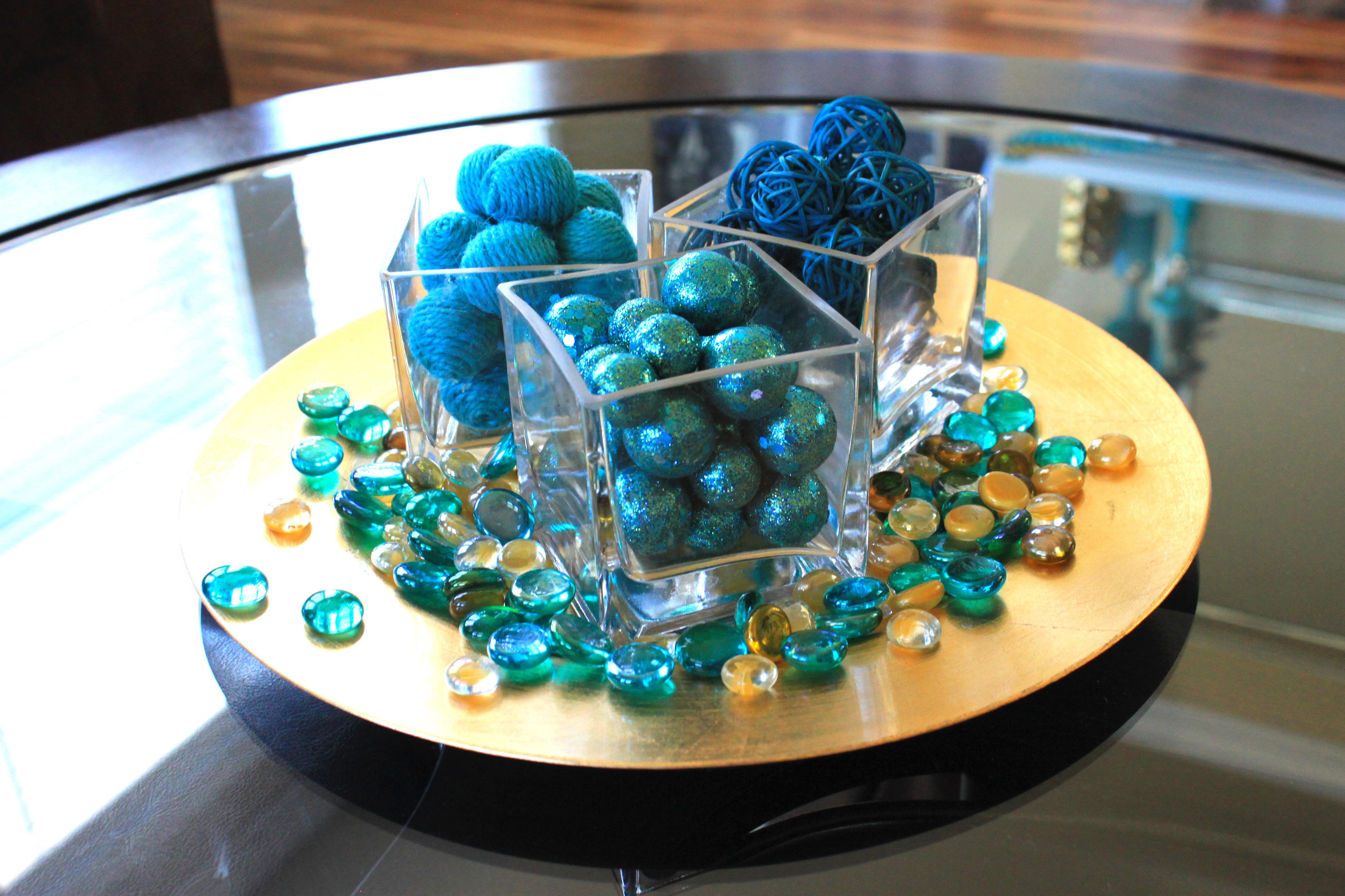 On the coffee table I filled some of the small square vases with different turquoise filler balls, and placed them on a plastic gold plate. I like that they form a triangle in the center, adding to the geometric patterns.