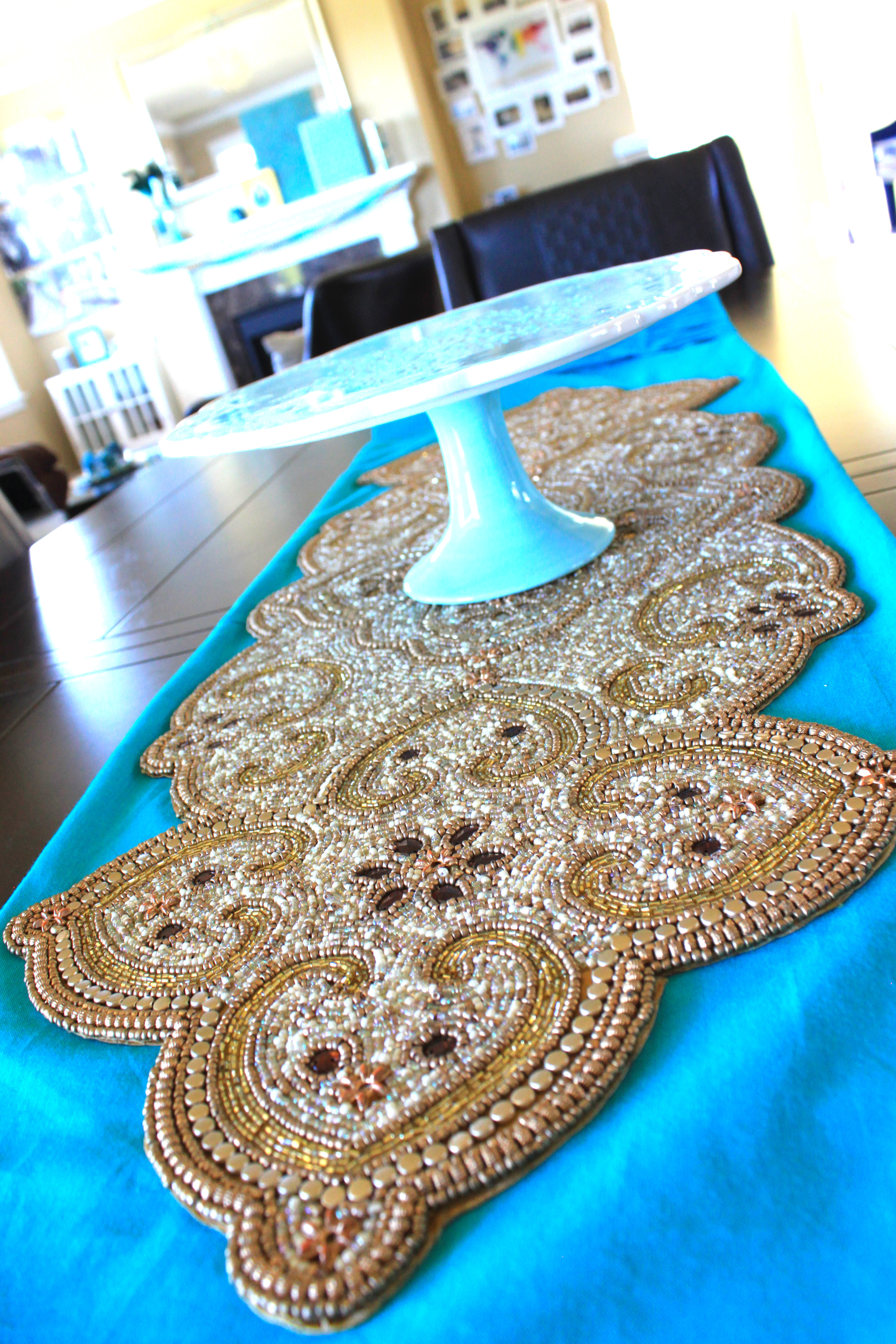 This gold beaded table runner is from Pier 1 and was actually the catalyst for the peacock theme, despite it not having anything peacock about it. They had it on their display table and everything else on the table was peacock themed, but it was just this that I really wanted. The cake plates are also from Pier 1. The turquoise table runner is one of those projects that the result was worse than the vision. I really don’t like how it turned out, so next year I am going to do something different. I finished it the day after I put everything else out and by then it was too late to change it. I was going to make a second pillow case with the same design, but since it didn’t turn out how I wanted it to, I decided against it and will make the pillow next year when I figure what to do about the runner.