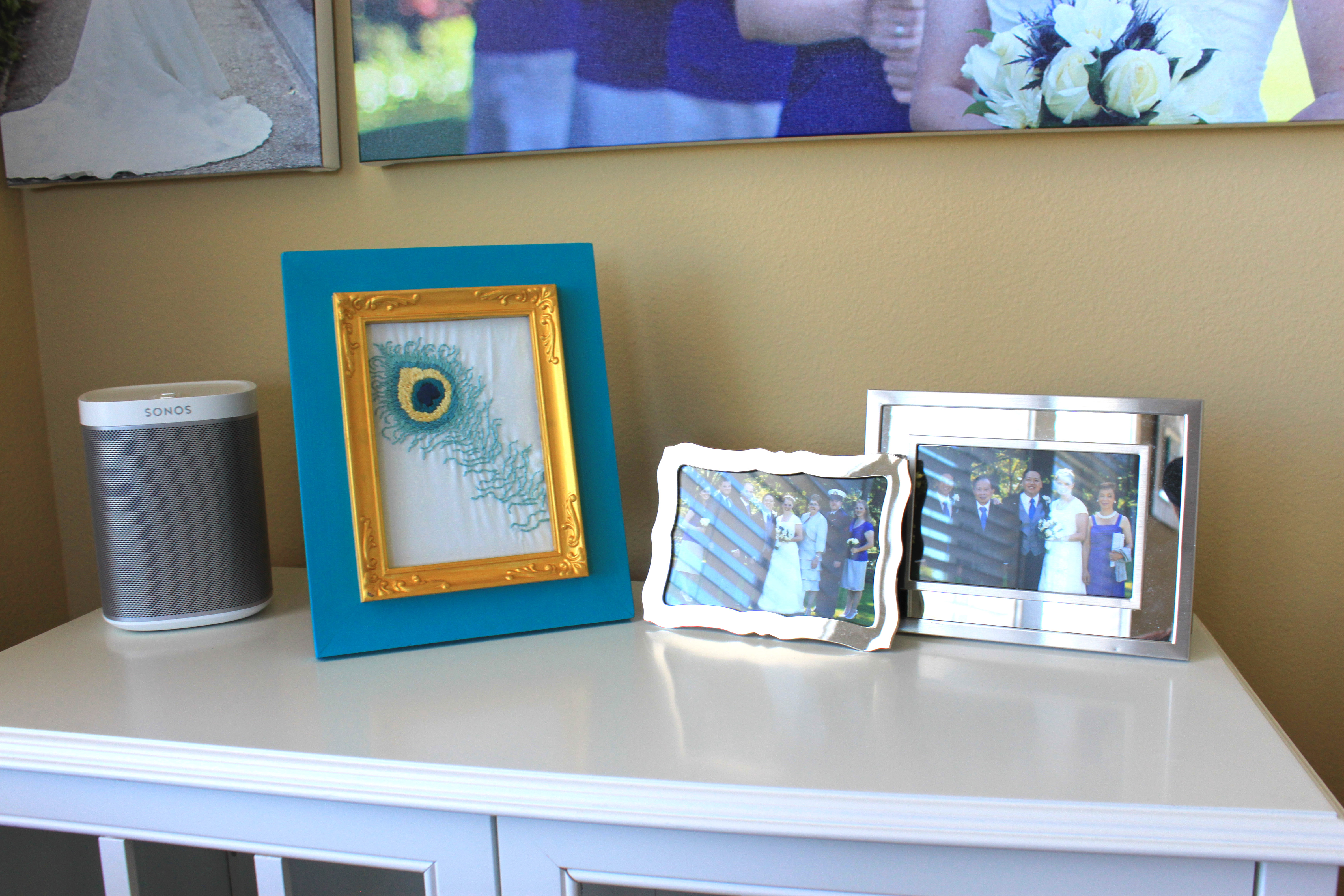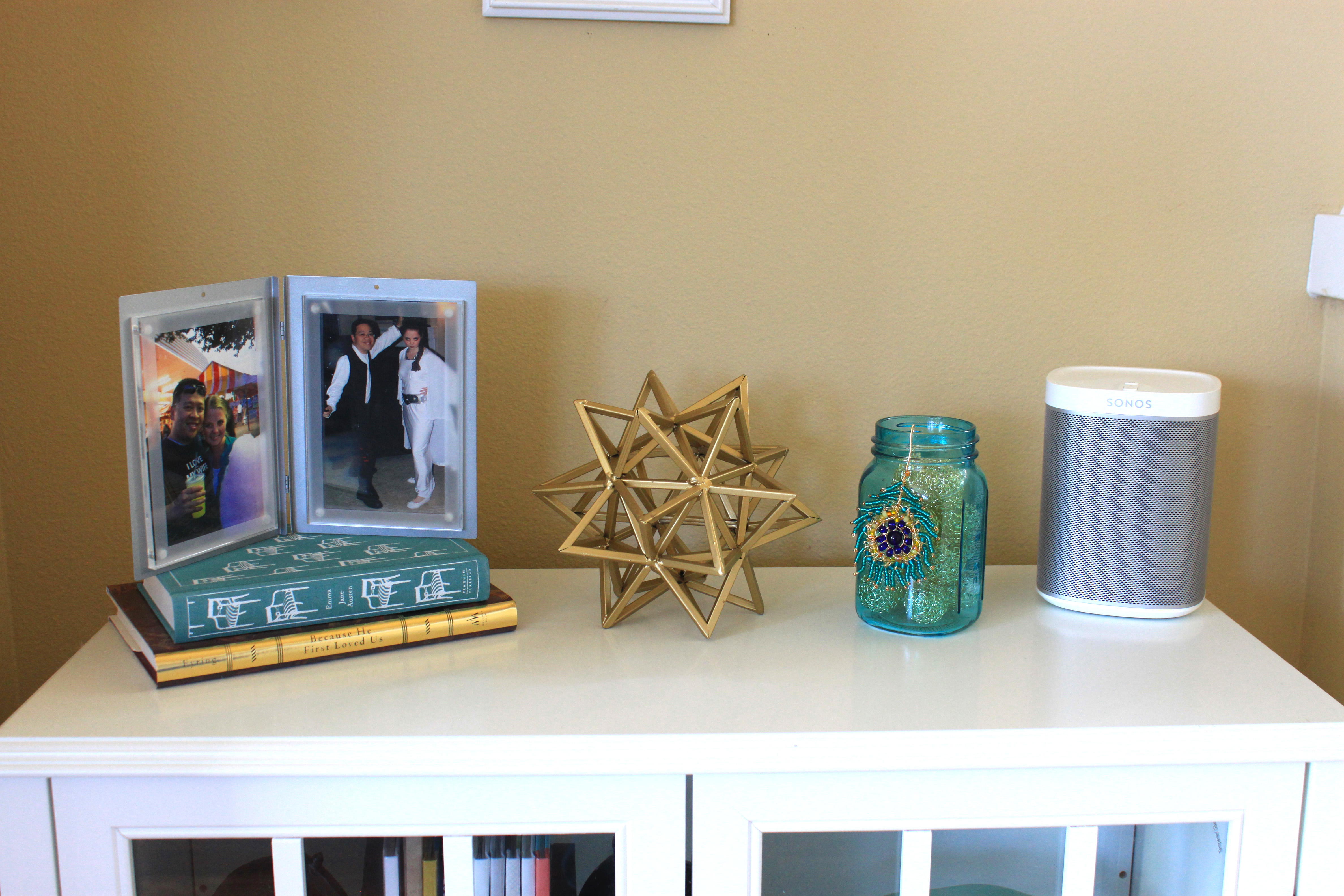 I found this metal triangle star accent at Hobby Lobby and loved it. Then grabbed a couple of gold and turquoise books from my bookshelves to add underneath the pictures. The turquoise mason jar I found at an antique store and filled with some gold metal filler balls from Michael’s.