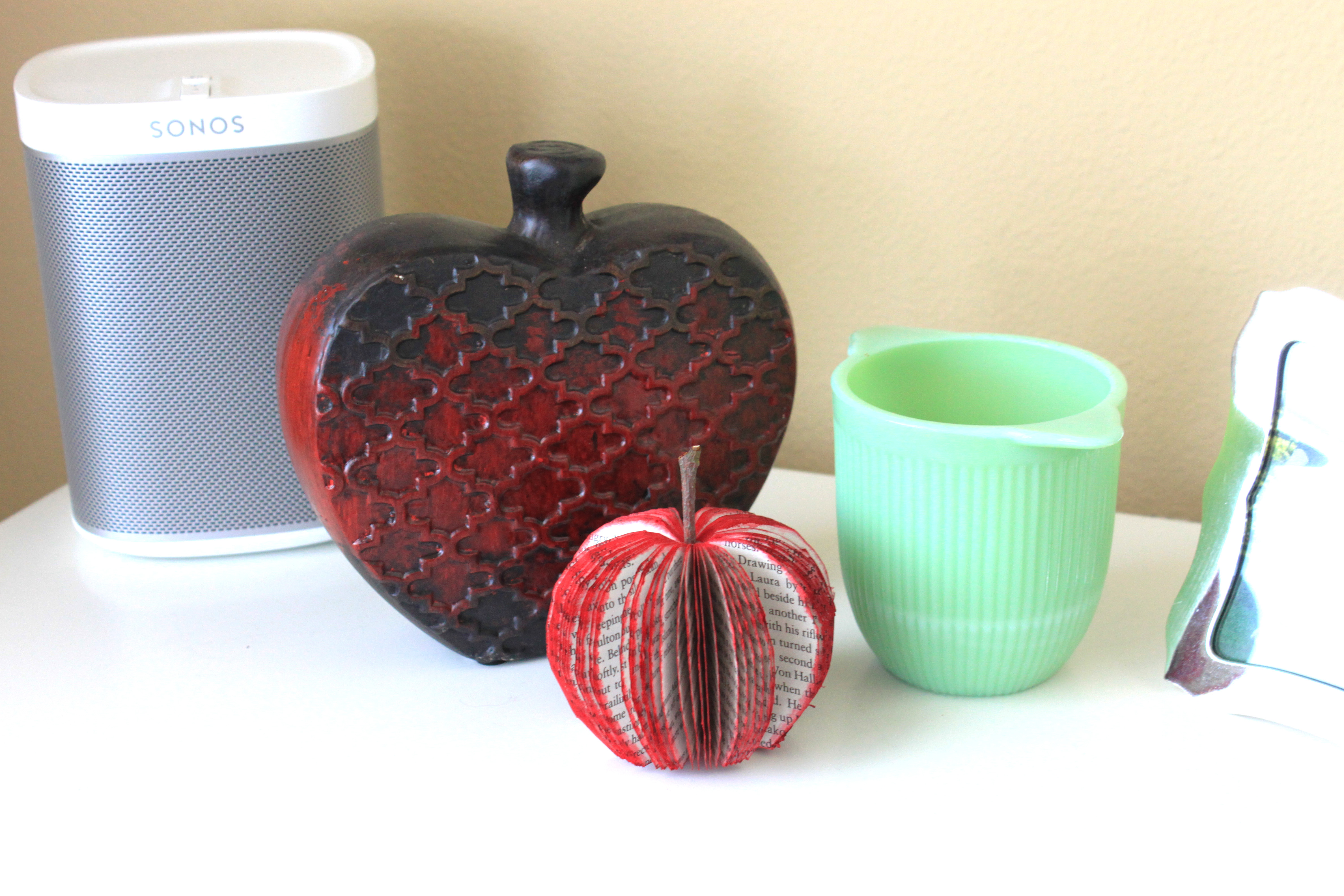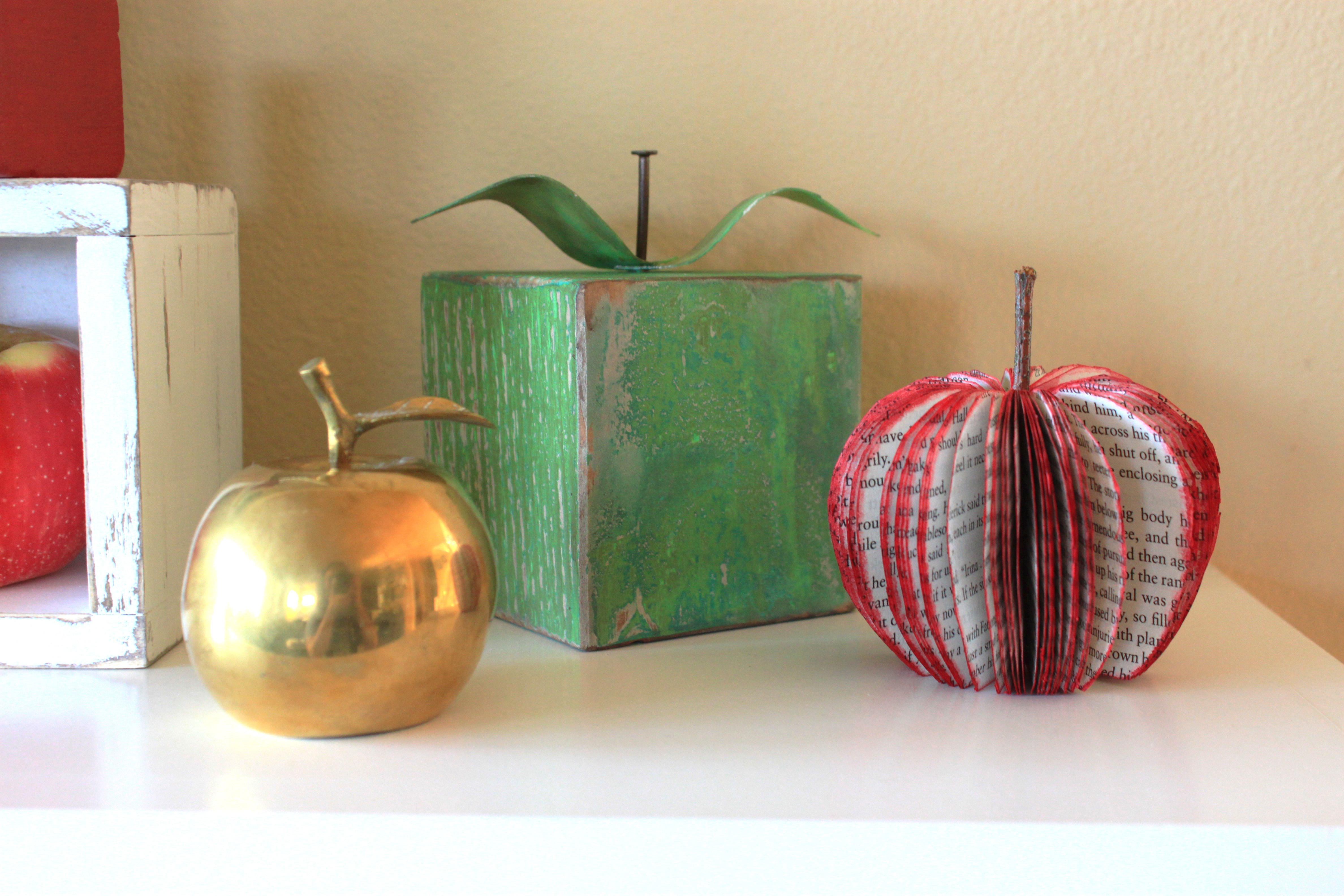 I got some apples and placed them in the little white boxes I made for June, and I also found this wooden “Home” sign at Michael’s and painted it with one thin coat of red paint. I found the “A” letter block at the Issaquah antique store (which was closed for over a year because they are building condo’s in their old location and I am SOOOO excited they are finally open again) and painted it red and using a push pin to make the stem, pinned a paper leaf to it (idea found here). The brass apple is a bell I found at Value Village and I also made the book page apples from a book I found there, using this tutorial.