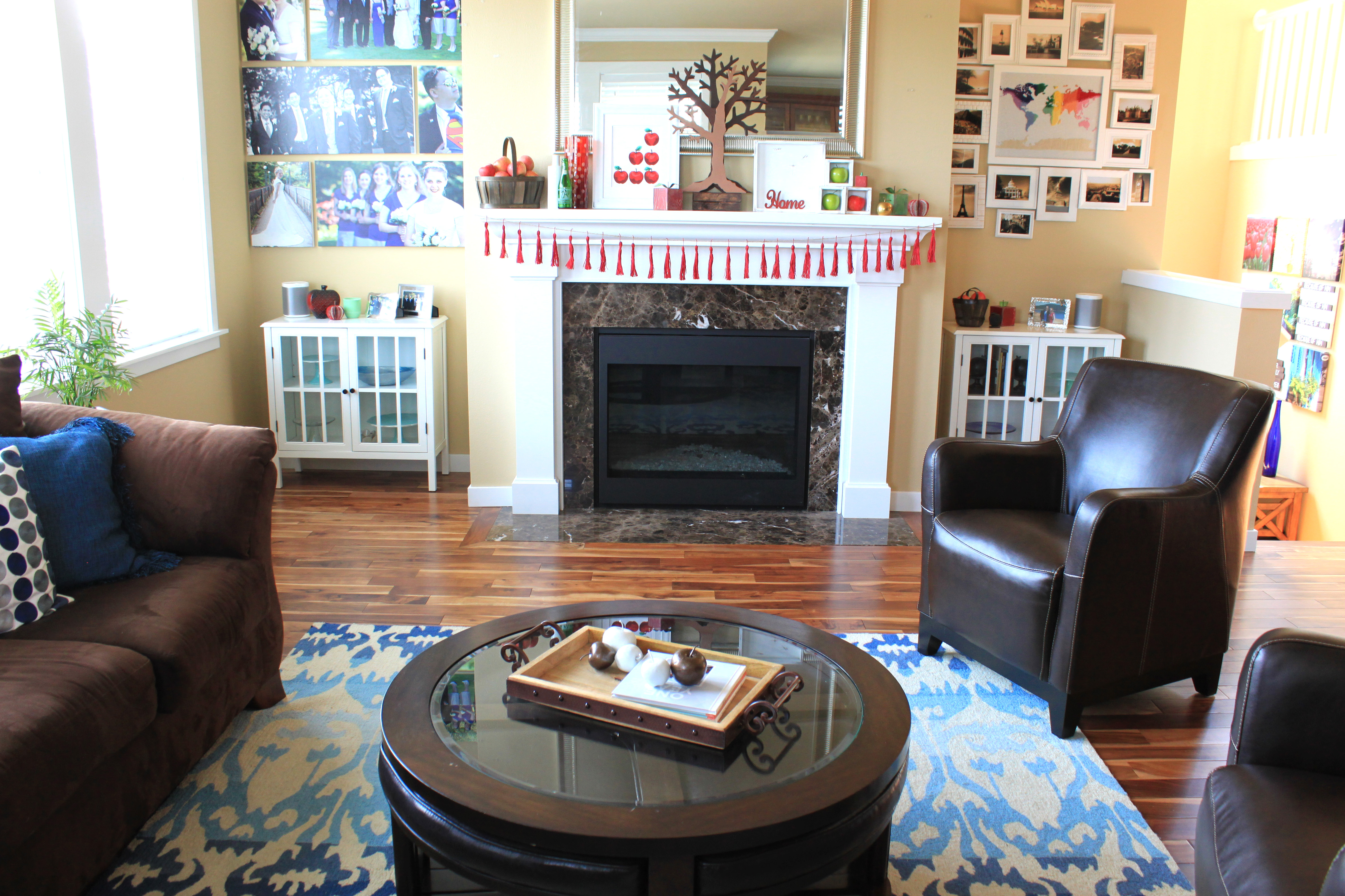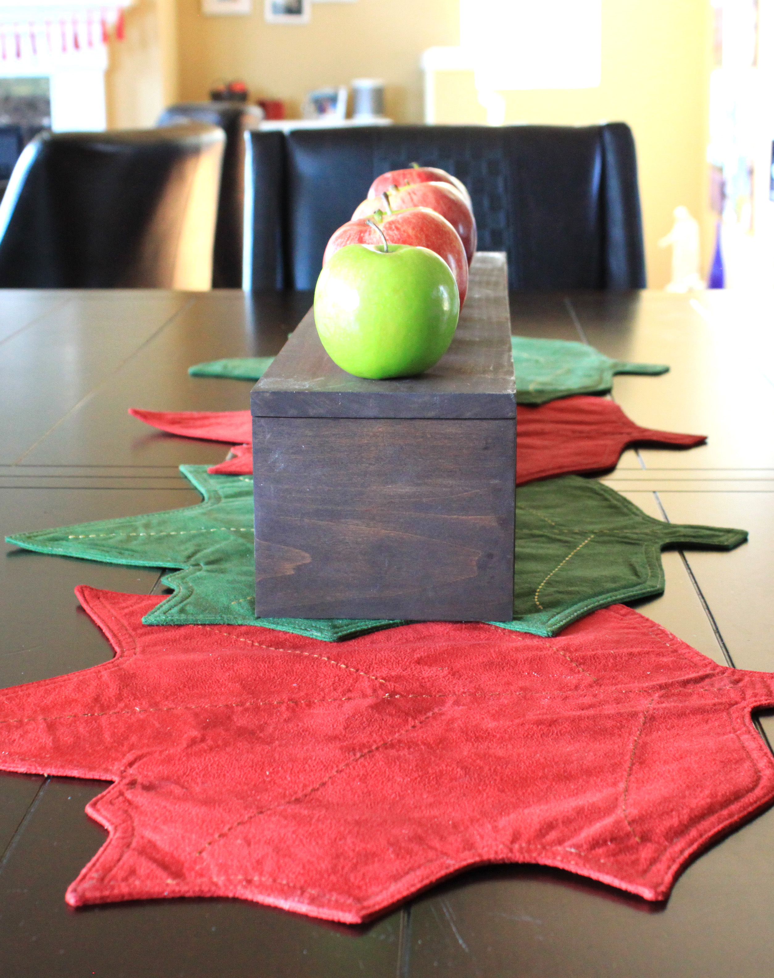 My mom bought me and Rachel these leaf placemats when we first moved out to Washington together and I still love them. They were part of the inspiration for the apple/orchard green and red theme. I turned the wooden décor box over and lined up some pretty red and green apples on them. And there you have it. 9 of 12 done!
