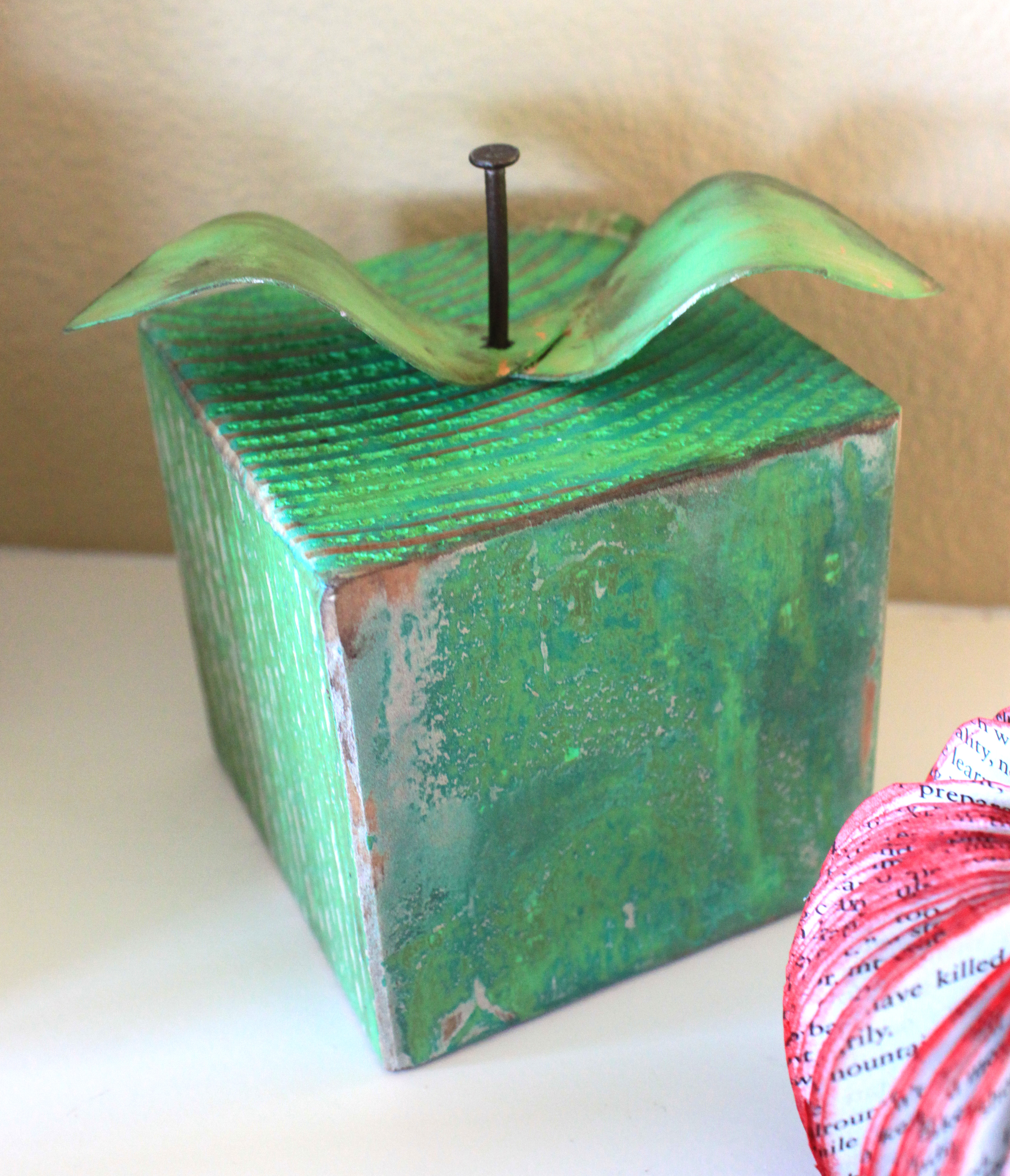 The square 4×4 apples are my favorite thing for the month. I saw them on Pinterest, but the Etsy store is no longer selling them, so I made my own instead. Of course. My friend Misty had a bunch of leftover pieces of 4×4 from the firecrakcers we made at the craft night she hosted and she was kind enough to let me have a few square pieces of it so I didn’t have to buy a whole beam. They already had a white primer on all the sides, then I painted them, sanded them to distress them, and wiped a very small amount of stain over them.