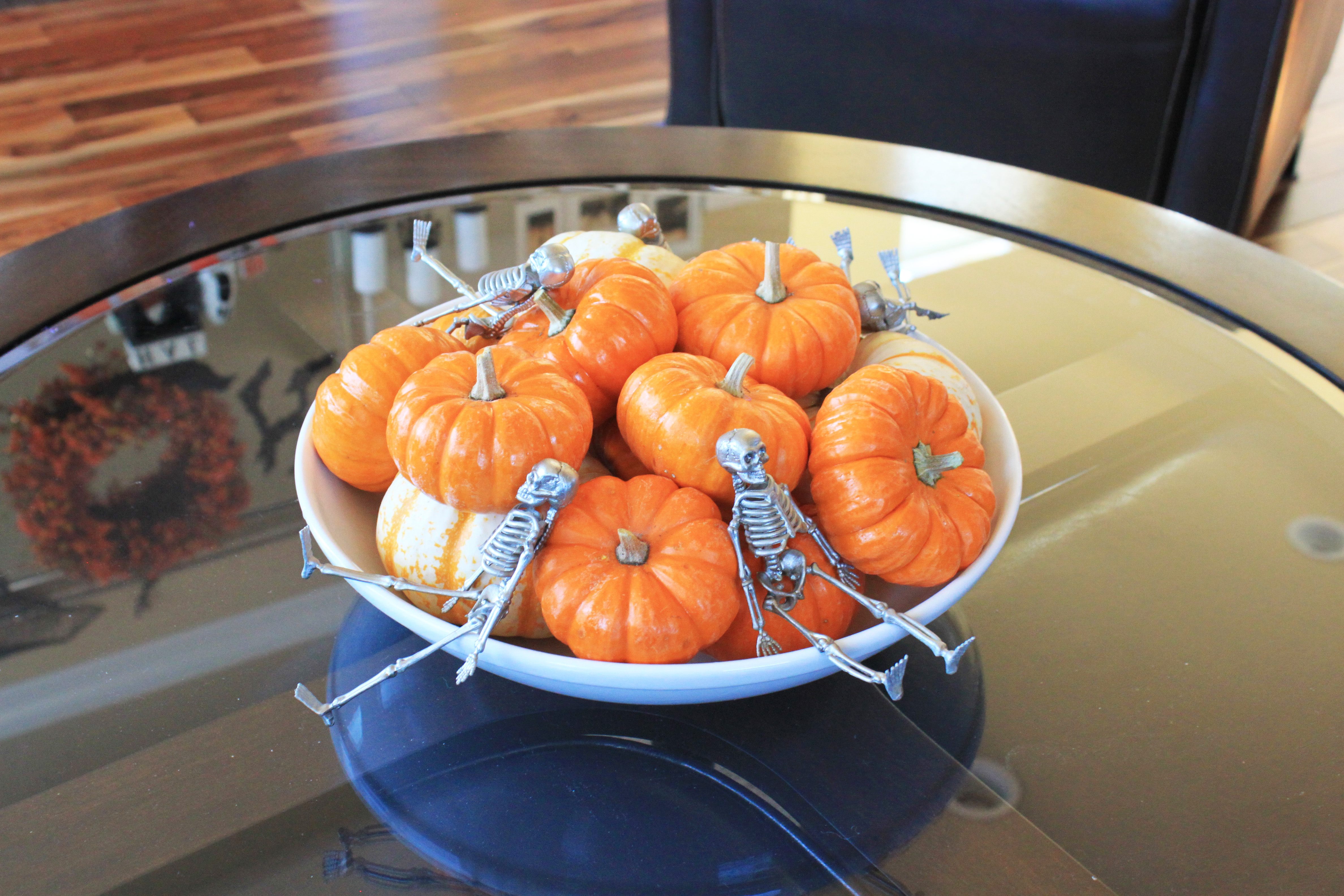I bought a skeleton garland and pulled them off the twine and then spray painted them silver too add to this bowl of little pumpkins.