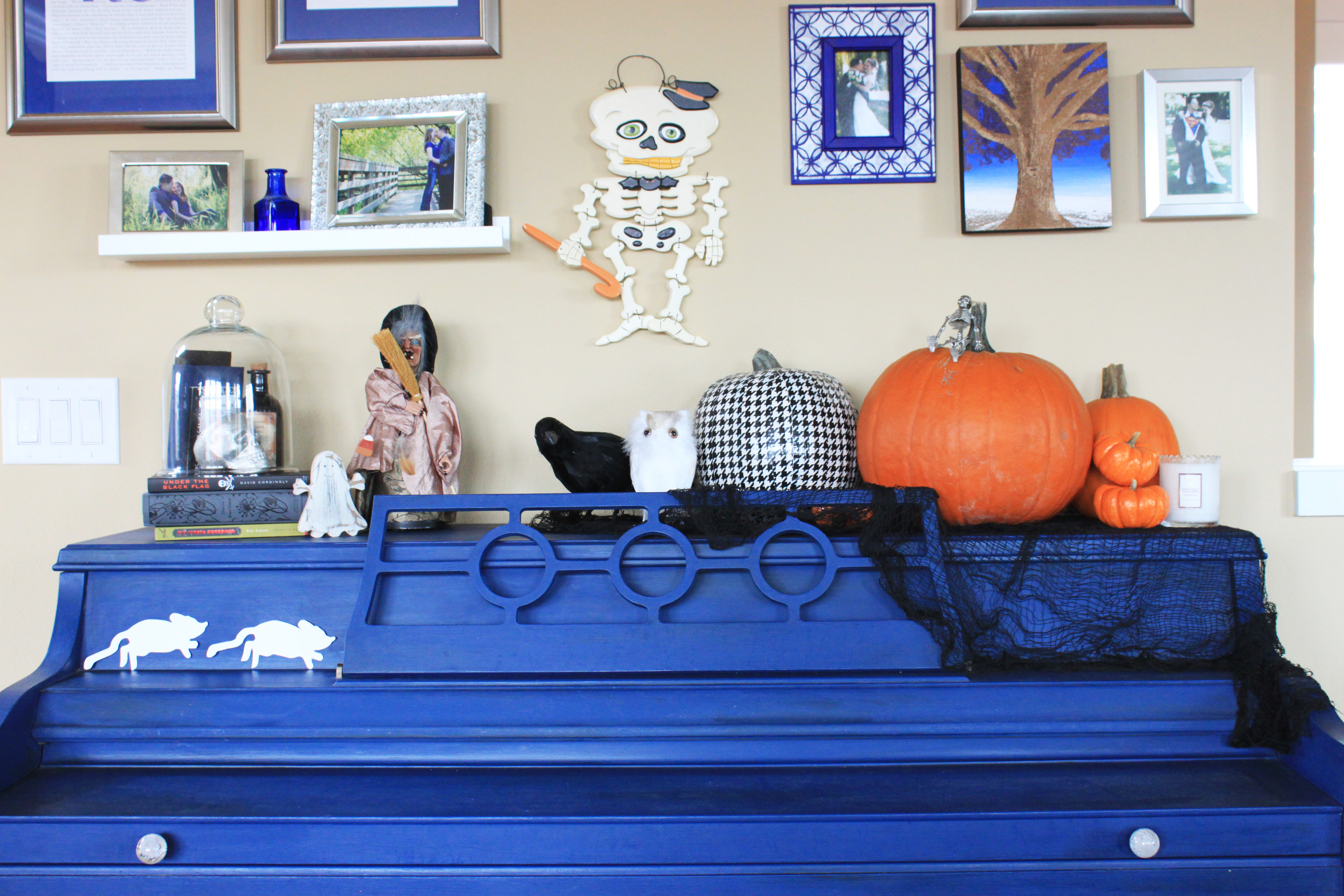 The little paper mice on the piano I saw on Pinterest and I drew them and cut them out and taped them onto the piano. I also got a fake pumpkin and then covered it with some black and white houndstooth duct tape. And I found some pirate books while I was in North Carolina.