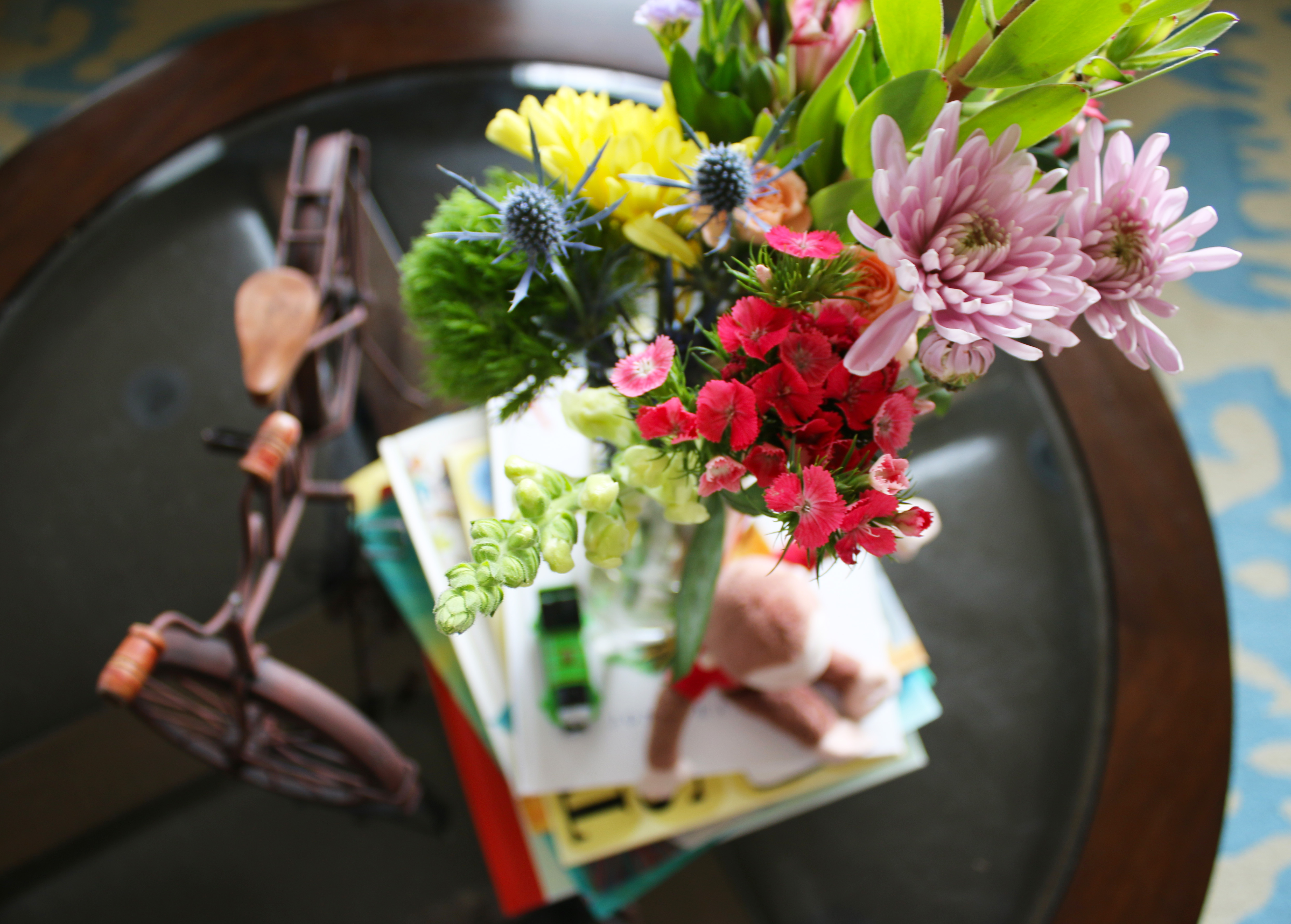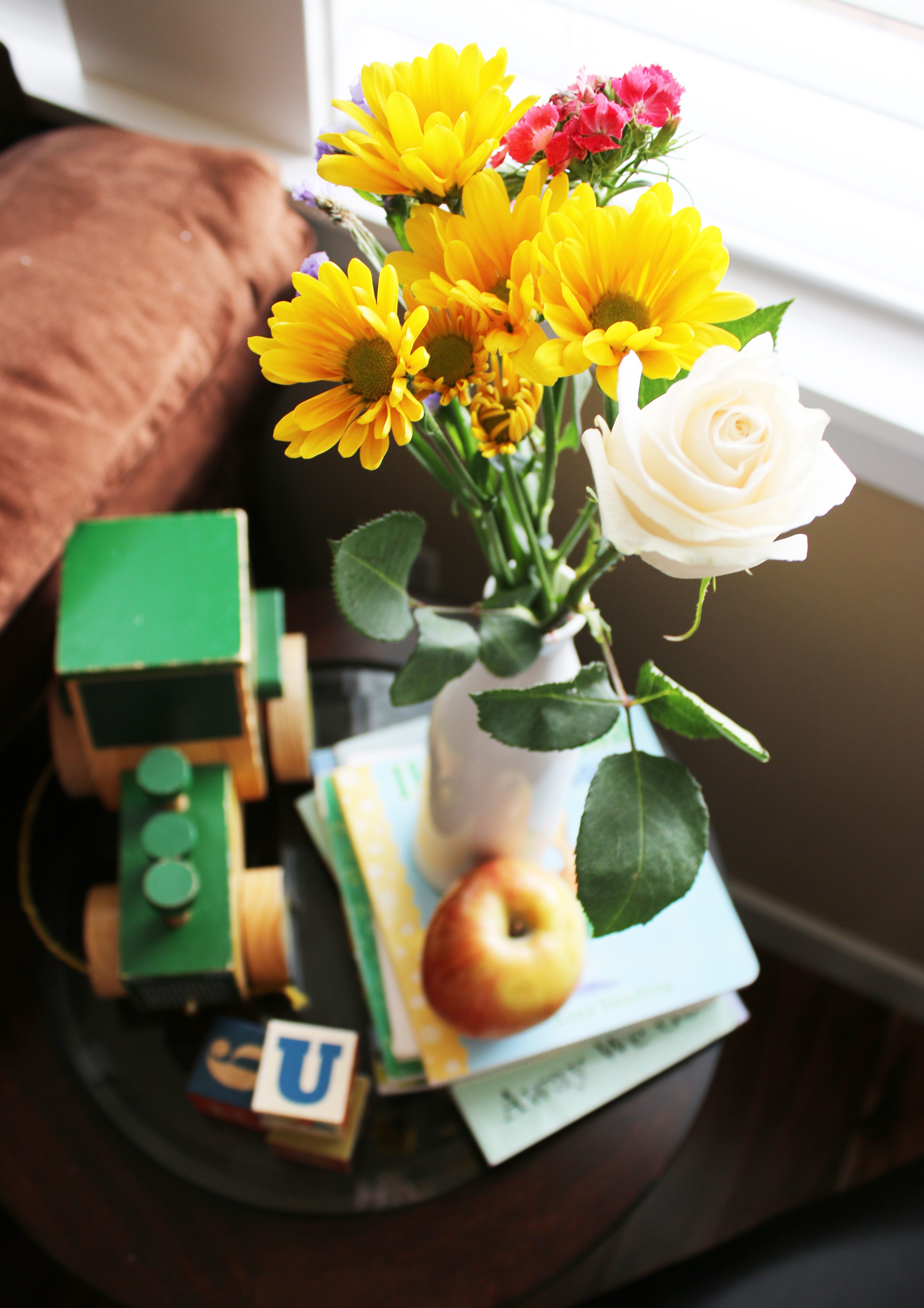 This past weekend I threw another shower, this time a baby shower, with Jeanette (again 🙂 ) and our friend Wendy.  It was for our friend Megan, who Jeanette and I knew from our days in the singles ward, and she and her husband just moved into our ward a few months ago.  Jeanette, Wendy and I decided to do a children’s book theme because we all love books.  We wanted lots and lots of books to use to decorate with… but I have very few children’s books… it was a good thing Jeanette and Wendy had so many! 🙂   Megan’s nursery colors are blue, green and yellow, so we used those colors where possible, but it was all pretty colorful with the different books.  I loved all of the different colors with the white.  We threw in a bunch of toys and sort of book themed items in with the books, along with some colorful flowers.