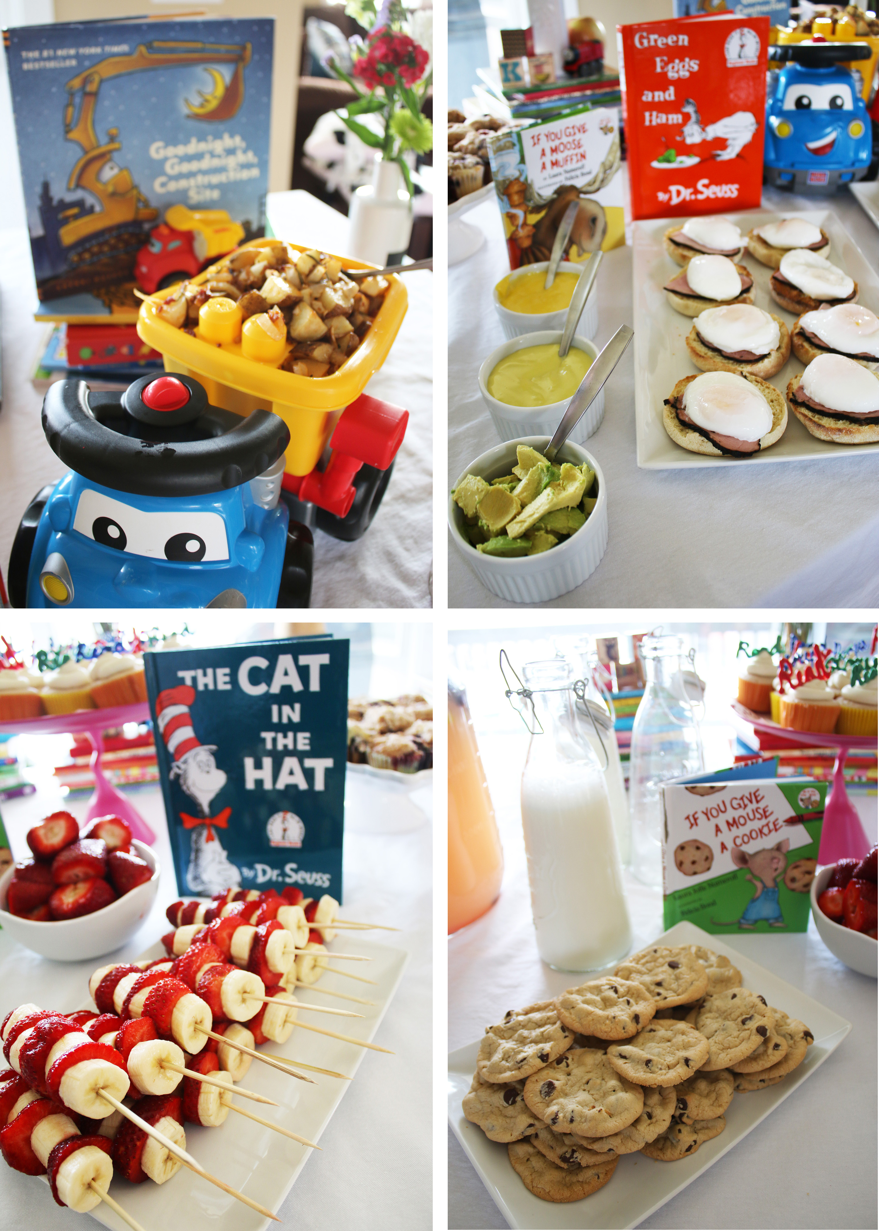 We saw lots of book themed foods on Pinterest and went with a brunch theme since the shower was at 10:30.  I made some blueberry muffins for “If You Give A Moose a Muffin”, and these breakfast potatoes that we put in a toy truck to go with “Goodnight, Goodnight Construction Site.”  For “Green Eggs and Ham” Jeanette came up with 4 or 5 different options and my favorite one was Eggs Benedict, which was pretty ambitious of us to do…  I made the eggs, and it was my first time ever making poached eggs.  Jeanette found a couple of very helpful recipes and videos which worked very well. They turned out very beautifully I thought.  I was really proud of how they looked… however over half of them were a little to hard for poached eggs (which actually turned out well because a few people said they preferred them that way)… and we used the method of making them the night before and then storing them in the fridge in ice water and I didn’t quite get them warmed up as much as they should have been…   They would have been perfect if Jeanette had been in charge of them.  But hey they looked beautiful.  Especially the ones on the plate on the right.  The green part of it was some guacamole hollandaise and some avocado.  Jeanette did the hollandaise and she did a great job with that.