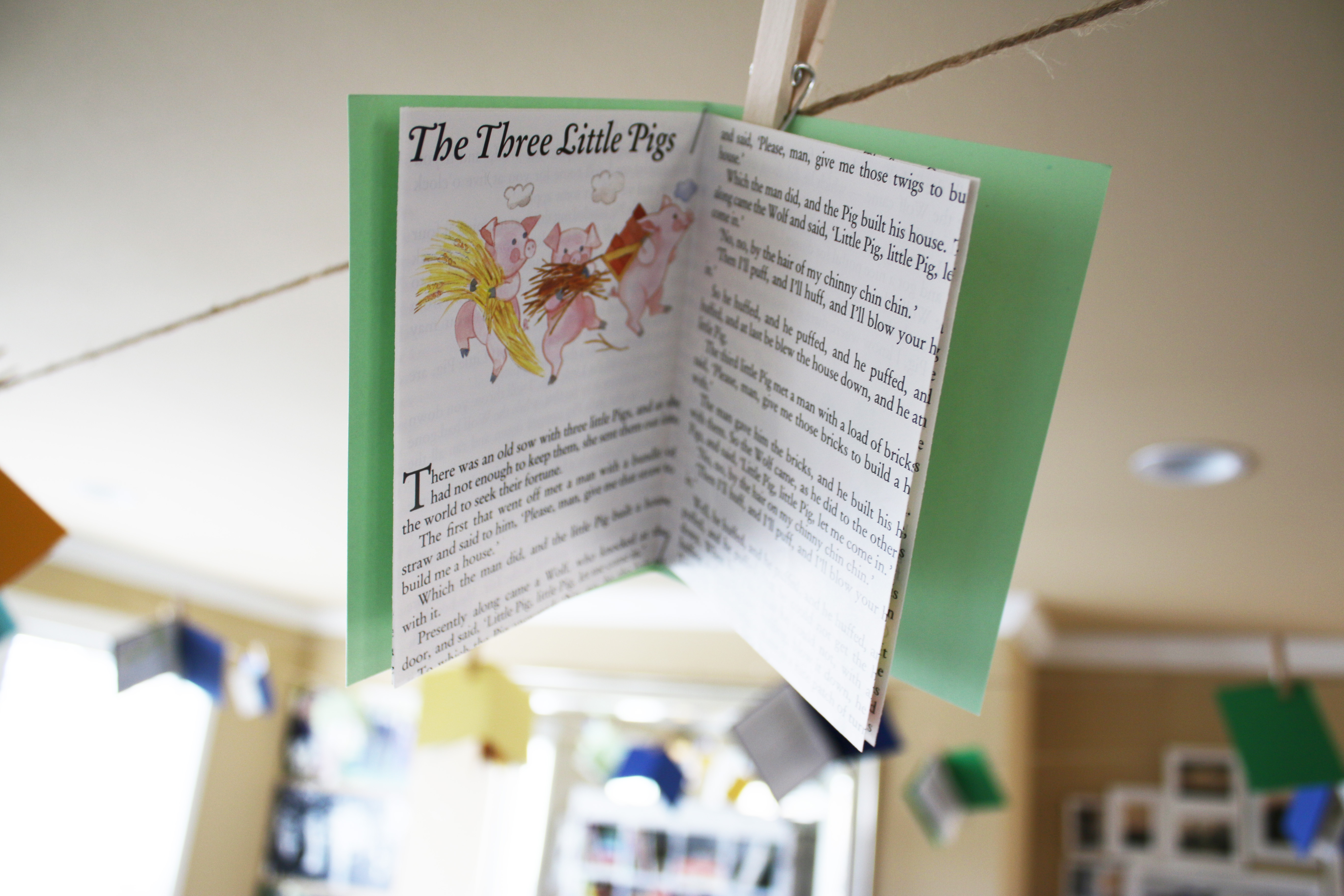 We saw the paper book garland on Pinterest and I had a fairy tale book with nice colorful pictures that I used to make the pages, they were perfect for the theme.