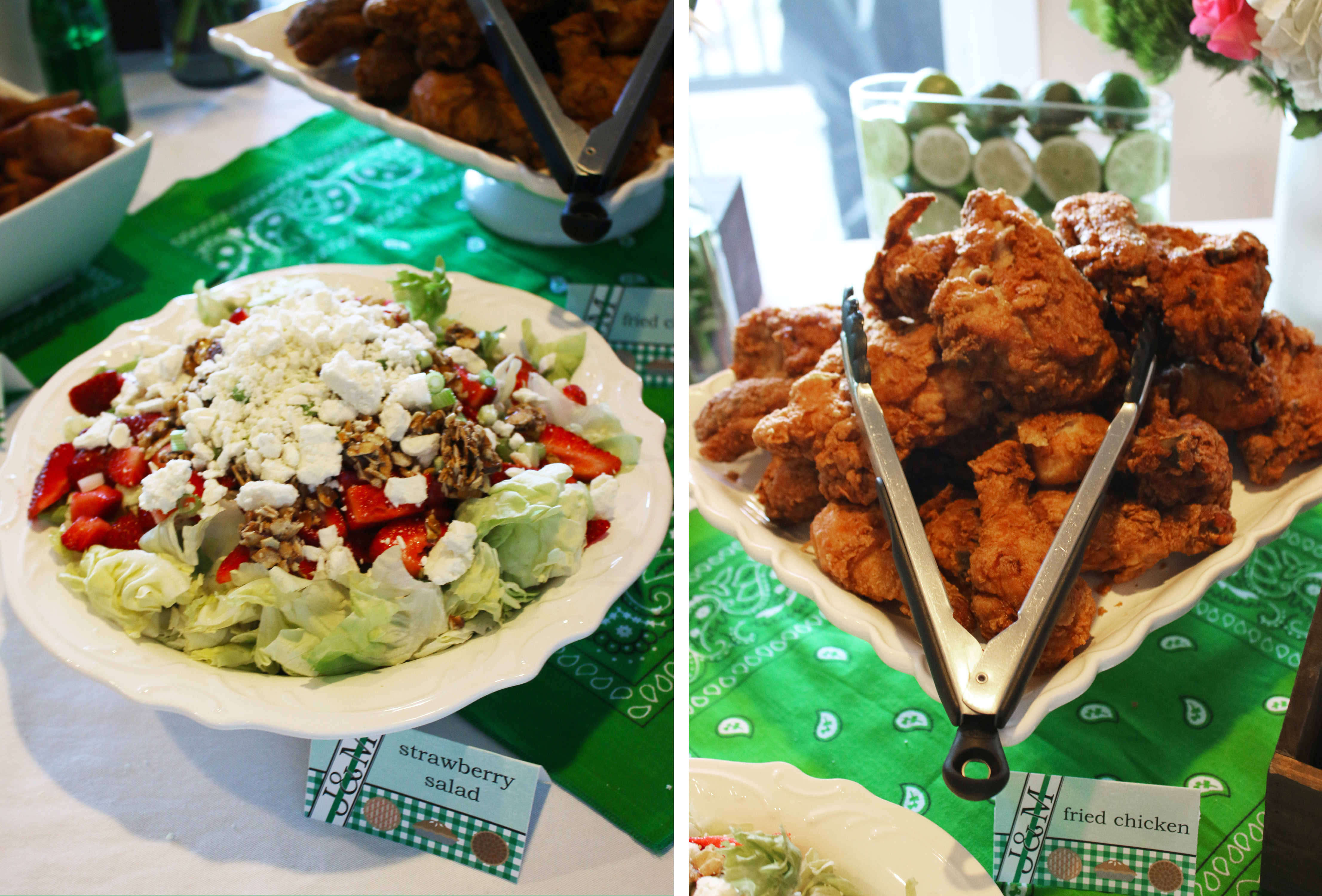 Trish’s vision was to have fried chicken with the pie, I think because it goes along with Jen’s whole theme. Carrie and I had our husband’s pick up the fried chicken and jojo’s while we were making the pie so they would be nice and hot and fresh (thanks guys). We let them have some too. 🙂 Vu was complaining that he wasn’t going to be here for it since it was during the Priesthood session of LDS General Conference and said this was his favorite party food I have had at a party yet and he didn’t want to miss it. So this worked out well so they could have some before going to watch the session. And made it easier for us at the same time. Carrie made a strawberry salad (also “pink” and green) and I made some biscuits that were not my favorite… needs some more work on that one.