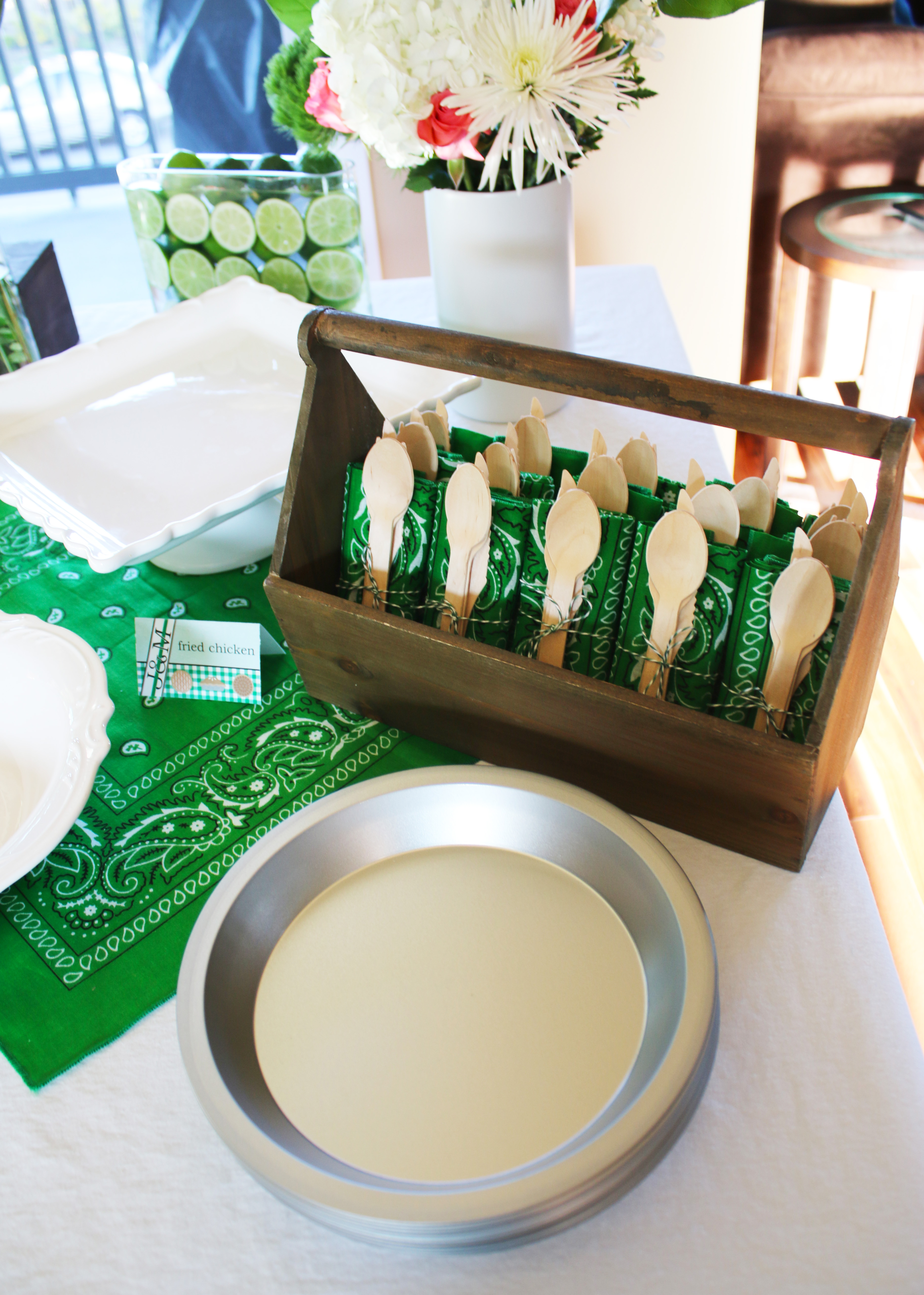 And of course pie pans for plates for a pie themed shower. And Kelly green bandana napkins. I wasn’t going to use the wooden silverware again, since I used it for the last 2 showers, but then I found out that Jen is using them for her reception so I had to!