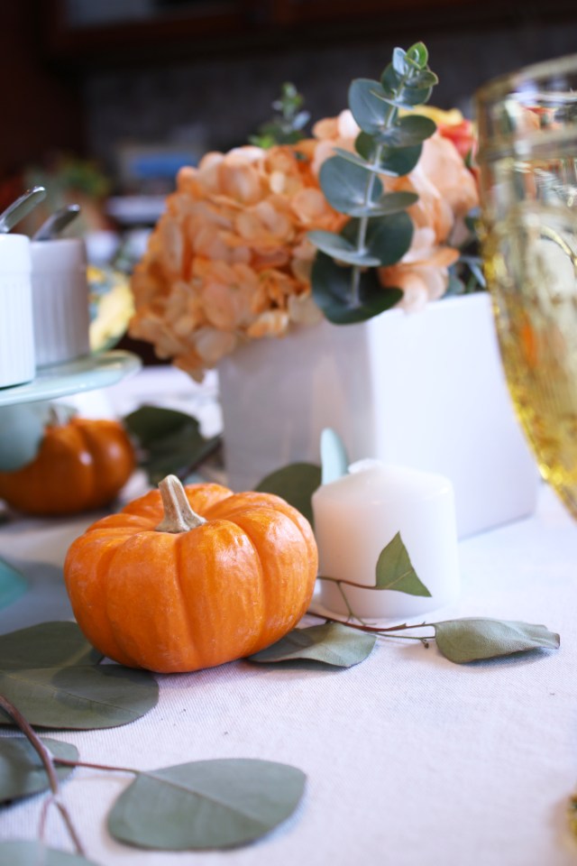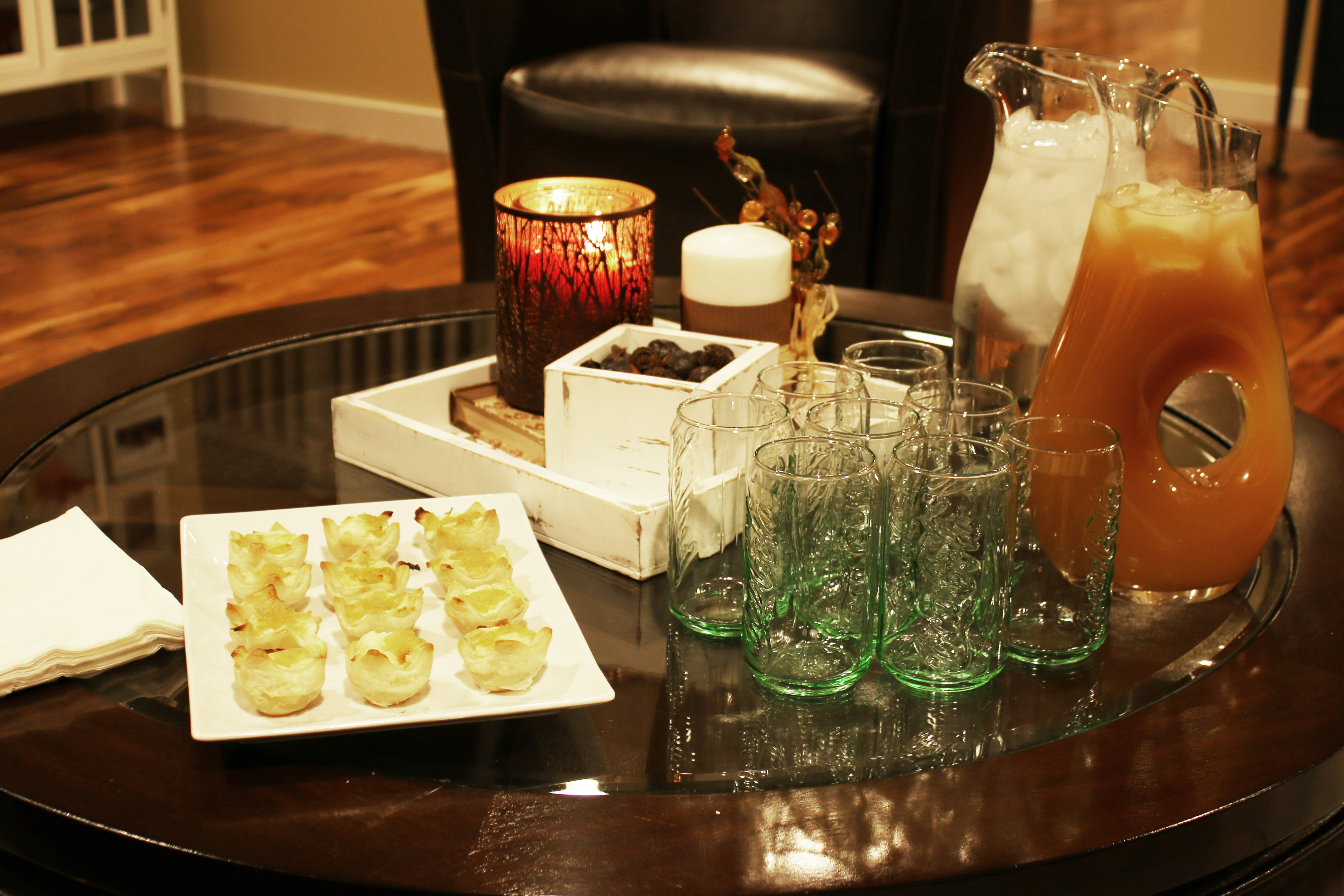 I chose a fall theme for this one, with mini pumpkins, yellow and orange flowers and goblets and napkins and sort of warm and cozy foods. We had some feta and caramelized onion pastry appetizer’s and some honey crisp apple cider to drink as everyone arrived.