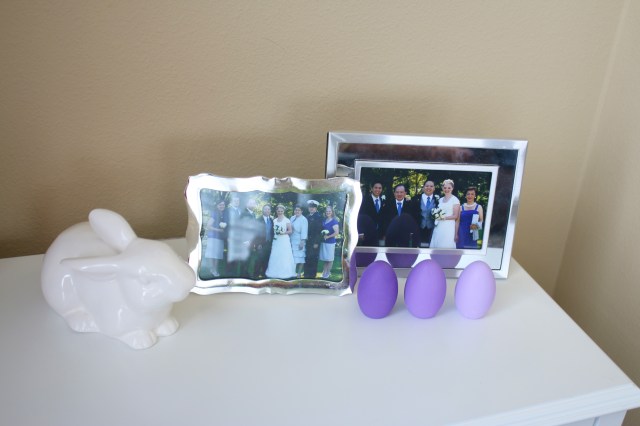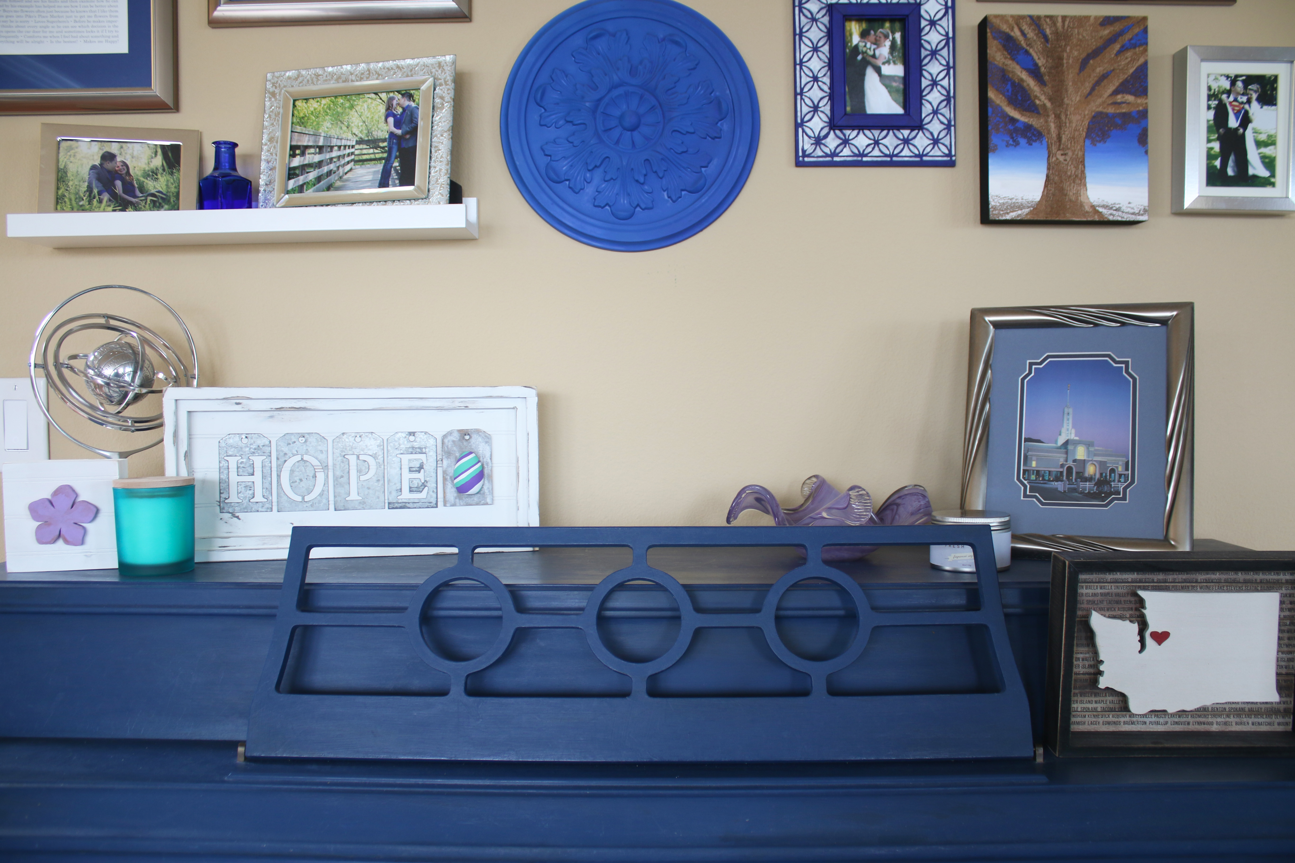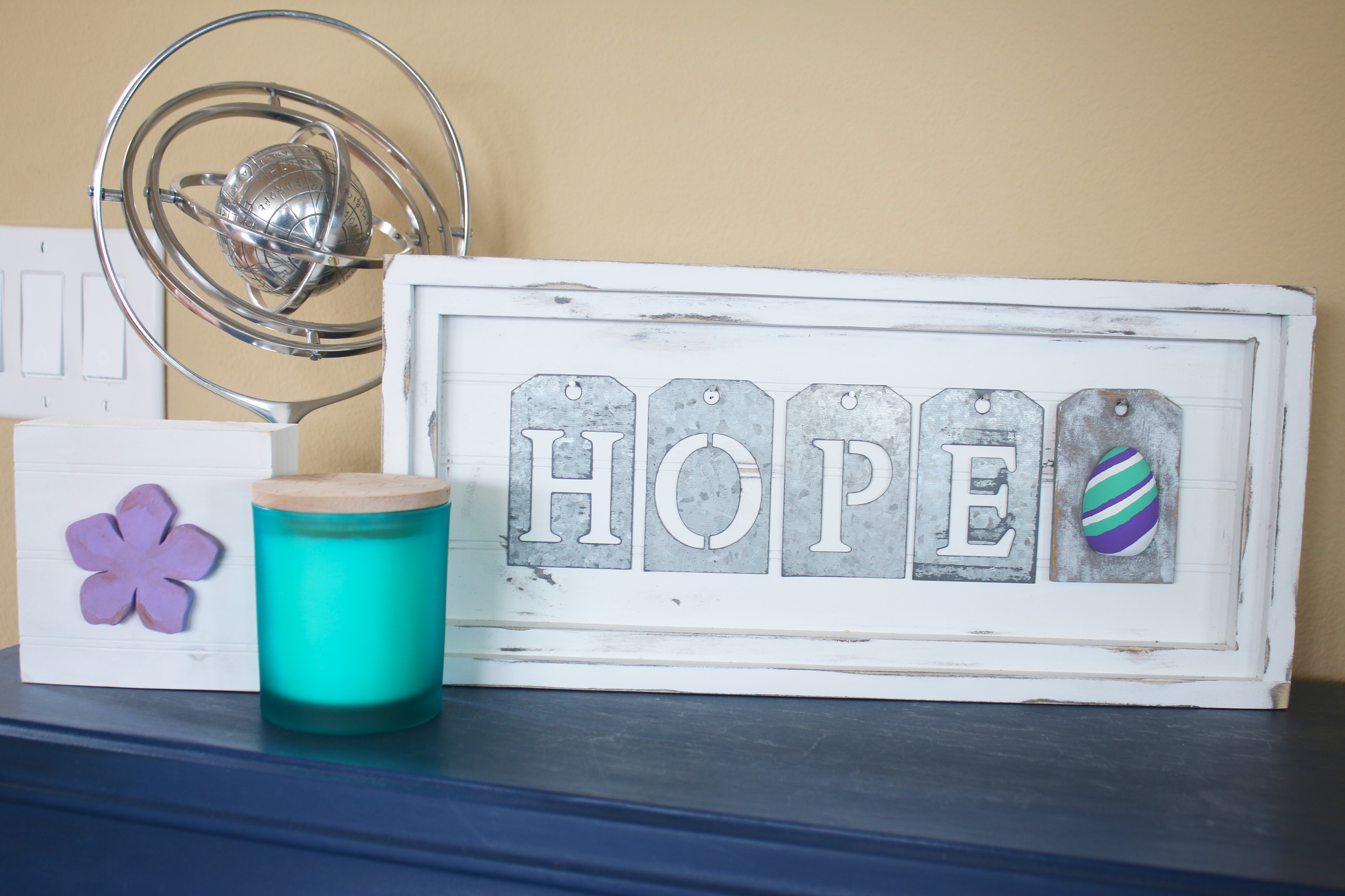 I had some friends over for a girls craft day last weekend and made some open bead board/wood frames to hold the paintings. The other project I made for the craft day was the bead board/frame sign on the piano. I found these metal letters at Michael’s a few month’s ago, and I LOVE the look of wood and metal and so I am always looking for any kind of cute metal decorations I can make into something and have been wanting some metal letters like these FOREVER! For the last spot I cut some 1/4″ plywood to the same size as the metal tags and tried many different painting techniques trying to mimic the look of metal and stuck the wood egg on. I made the tray on the table last fall, and it also happens to be bead board framed and white distressed… I may have an obsession…