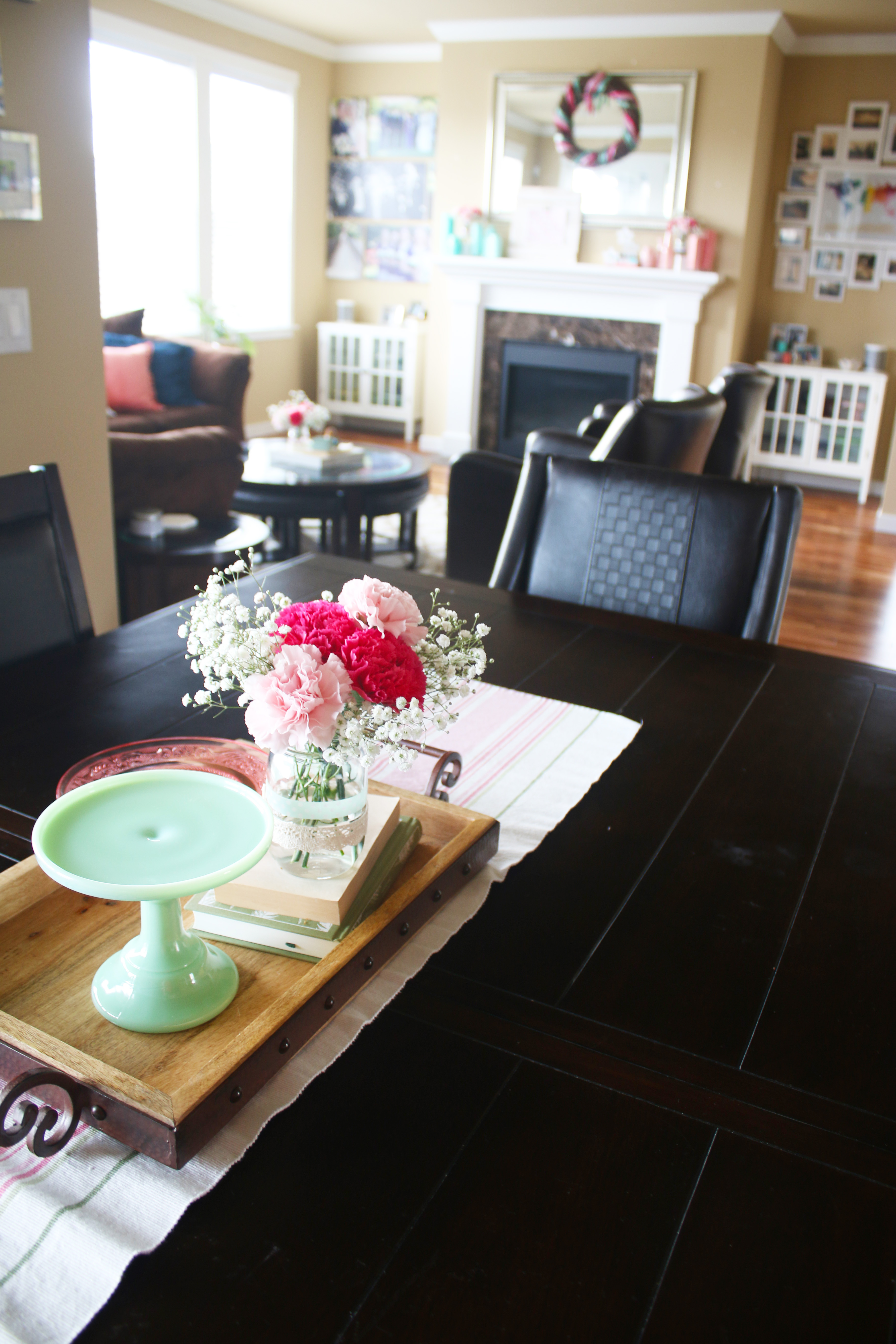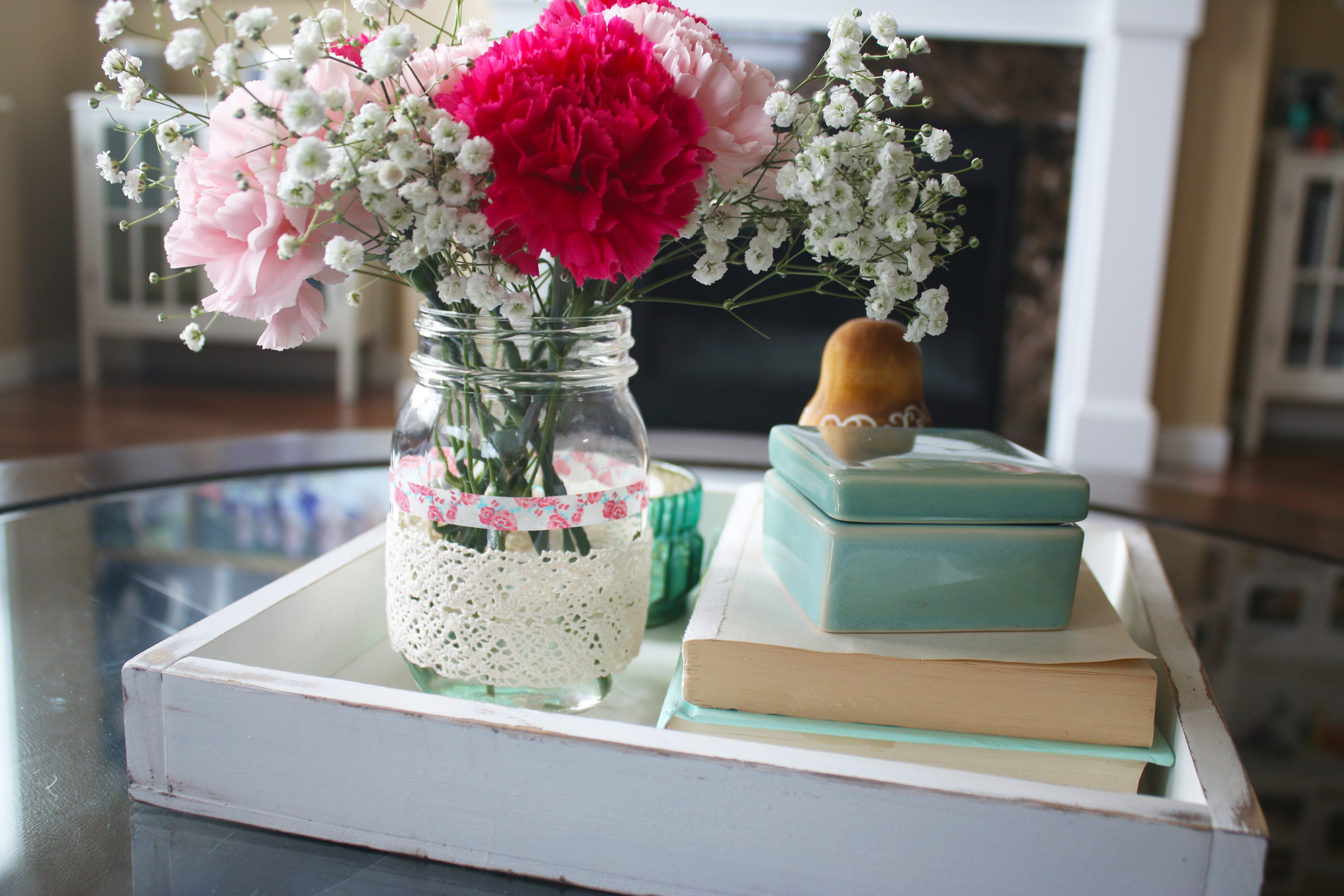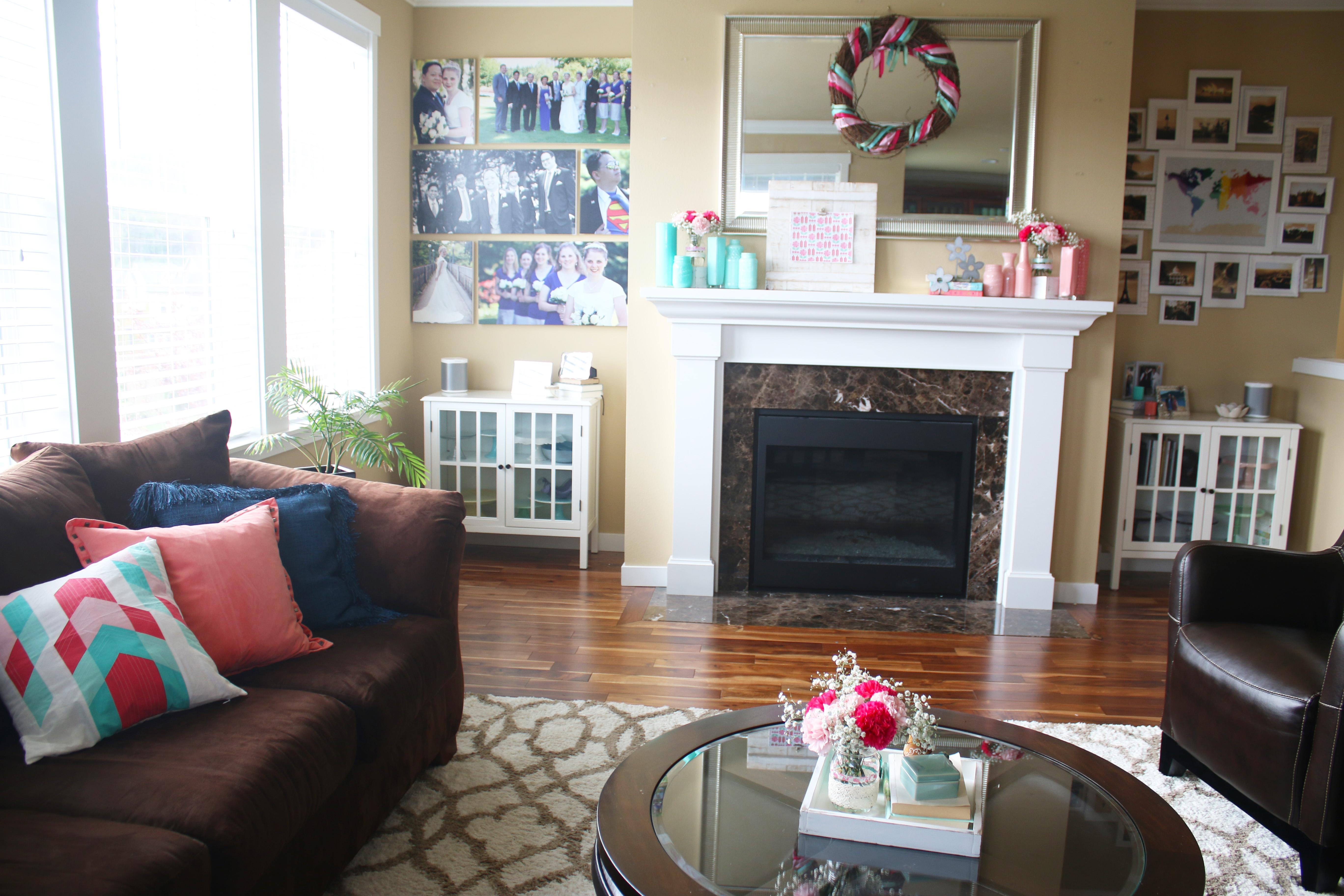 This April has been much more rainy and overcast compared to the last few years, but it is supposed to start getting a little more sunny next week which I am really looking forward too. This month’s decorations are helping make it feel like spring inside, even if it is slow in coming outside. I love all the teal/mints and coral/pinks. I made the rustic white frame that is on the mantel at my church’s Super Saturday craft day last Saturday, and reprinted the pink floral print I designed to fit it. I was also excited to put out the new metal flowers my friend Joella gave me, because you know I just love metal decor elements. I covered some jars with washi tape, lace and twine for the flowers, and printed a few pictures of the UW cherry blossoms to hang in the magnetic pictures frames I made last month. And then another one of my favorites this month are the little Matryoshka dolls on the coffee table. I have about 80 of them, and my twin sister has one to match each one, a tradition that was started with my grandma and her twin sister, who had almost 400 each when they died. We have a few that all 4 of us have/had. They are a fun little personal touch, and these are a couple of my favorite ones. That little one has 10 stacked inside, they go so tiny.