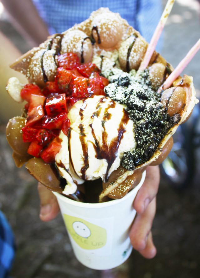 Last weekend Vu and I went to the Bite of Seattle with some of our friends. The Bite of Seattle happens every year and for one weekend tons of Seattle food trucks and restaurants set up along the walkways all over the Seattle center and offer 3 or 4 items off their menu. I love all the variety of food’s Seattle has to offer, and so this makes it so nice to be able to go and try a bunch at once. It has been a few years since we have gone, so it was really fun to go again. When we have gone in the past I remembered the lines being so long that we would split up and have everyone wait in a different line, but I don’t know if I remembered in incorrectly or if they have just gotten faster because the only line that was longer than 5 minutes was the “Puffle Up” line (which was close to half an hour I think), but we waited in it anyway because they are so good! Vu loved the spicy pork tacos from Chopstix so much that he went back and got another one at the end. Lately I have been feeling really jealous of Rachel living in Boston and wishing I could live there too, so it is really nice to have experiences that remind me how much I love Seattle too! (Also I was having a really bad day camera wise so….. all of the pictures are a little bit blurry…. I hate that!)