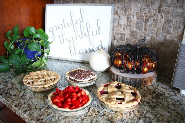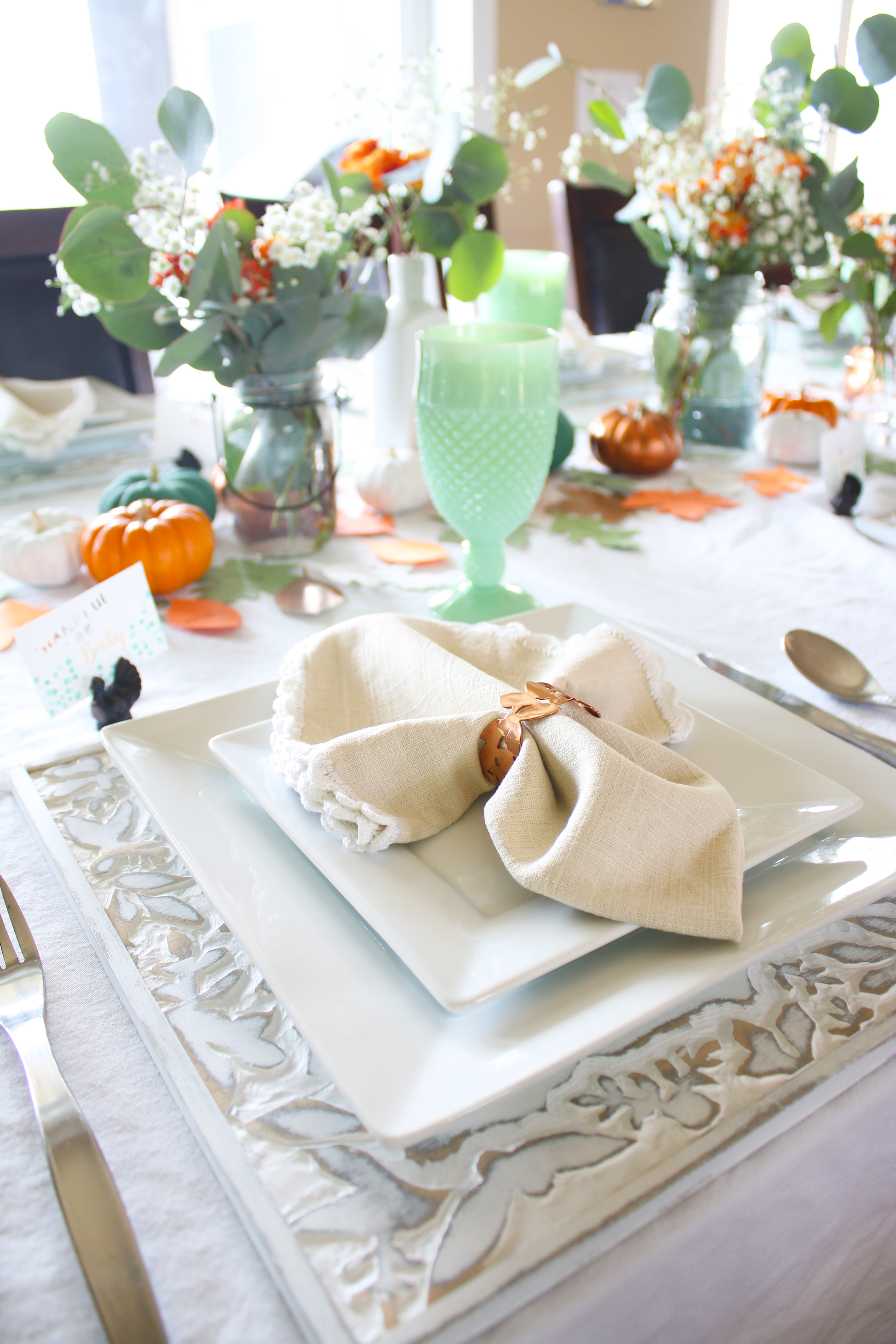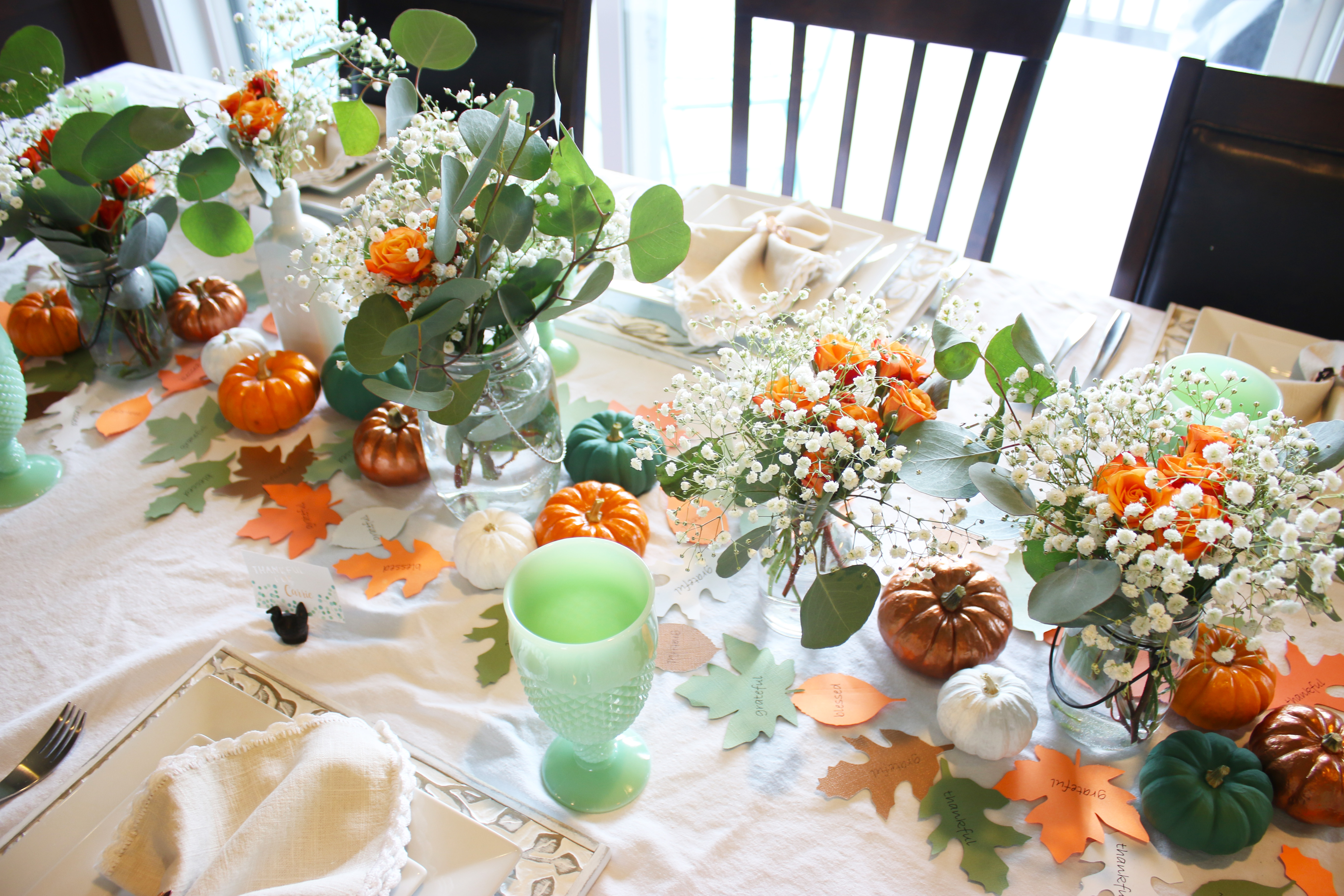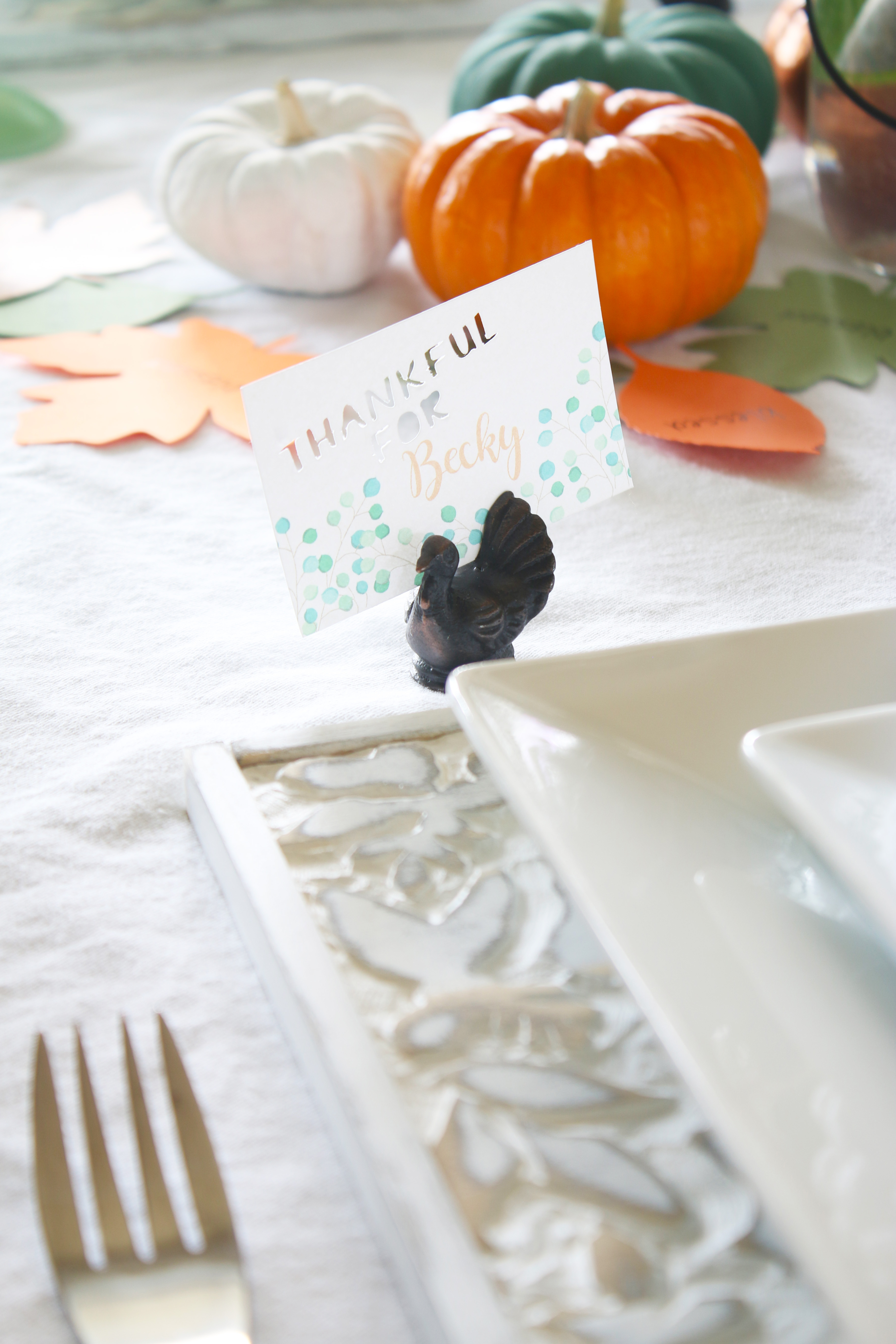 Almost every year for Thanksgiving Vu’s family has a big huge Vietnamese potluck with all of the extended family, so we usually have a smaller dinner with just his immediate family on Wednesday or sometime before Thursday with all the traditional food.  I really love the table decorations this year, with the orange, green and bronze.  Such a beautiful color combination!  I found these adorable bronze napkin rings for $3 for a set of 4 at target and used that as my starting point for everything else.  They are metal which makes them even better, and they are really great quality too.  My love for Eucalyptus is still going strong and a friend told me that Trader Joe’s sells them.  My grocery store floral section hardly ever has them, and then not very many at that, so I was sooo excited when I saw what they had at Trader Joe’s.  They even had seeded, which I have never seen at my grocery store.  Painting the pumpkins worked really well, because then I could cover up all of the bad spots that have been creeping in since I have had these pumpkins since the beginning of October.  Then I just cut out some leaves with my Silhouette with the words “Grateful, Thankful, Blessed” printed on them to put around the pumpkins and flowers.  I also used my Silhouette to cut out the “Thankful For” on the name tags.  I saw these turkey place card holders at Crate and Barrel last year, and then by the time I decided I wanted to buy them, they were sold out.  So I quickly got them this year, and they were even on sale the day I got them.  It was a great day with great food and I am so grateful for all of the blessings I have and for this wonderful holiday to celebrate it!