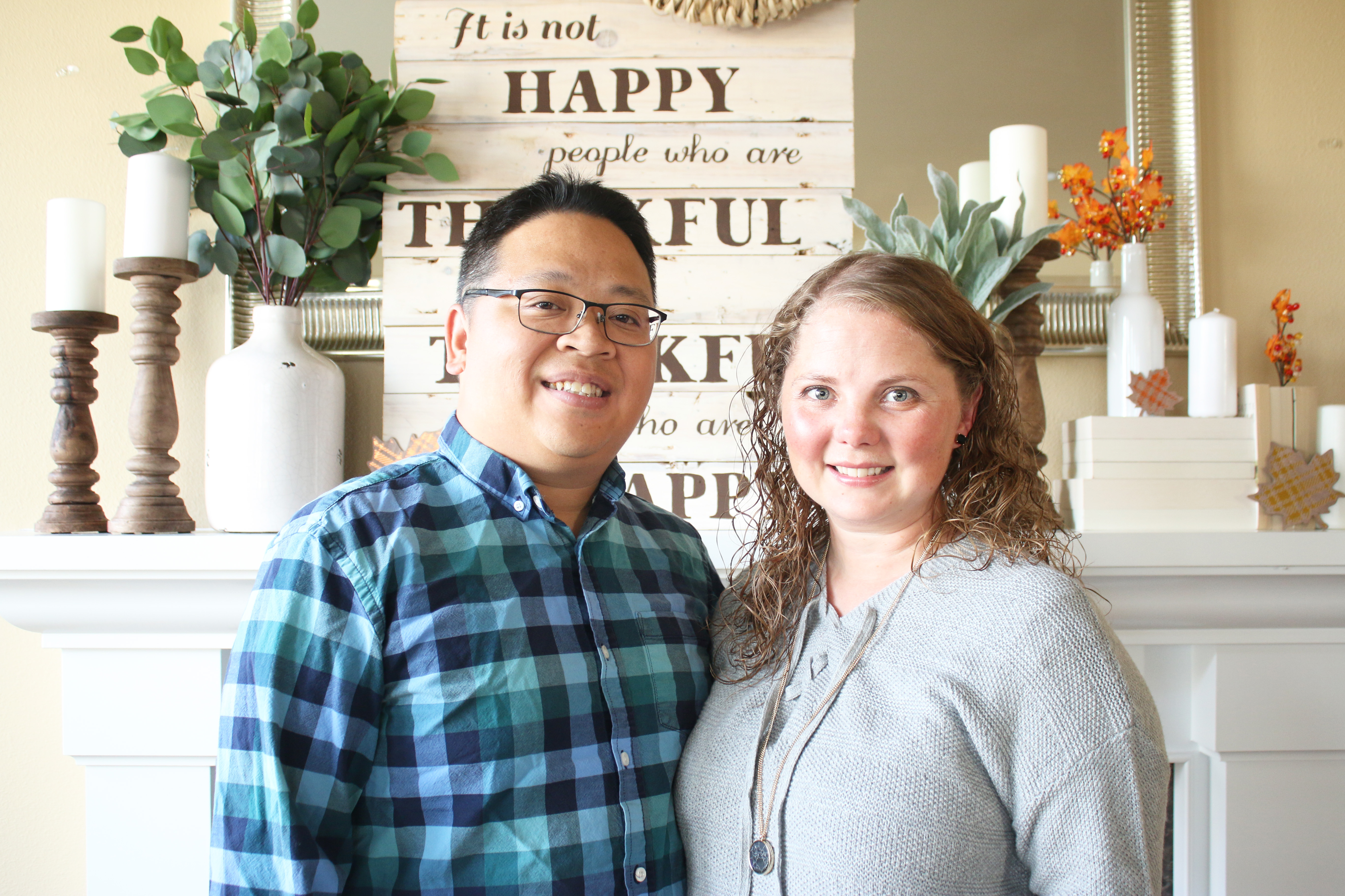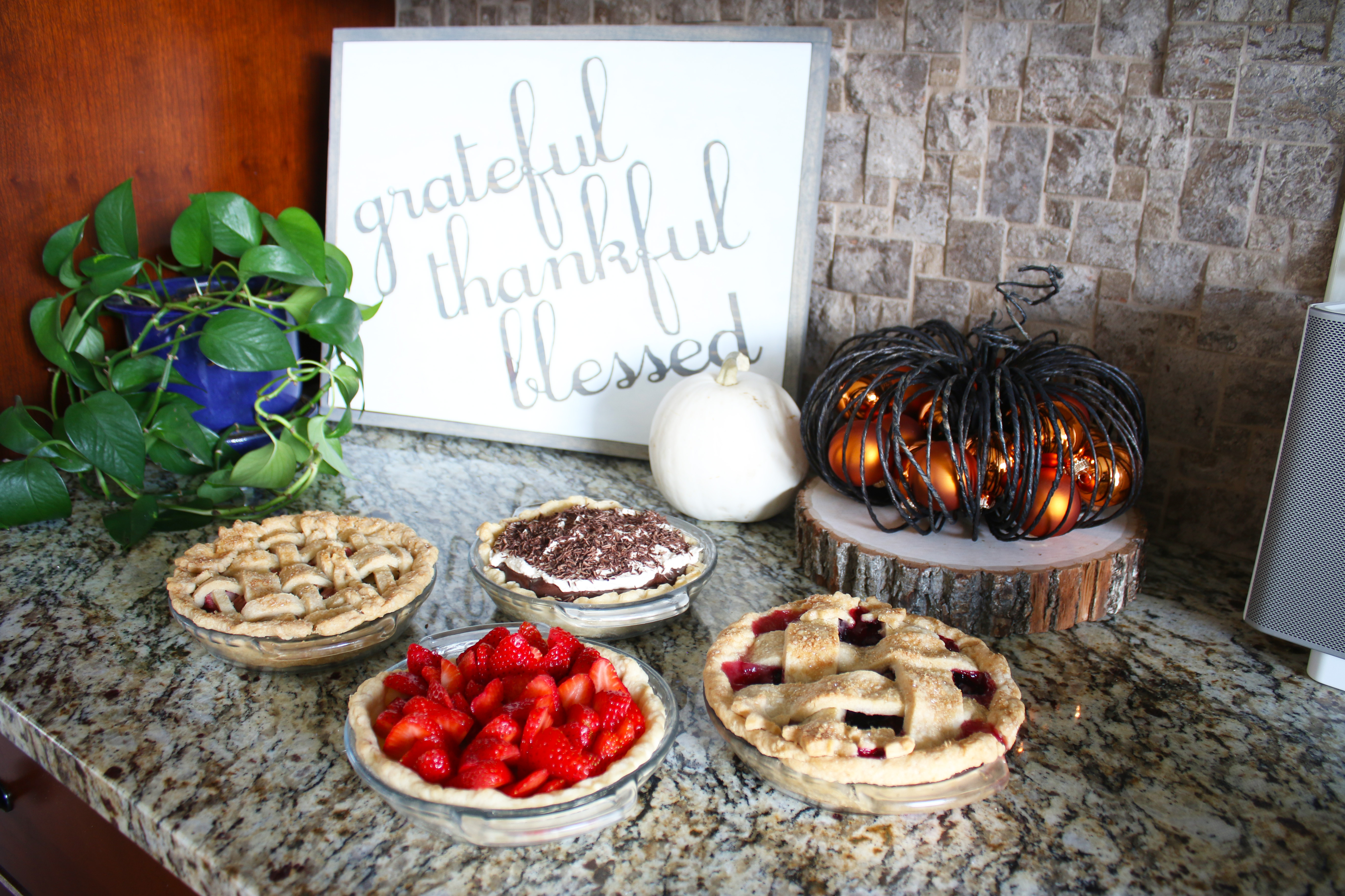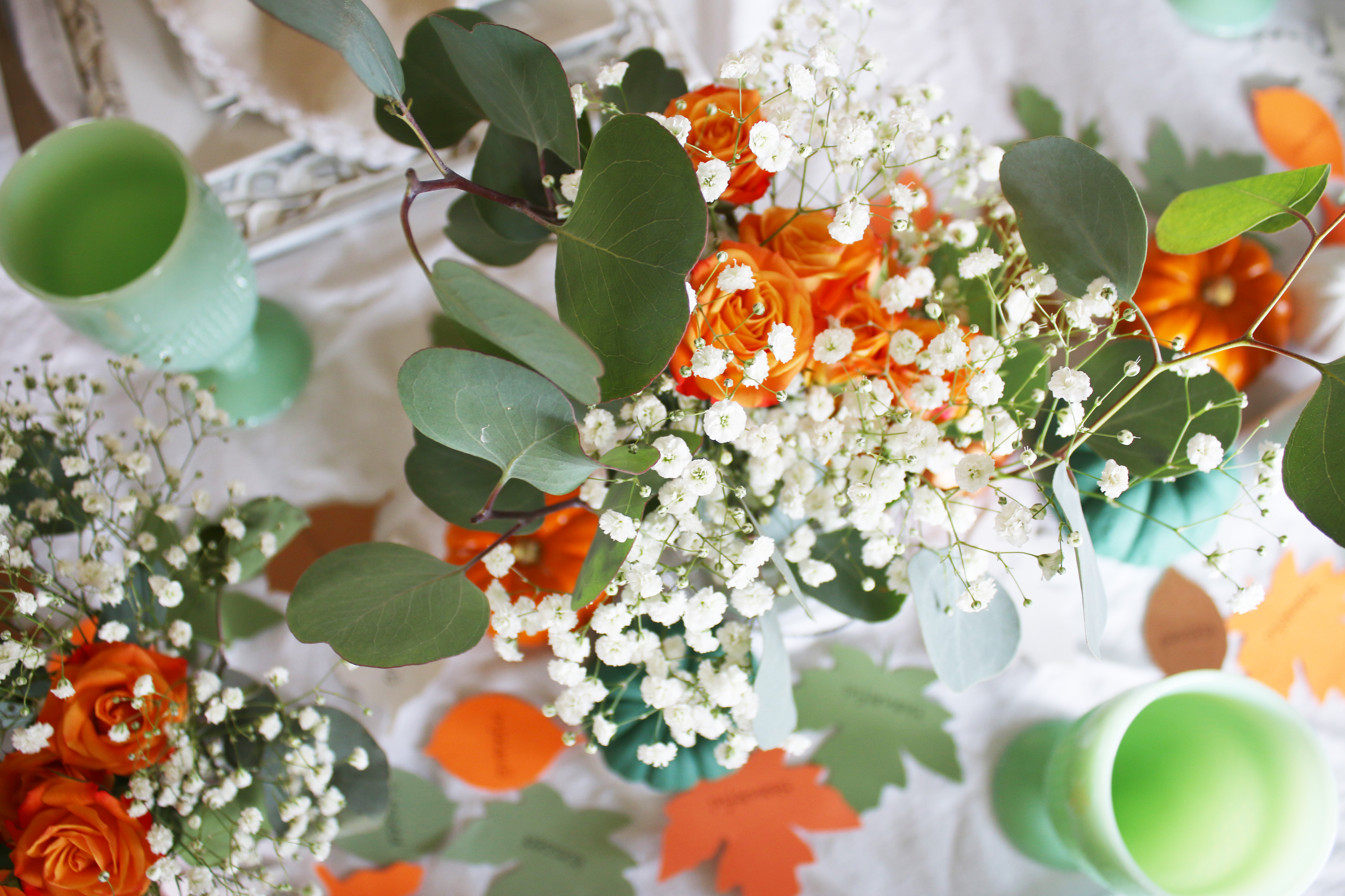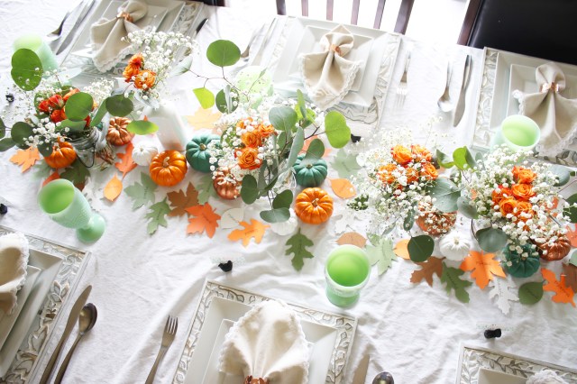 Almost every year for Thanksgiving Vu’s family has a big huge Vietnamese potluck with all of the extended family, so we usually have a smaller dinner with just his immediate family on Wednesday or sometime before Thursday with all the traditional food.  I really love the table decorations this year, with the orange, green and bronze.  Such a beautiful color combination!  I found these adorable bronze napkin rings for $3 for a set of 4 at target and used that as my starting point for everything else.  They are metal which makes them even better, and they are really great quality too.  My love for Eucalyptus is still going strong and a friend told me that Trader Joe’s sells them.  My grocery store floral section hardly ever has them, and then not very many at that, so I was sooo excited when I saw what they had at Trader Joe’s.  They even had seeded, which I have never seen at my grocery store.  Painting the pumpkins worked really well, because then I could cover up all of the bad spots that have been creeping in since I have had these pumpkins since the beginning of October.  Then I just cut out some leaves with my Silhouette with the words “Grateful, Thankful, Blessed” printed on them to put around the pumpkins and flowers.  I also used my Silhouette to cut out the “Thankful For” on the name tags.  I saw these turkey place card holders at Crate and Barrel last year, and then by the time I decided I wanted to buy them, they were sold out.  So I quickly got them this year, and they were even on sale the day I got them.  It was a great day with great food and I am so grateful for all of the blessings I have and for this wonderful holiday to celebrate it!