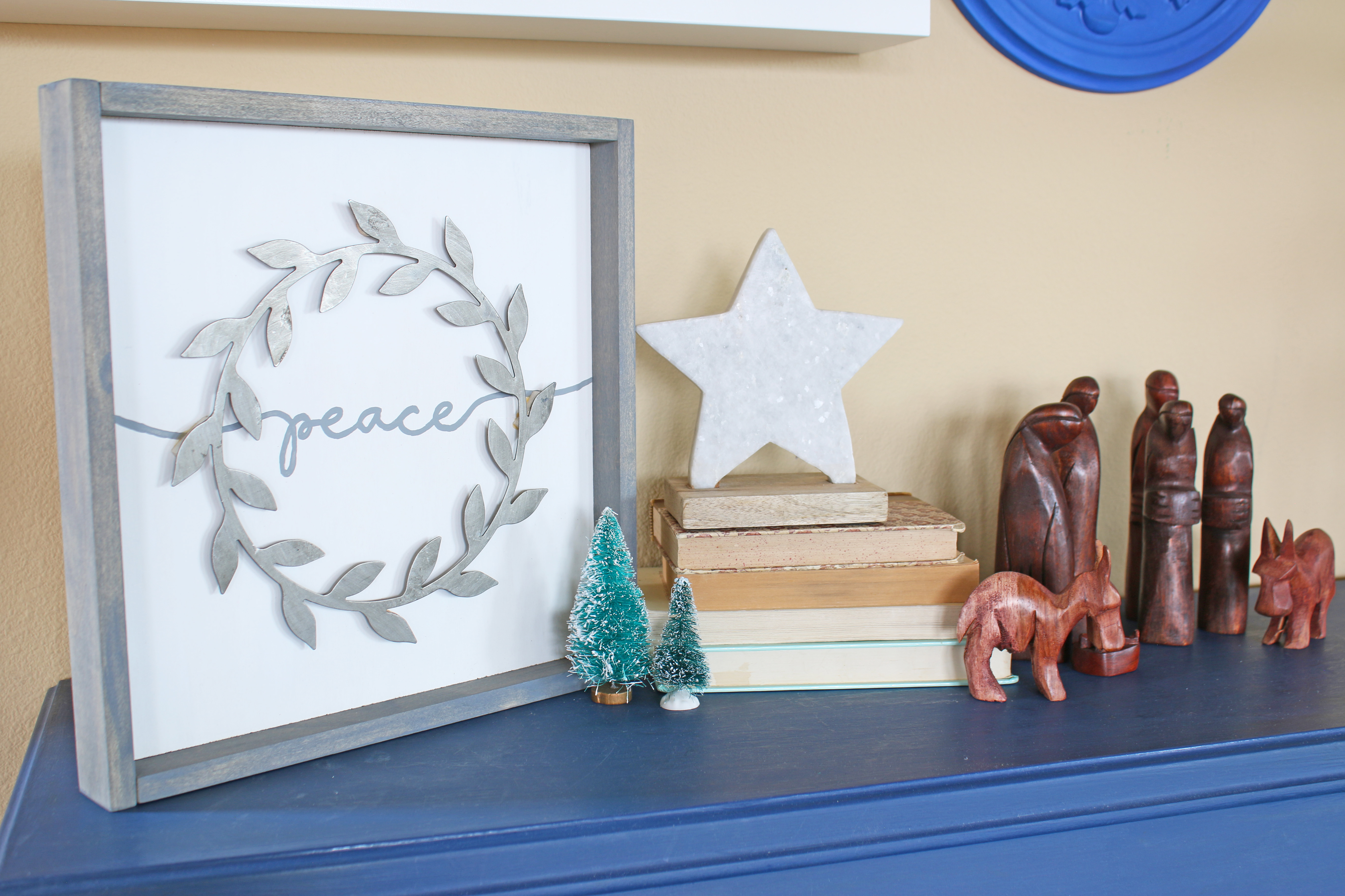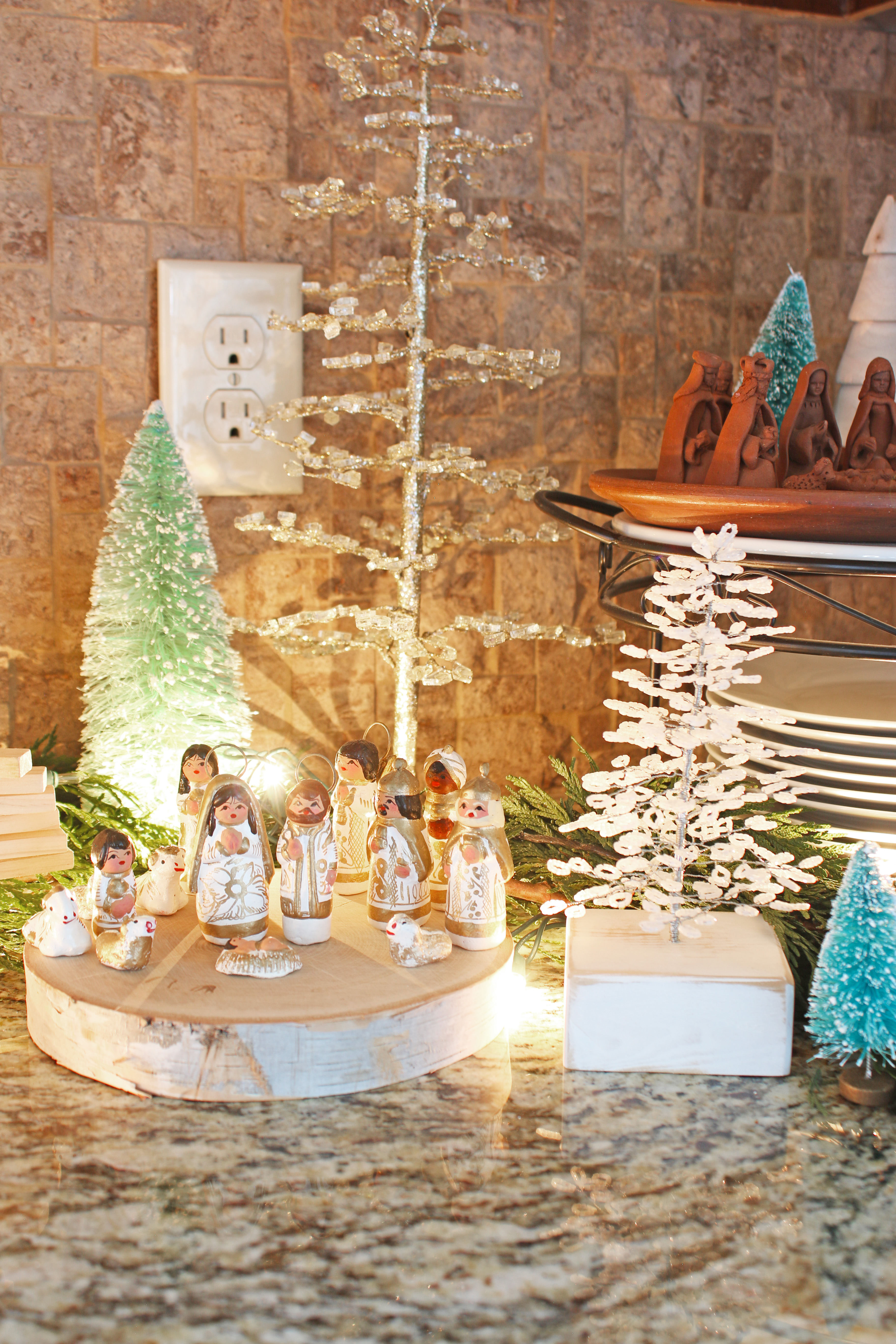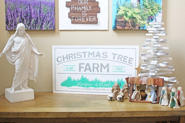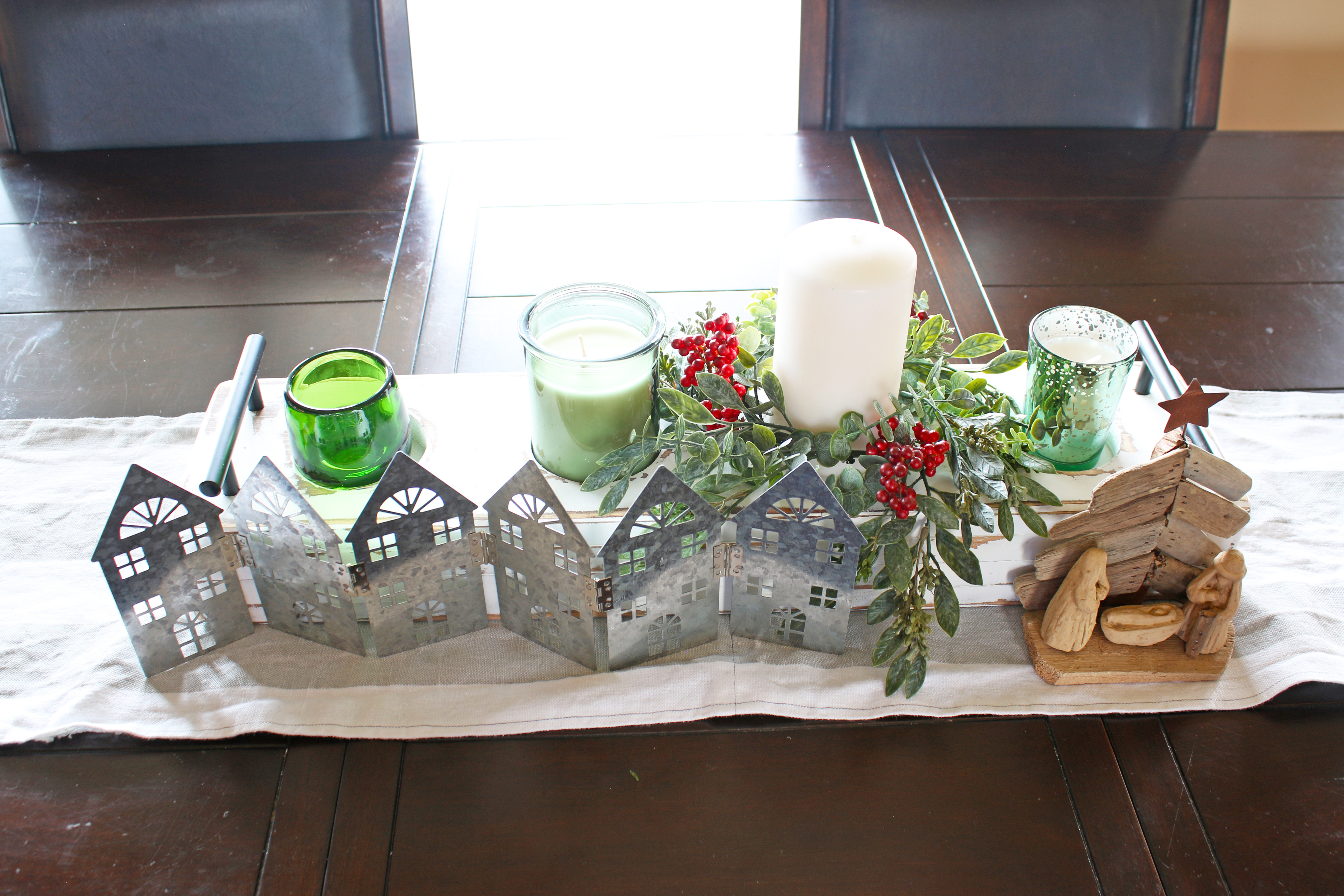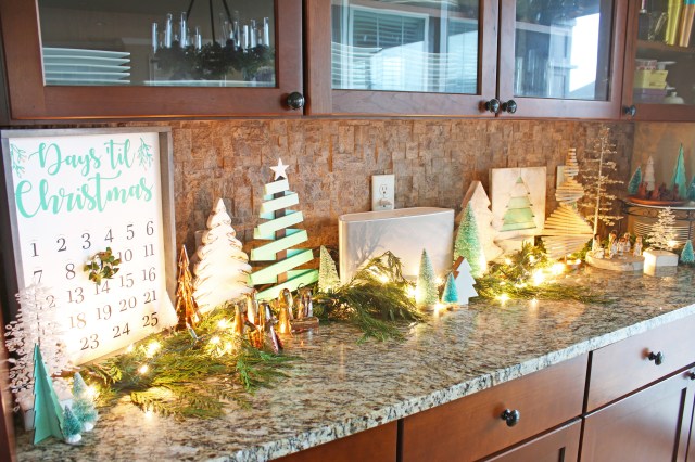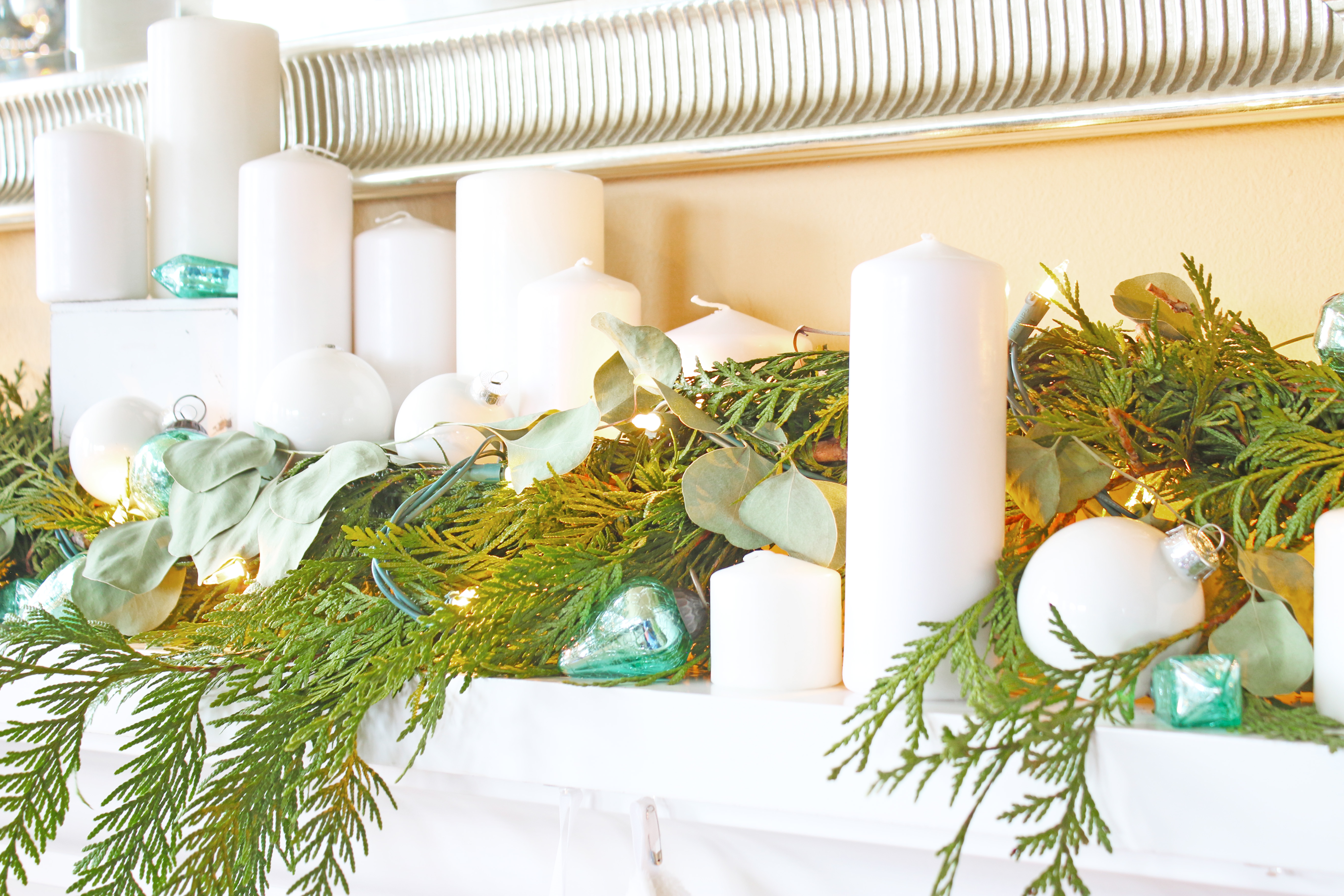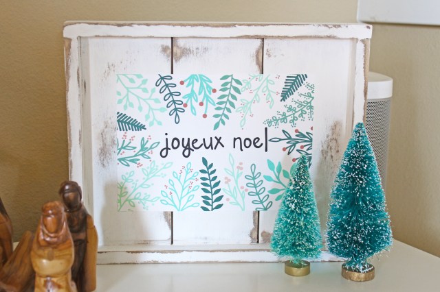 My favorite new addition this year is the days til Christmas advent calendar that I made at my annual girls craft weekend.  This year I figured out how to make a vinyl template to paint over instead of doing all the painting by hand, and it turned out so nice.  One of my friends almost felt like it was too nice, she wanted it to make sure it looked homemade and not store bought.  And of course my other favorite new addition this year is the Joyeux Noel print!  I decided to pull out the “broken” glass ornaments from the St. Patrick’s decorations and use them on the mantle with just some simple garland and candles.  It feels very french to me, so of course I love that.  And of course I love the 2 new ornaments that I bought from Magnolia.