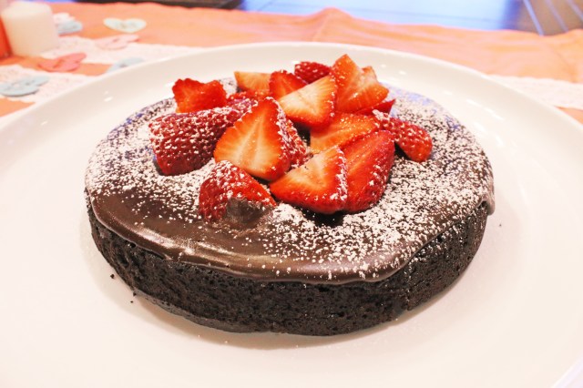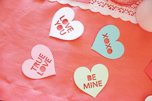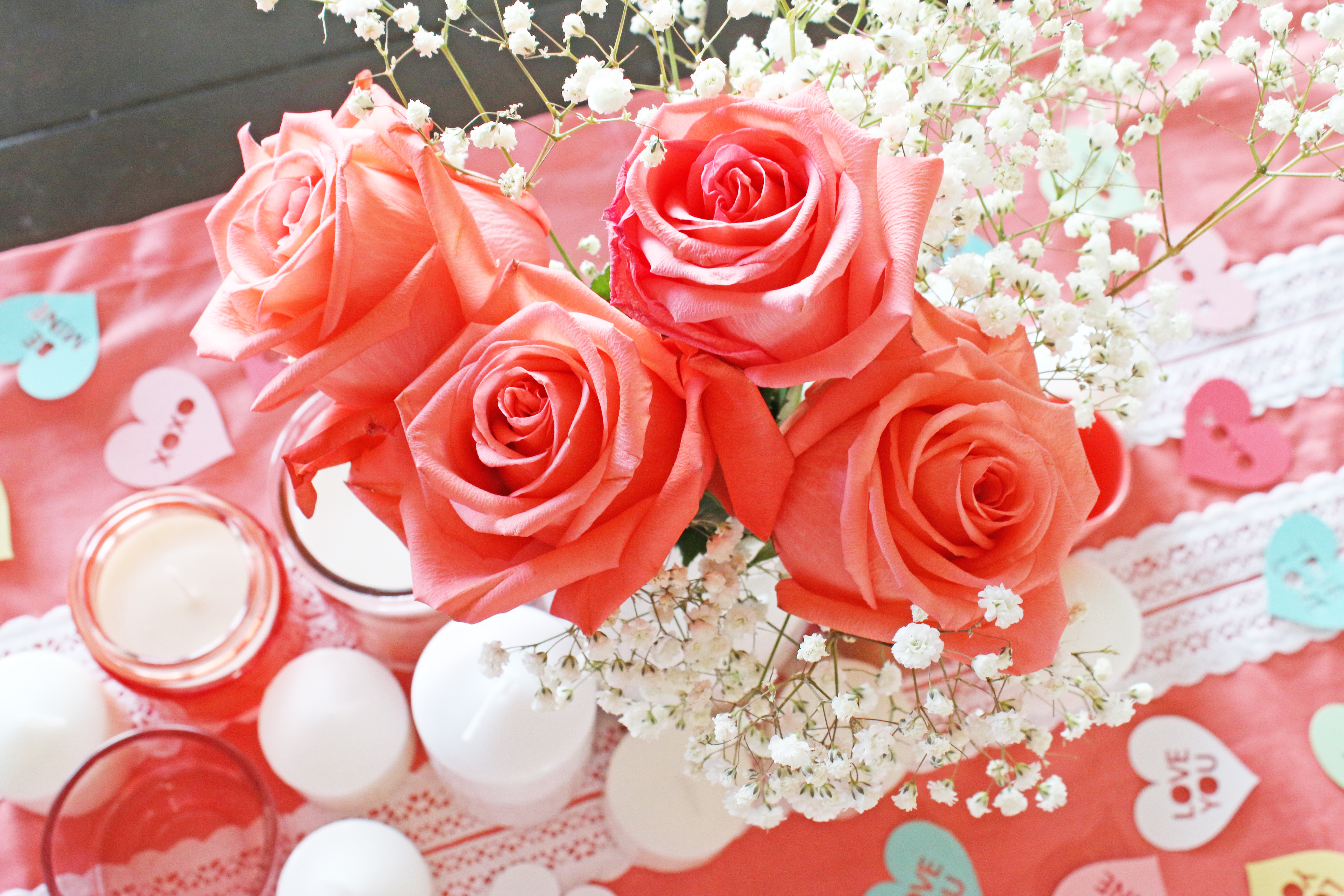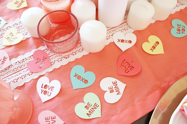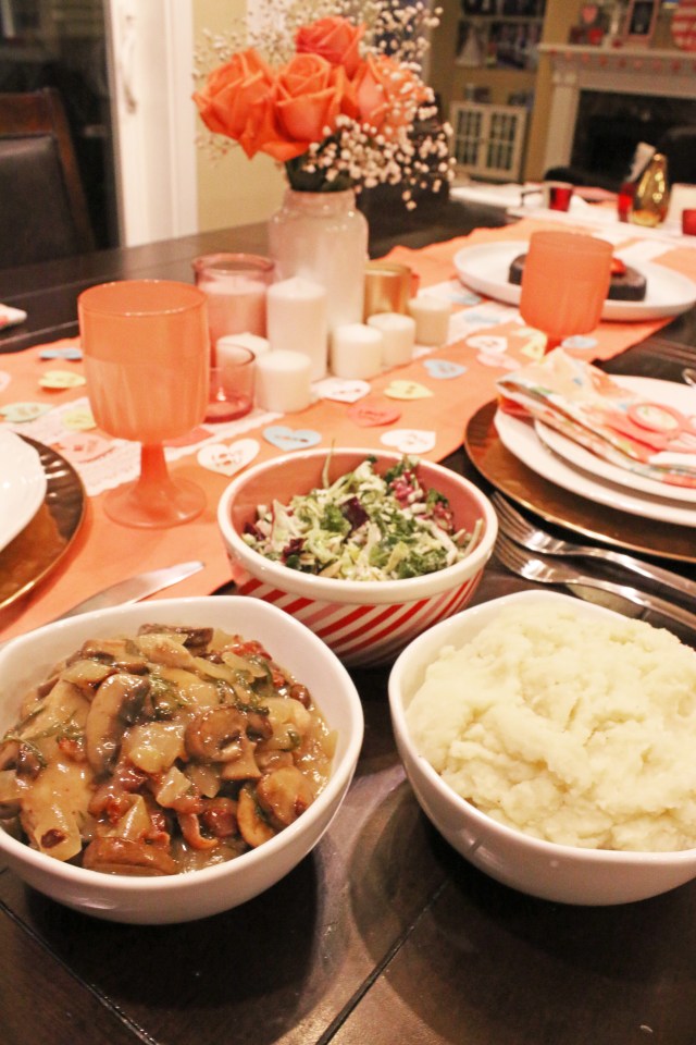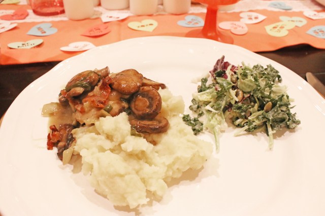 Last minute on Friday afternoon I decided to decorate the table. I was sooo excited to finally use these coral watercolor floral napkins that I made using fabric from Spoonflower. I love this pattern so much! Then I just cut out a few paper decorations with my Silhouette, some LOVE signs and conversation hearts in colors coordinating with the napkins. I made a saucy french chicken over mashed potatoes, a salad, and a flour-less chocolate cake. I liked it all, but Vu, who is not a big dessert person anyway, doesn’t really like dense cake and that cake is definitely dense.