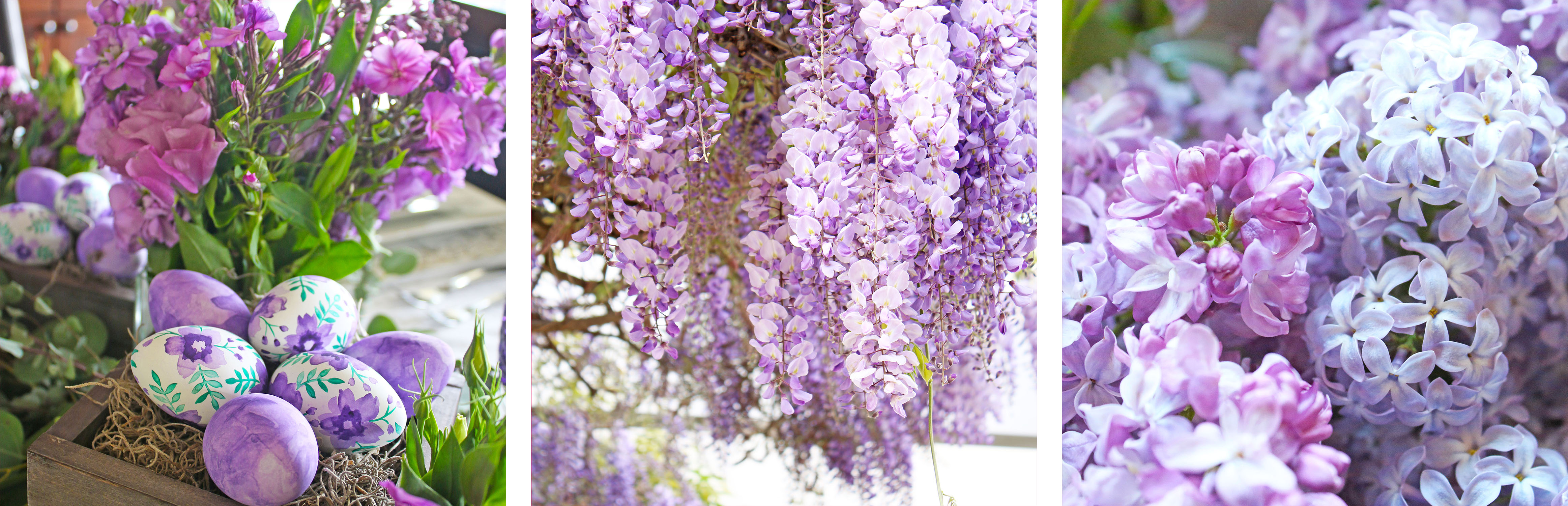 Purple: Easter dinner flowers and hand painted watercolor eggs, wisteria I found in San Fransisco, remembering the different varieties of lilacs a couple of friends gave me last year while I anticipated them blooming this year.