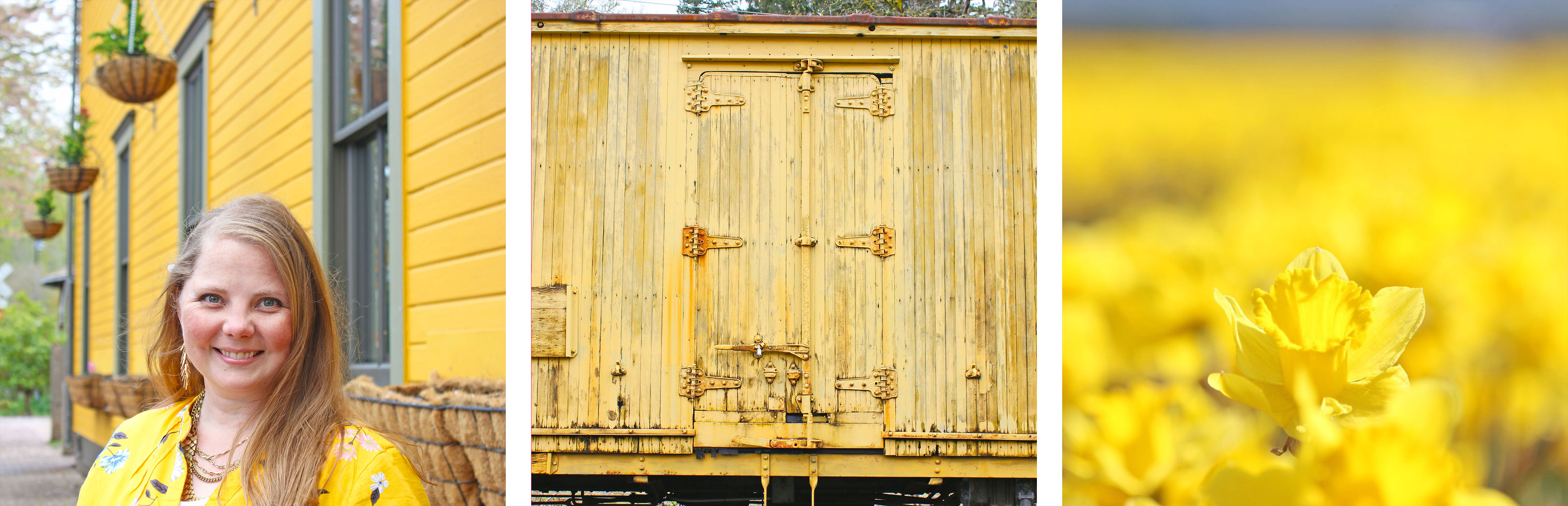 Yellow: cool building with flower pots in downtown Snoqualmie, some interesting train doors also in Historic Snoqualmie, daffodils at the Skagit Valley Tulip Festival.