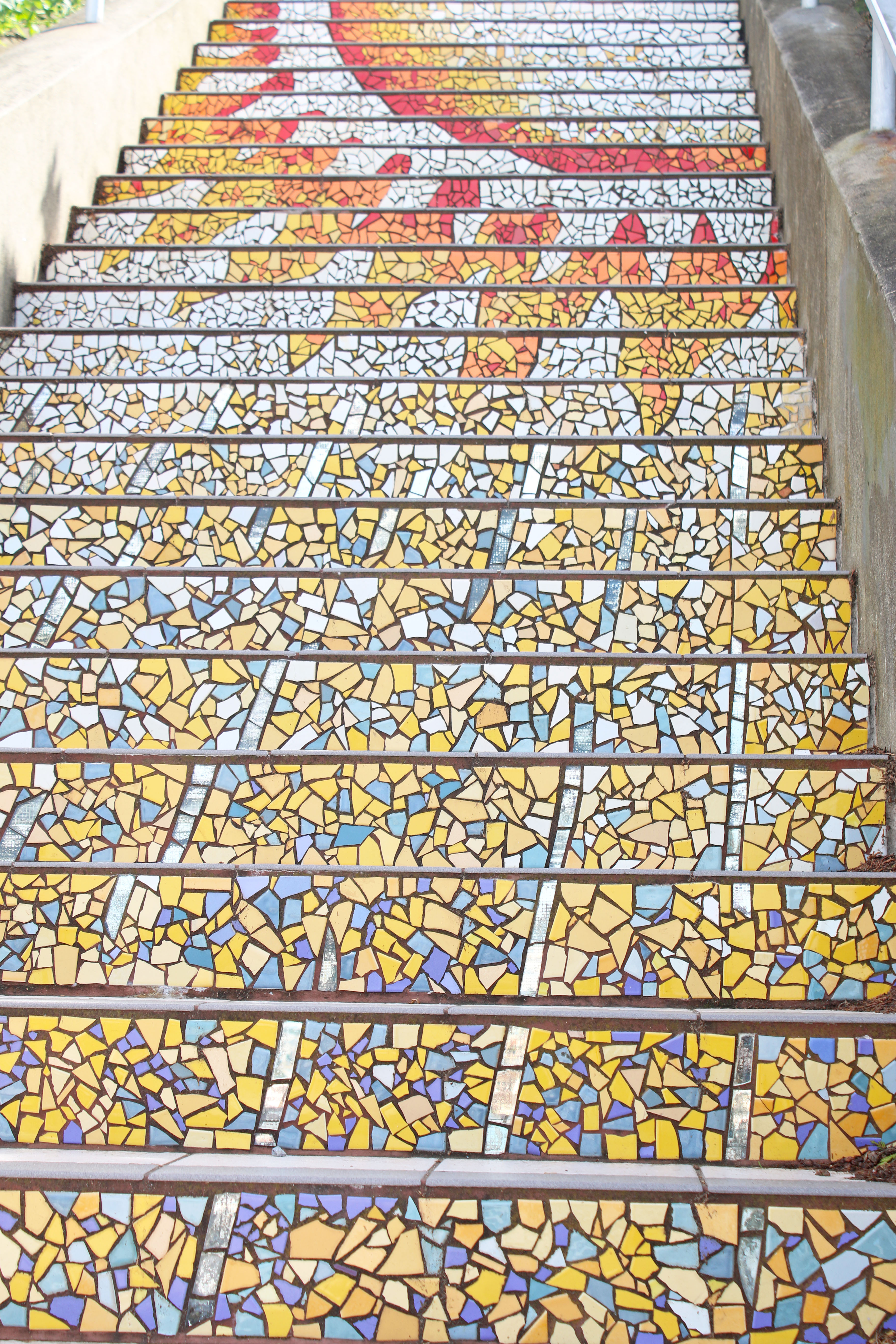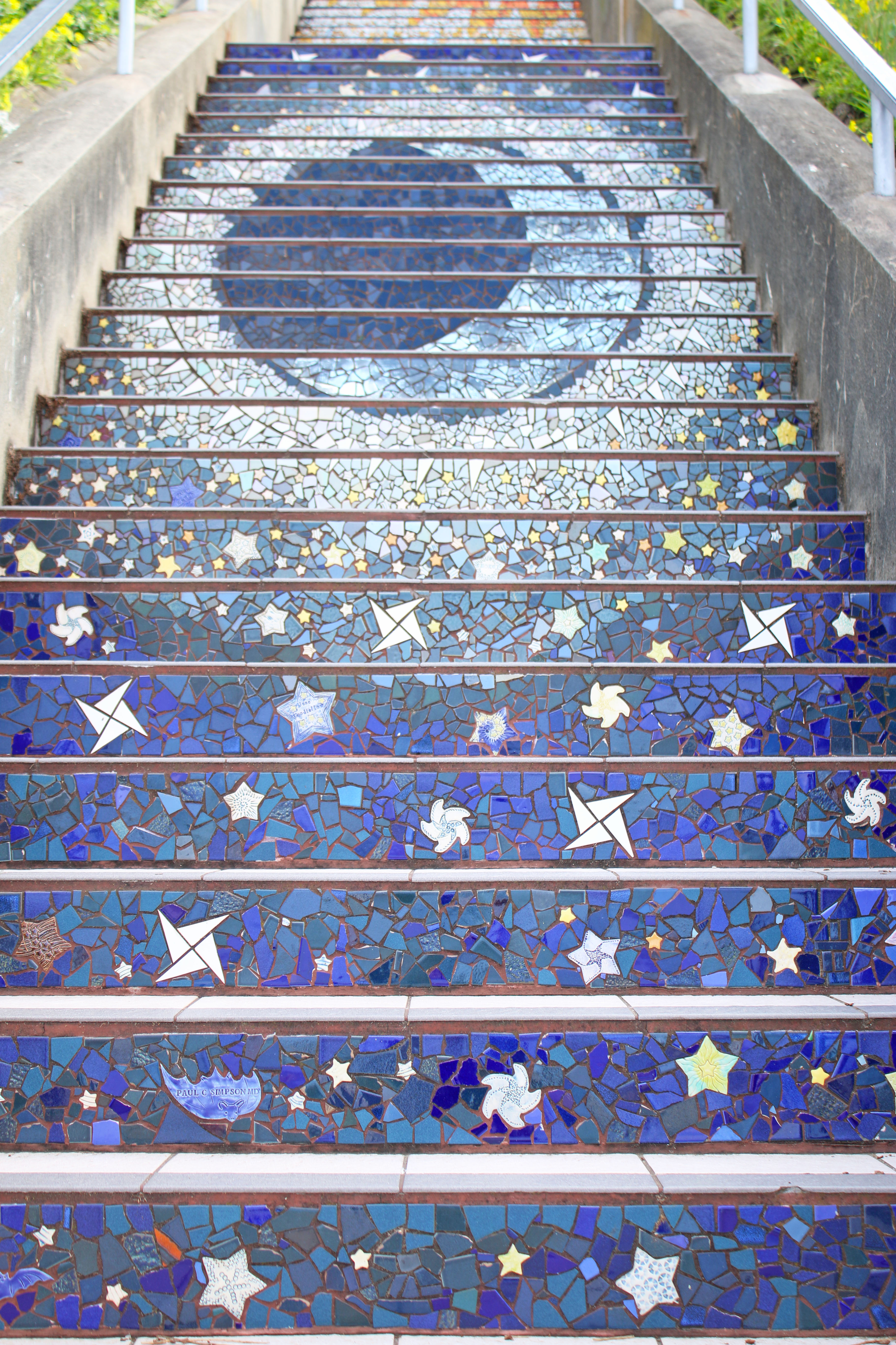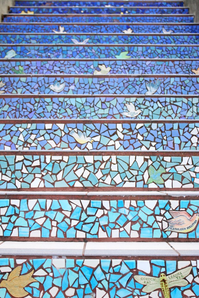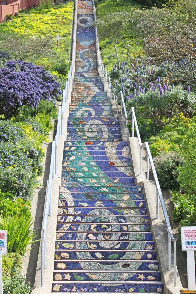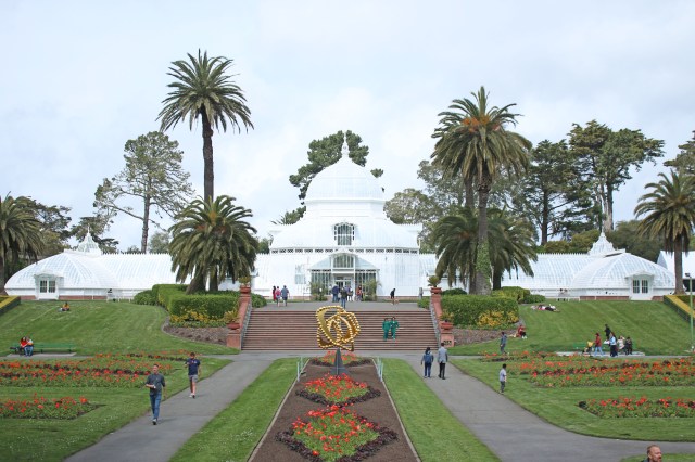 After my wanderings, I took another Uber to the 116th Ave Tiled steps. They are leading up to Grand View park which is on a hill, so I started out climbing to the top of the park for yet another spot of great city scape views, and I loved the hillside below filled with all the yellow wildflowers. Then I went down the steps, and I was really glad I started at the top… they are just some neighborhood steps, and the locals all got together and paid for the mosaics and you can see their names on some of the tiles. The whole thing was so beautiful, I loved how it started with the fish in a river and works it’s way up through a garden and mountains and the sky and the stars and moon and sun. There were so many cute details. I had to wait about 20 minutes to try and get a picture without anyone on them, and got really close to giving up, but am so glad I didn’t. After getting my fill of the steps I walked down the hill to the Golden Gate Park and went to the Conservatory of the flowers. I loved the greenhouse architecture too, I thought it was so pretty.