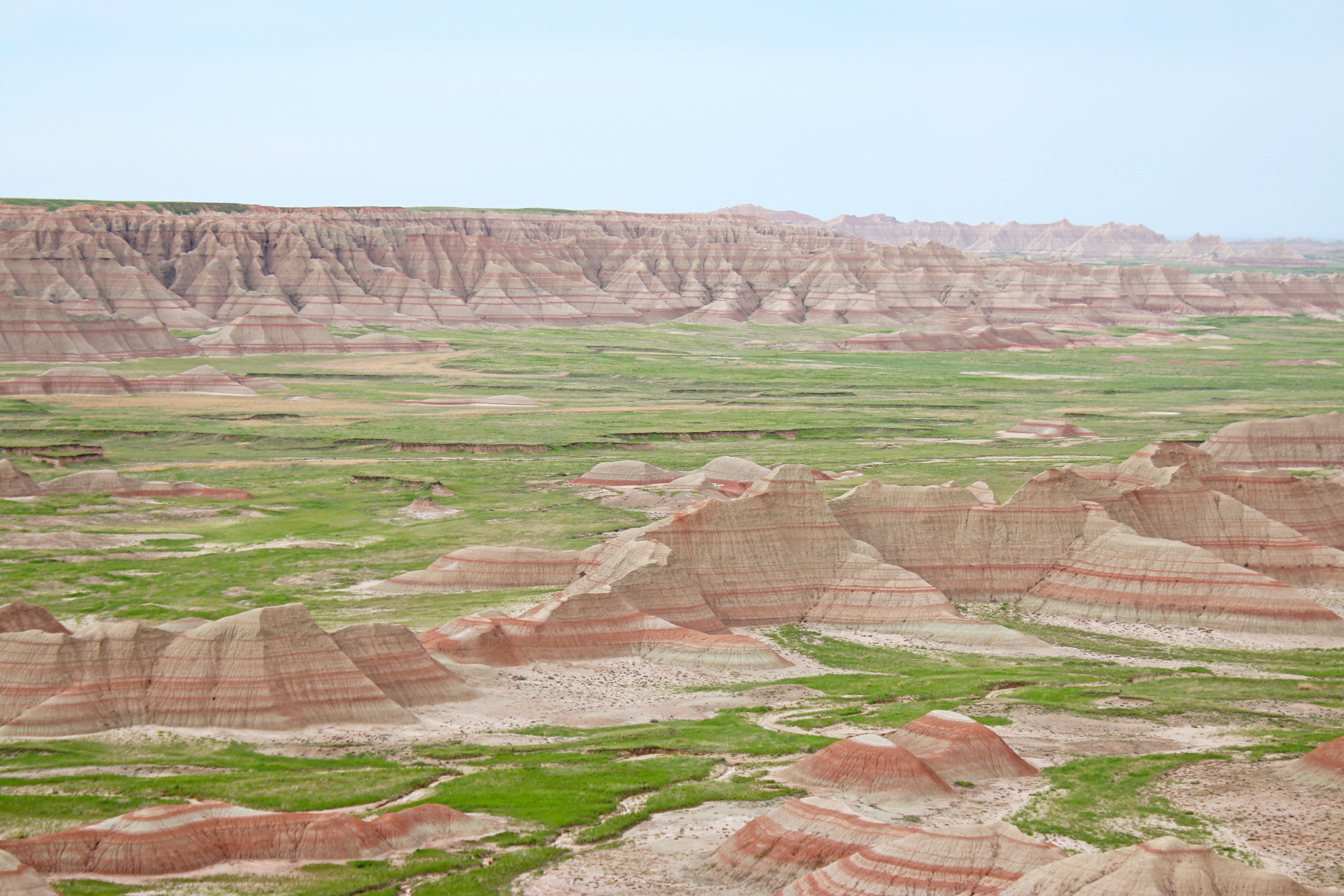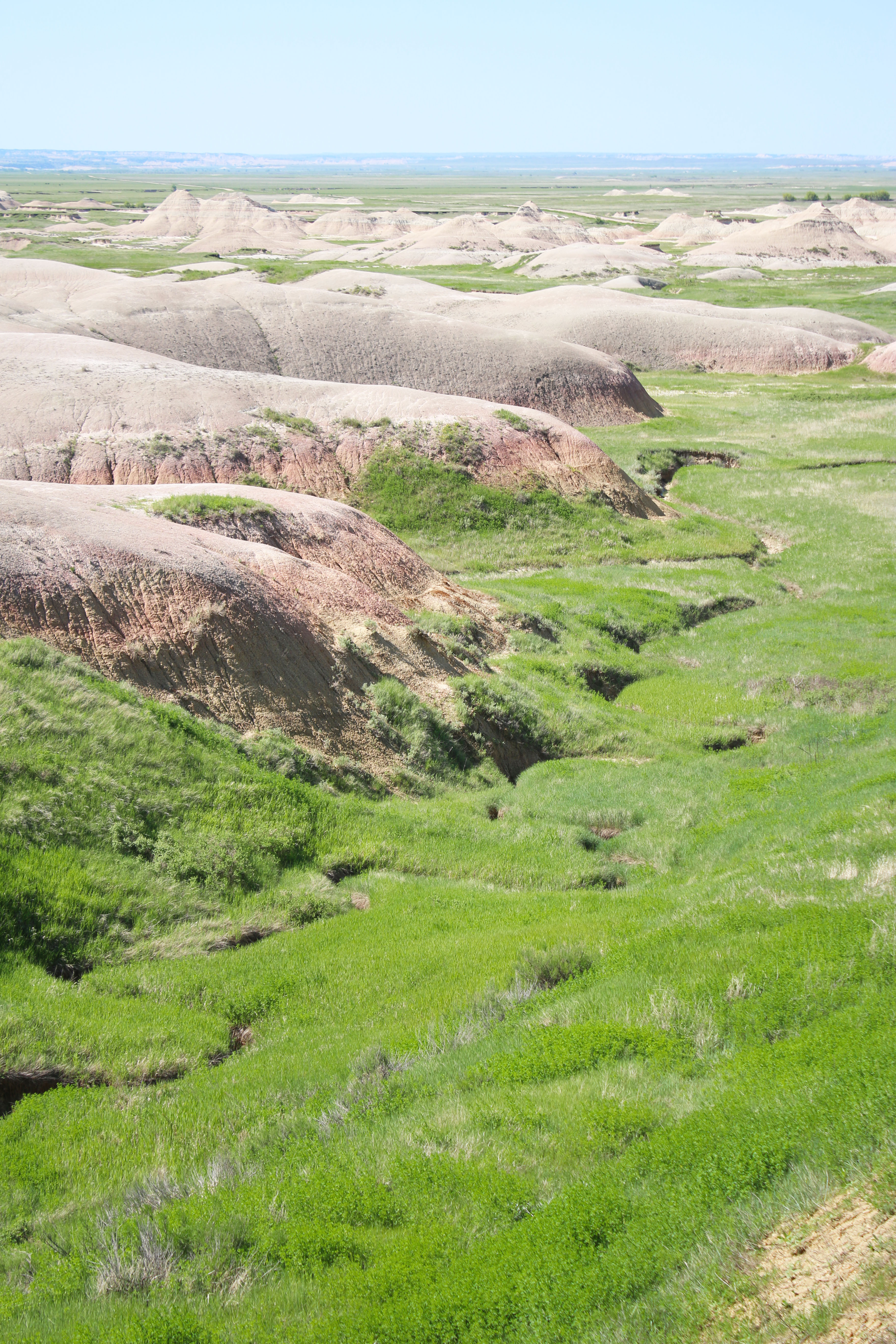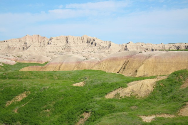 As Rachel and I continued our cross country drive from Boston, we got to the Badlands National Park in South Dakota on Sunday afternoon, June 2nd. We set up out campsite, and watched the sunset which was a really good one. On Monday morning we unintentionally got a very early start and were packed up and out of the campsite by 7:30. We drove through the rest of the park stopping at a bunch of view points along the way. We came across a huge field of prairie dogs that we watched all scrambling around and hopping up and down. My favorite part was by the yellow mounds, the stream meandering through with the green grasses growing around it, I love that!