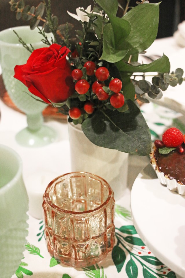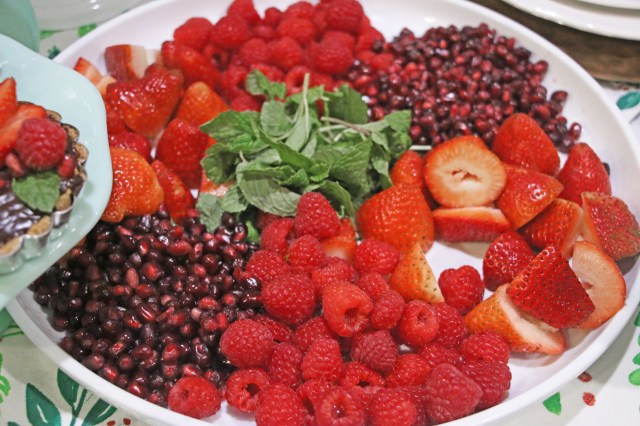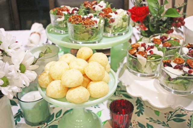 Since we were gone for Christmas this year, we had a late Christmas dinner with Vu’s family after we got back, in the new year. We invited my parents and sister to come as well. I found these adorable Christmas greenery appetizer plates at the dollar spot in Target last year, but my store only had a few so I asked my mom to look for them at her store and she ended up scouring multiple Target’s at multiple times to get a whole bunch of them for me (thank you Mom!). I used them for the theme for the rest of the table. Other than those plates, I didn’t have a plan at all (even the menu) until 2:00 pm the day of… that is very unusual for me, but I had been sick all week…. so I did have have a plan for a menu and name cards (after my 2:00 brainstorming session), but I just didn’t have time to get to them. On the menu we had: cranberry rosemary chicken (I really enjoyed this), rosemary smash potatoes (that I make all the time), my mom’s pomegranate pear salad, some Brazilian cheese bread (from the frozen section at Costco that you just bake, so easy and so good), an assortment of red fruits, lime pomegranate juice (another previous favorite), and some chocolate tarts that looked super cute but were just ok.