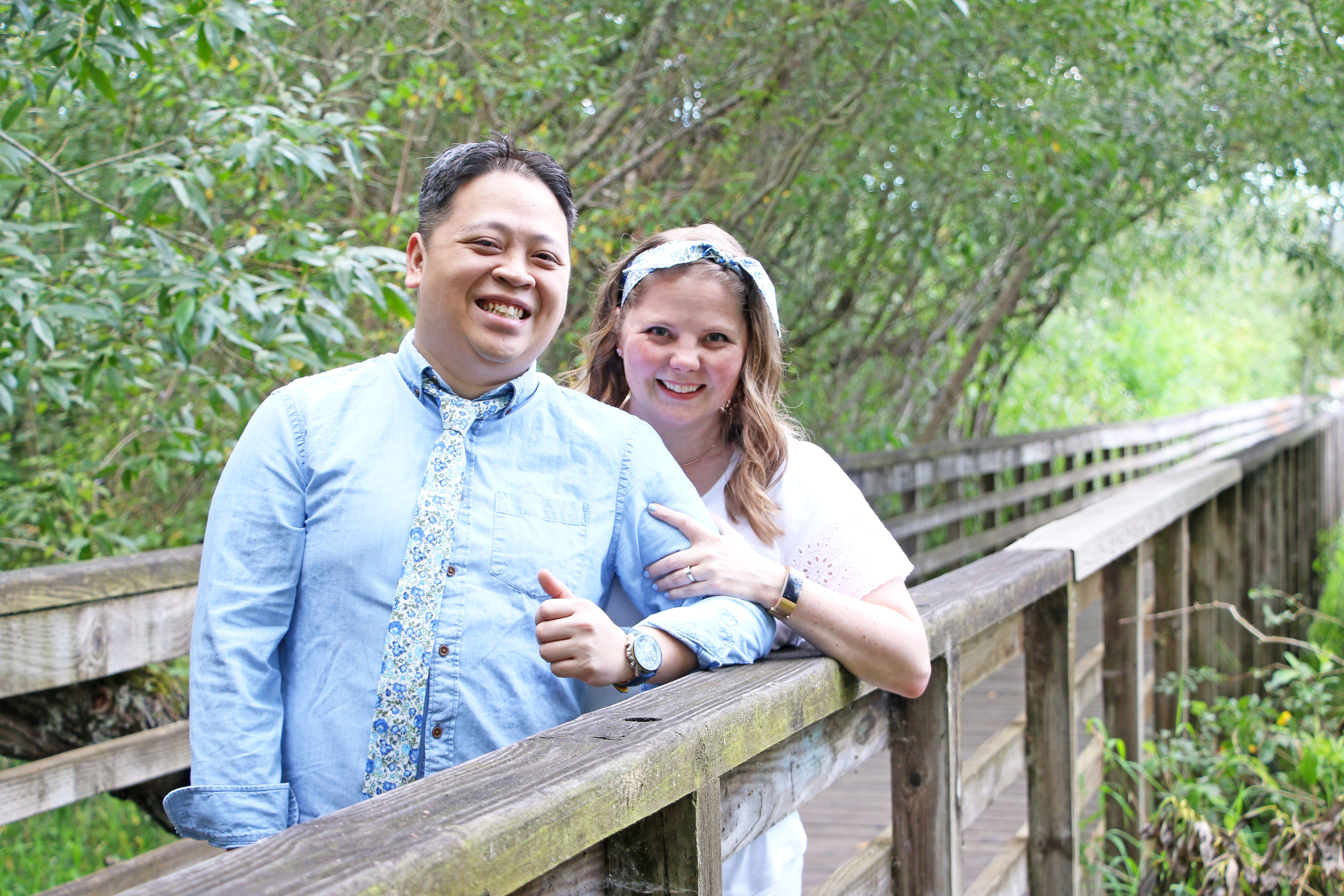 The day we planned to take our annual anniversary pictures, it rained and was cloudy in the morning and early afternoon, so it was nice and cool for our pictures. Two years in a row our picture day had lower temps for August. I loved it! The one draw back is that the light wasn’t as pretty as it often is filtering in through these trees. I found this sparkler 8 candle, so I decided to make a cake with flowers in our traditional cobalt blue to go with it for our number prop. It was definitely the most challenging prop I have done so far: making the cake, transporting it to the park and then putting it on the cake stand before the pictures and carrying it around for the rest of the pictures… It was fun! 😂. I don’t make cake very often, so I am not very good at frosting and the flowers didn’t turn out at all how I had hoped… but all things considered it could have been much worse. I love the cobalt cake stand I found. One more to add to my collection. 🙂 I found these matching blue floral tie and hair tie from Frank and Buck, which I love so much. They got delivered just in time for our pictures. I was really happy that the Washington parks opened up (with social distancing) before our anniversary so we could still take them at this beautiful park that I love so much. My sister Rachel took the pictures for us again, and she said that she forgot how much she also loves this park.