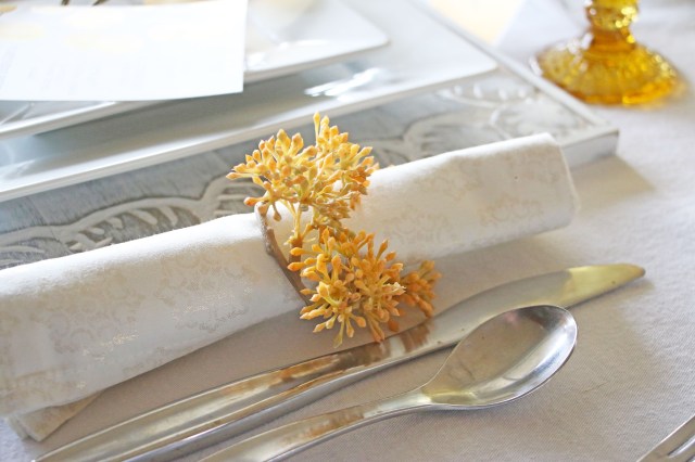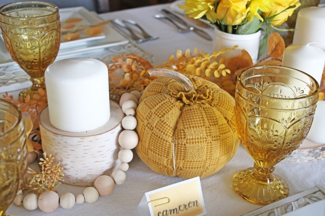 My brother and Sister in law were here visiting in the fall, so while they were here I hosted another Birthday dinner party for my Sister in law. I wanted to use the yellow botanical napkin rings that I got last year at Target from Hearth and Hand, so I decided to go with a yellow botanical theme. I have been wanting to try this vellum eucalyptus tutorial so I thought it was the perfect time to use them. I love how they turned out. It was the perfect way to use my favorite botanical in the color scheme I was going for. After that I pulled out a bunch of my faux yellow botanicals (which are mostly from Hearth and Hand…. ) to create a garland along the center of the table. I added in some birchwood rounds and candles, a natural wood bead garland and my yellow fabric pumpkins from Details 2 Enjoy. I was originally going to make enough of the eucalyptus to use in the vases and garland, but they took more time than I anticipated so I stopped after I had enough for one on each place setting. For the menus, I painted some watercolor yellow eucalyptus and scanned them into clip art. For the name cards I used the same gold vellum I had for the eucalyptus and hand lettered each name and paper clipped them to some white cardstock.